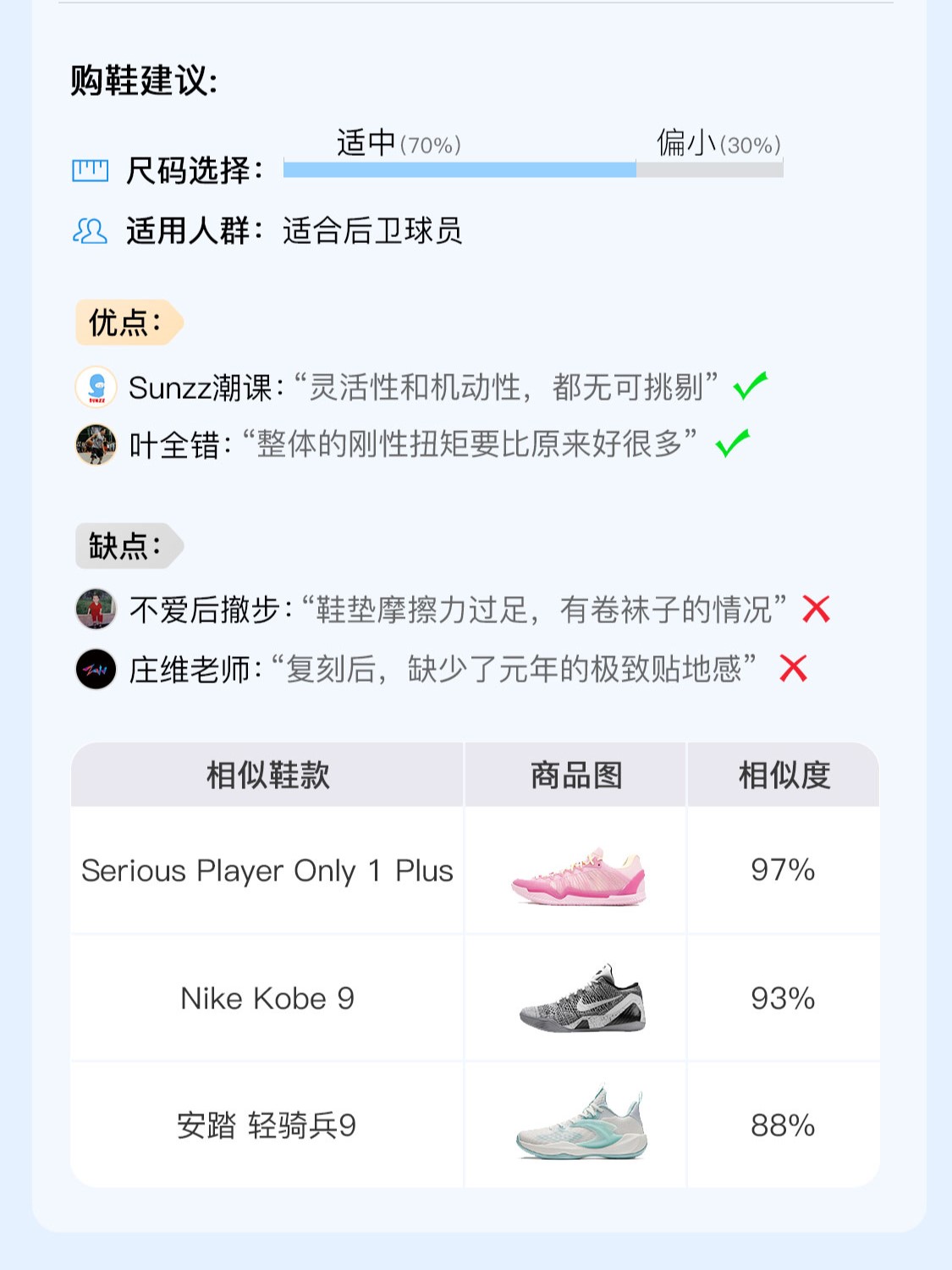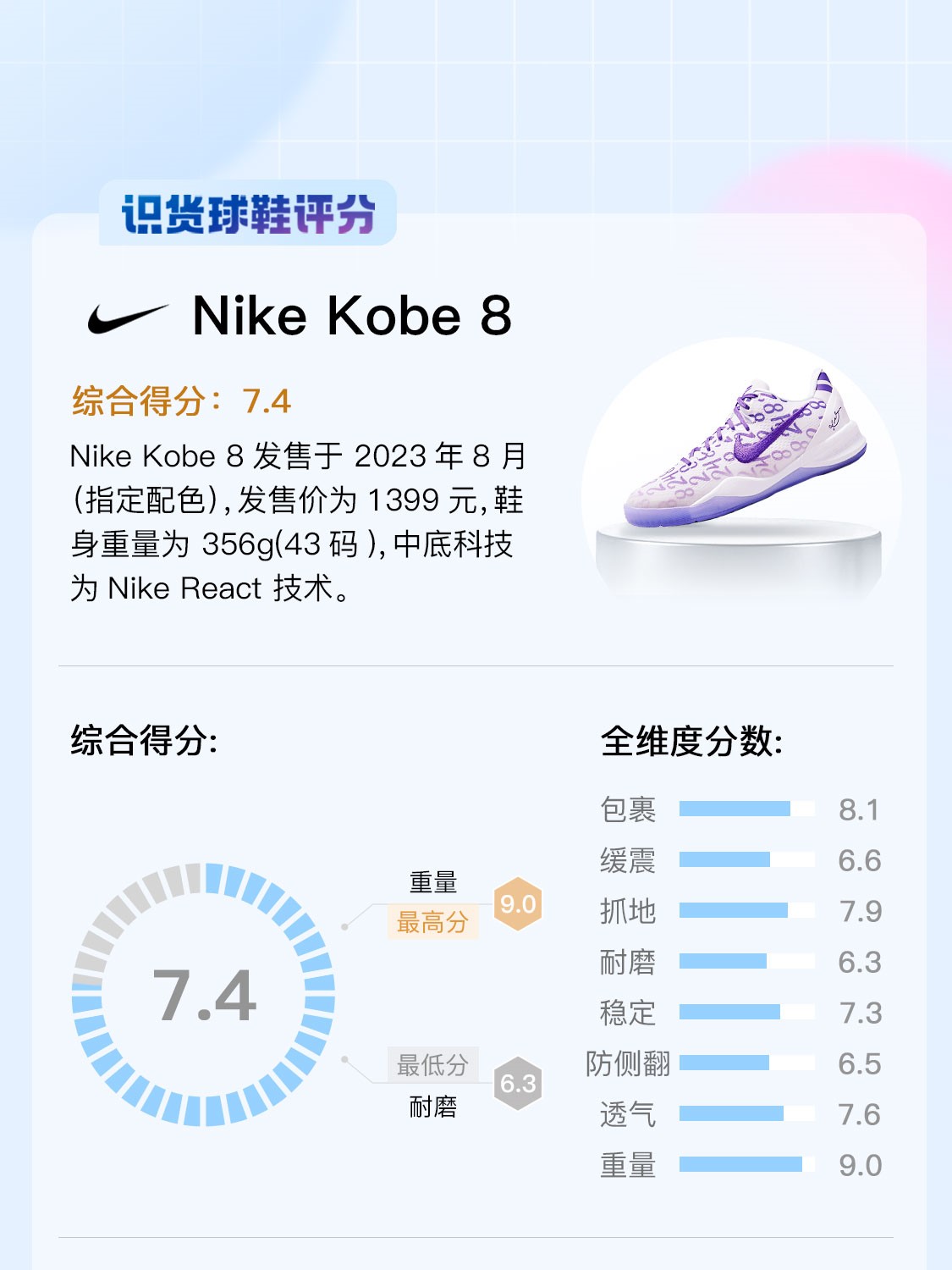 Nike Kobe 8 综合得分:7.4分 Nike Kobe 8发售于 2023年8月(指定配色),发售价为1399元,鞋身重量为 356g(43码),中底科技为Nike React 技术。 达人评价 优点: 1,灵活性和机动性,都无可挑剔 2,整体的刚性扭矩要比原来好很多 缺点: 1,鞋垫摩擦力过足,有卷袜子的情况 2,复刻后,缺少了元年的极致贴地感 更多球鞋评分报告,请前往识货首页...