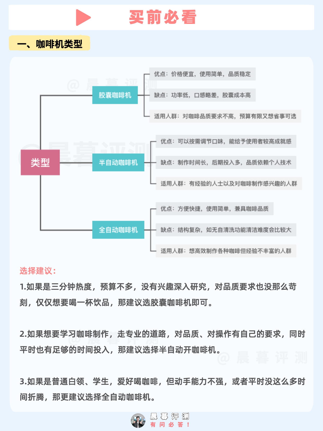 一、咖啡机类型选择建议 选择建议: 1.如果是三分钟热度,预算不多,没有兴趣深入研究,对品质要求也没那么苛刻,仅仅想要喝一杯饮品,那建议选胶囊咖啡机即可。 ~ 2.如果想要学习咖啡制作,走专业的道路,对品质、对操作有自己的要求,同时平时也有足够的时间和金钱投入,那建议选择半自动开咖啡机。 ~ 3.如果是普通的咖啡爱好者,对咖啡品质有要求,但不追求专业比赛级别,平时没这么多时间折腾,那更建议选择全自...