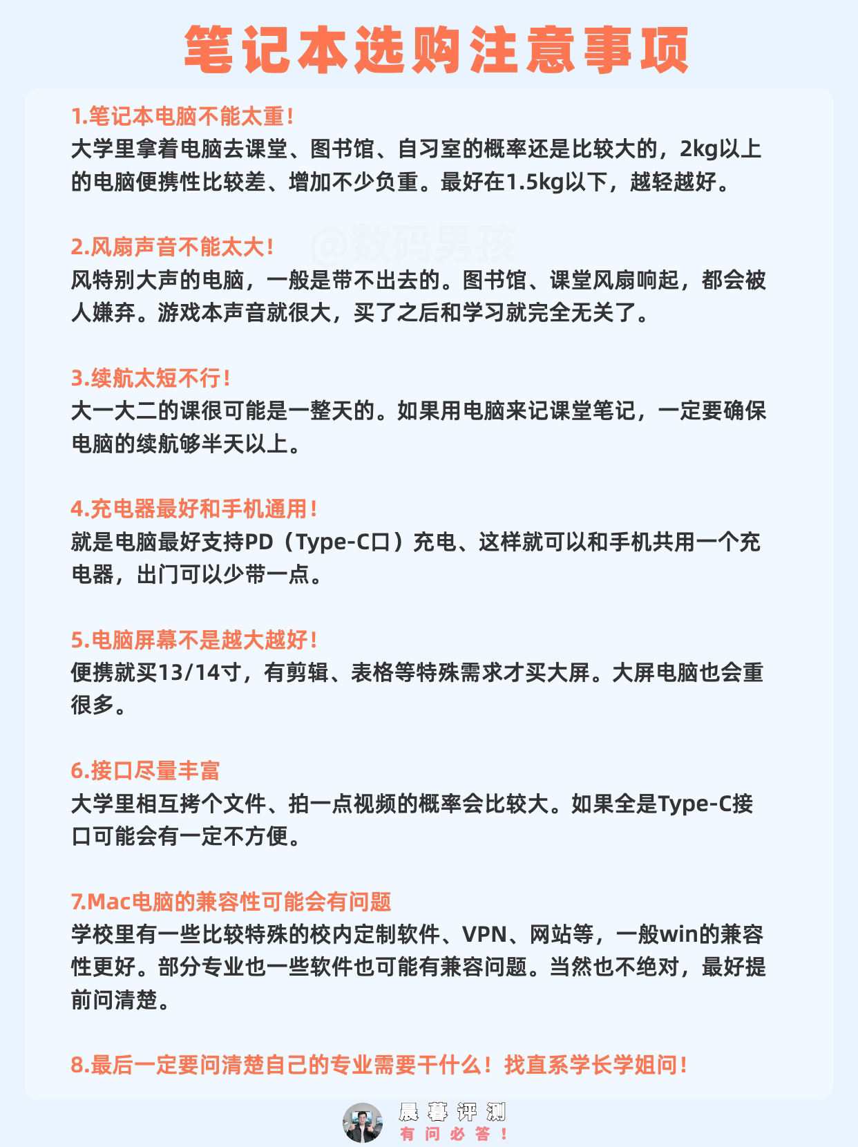 一、大学生笔记本选购 1.笔记本电脑不能太重! 大学里拿着电脑去课堂、图书馆、自习室的概率还是比较大的。最好在1.5kg以下,越轻越好。 ~ 2.风扇声音不能太大! 风特别大声的电脑,一般是带不出去的。图书馆、课堂风扇响起,都会被人嫌弃。 ~ 3.续航太短不行! 如果用电脑来记课堂笔记,一定要确保电脑的续航够半天以上。 ~ 4.PD充电器 就是电脑最好支持PD充电、这样就可以和手机共用一个充电器,...