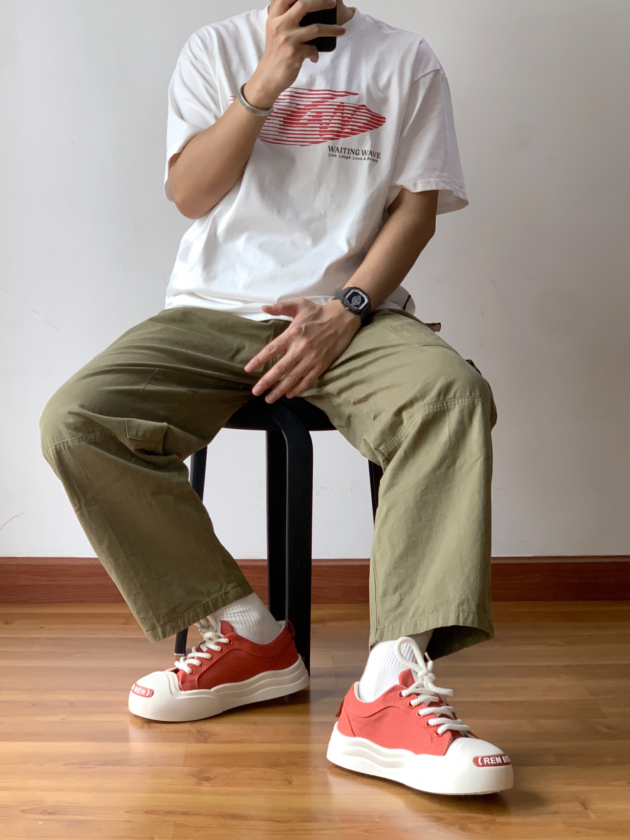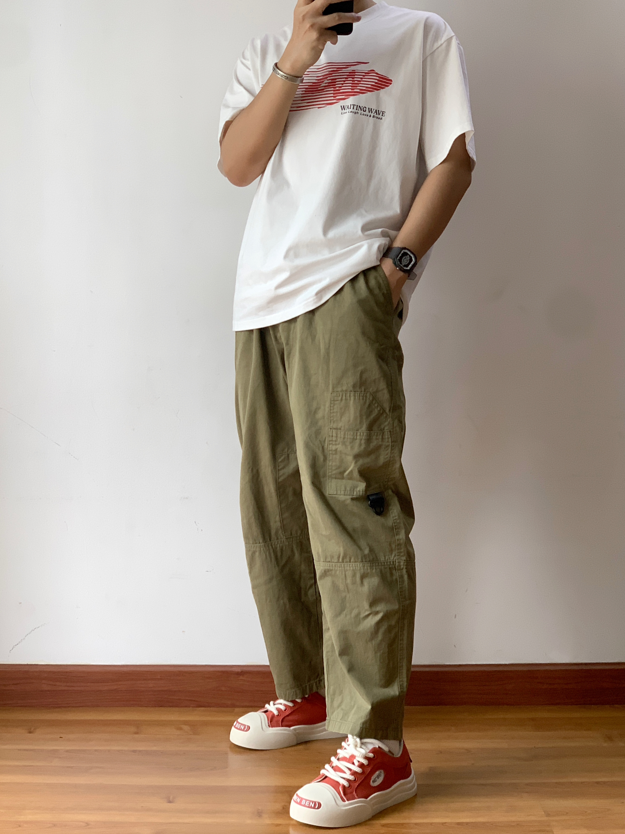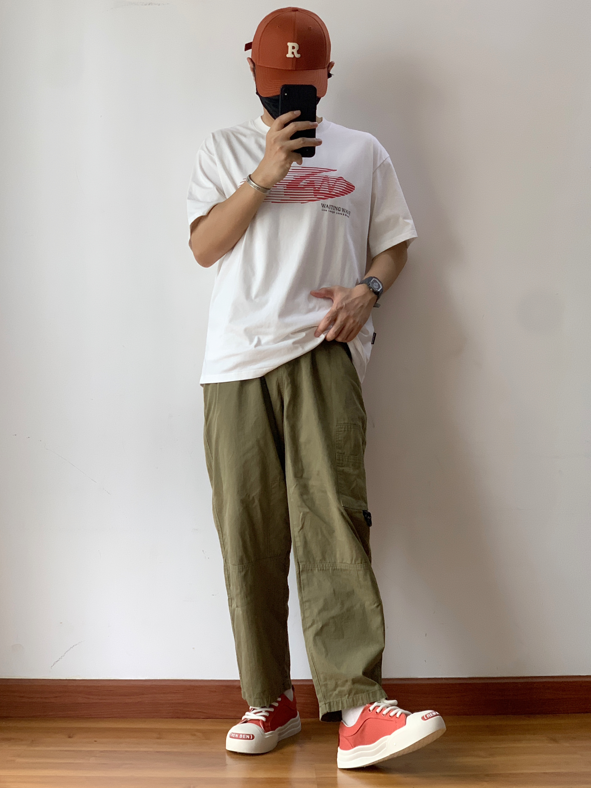 身高|体重:175/70 🧍♂️ 穿搭风格:夏日多巴胺穿搭 👔 上衣:美式休闲白T 👖 下装:军绿色工装裤 👟 鞋子:脏橘溶解鞋 ⌚ 配饰:夏日果冻表