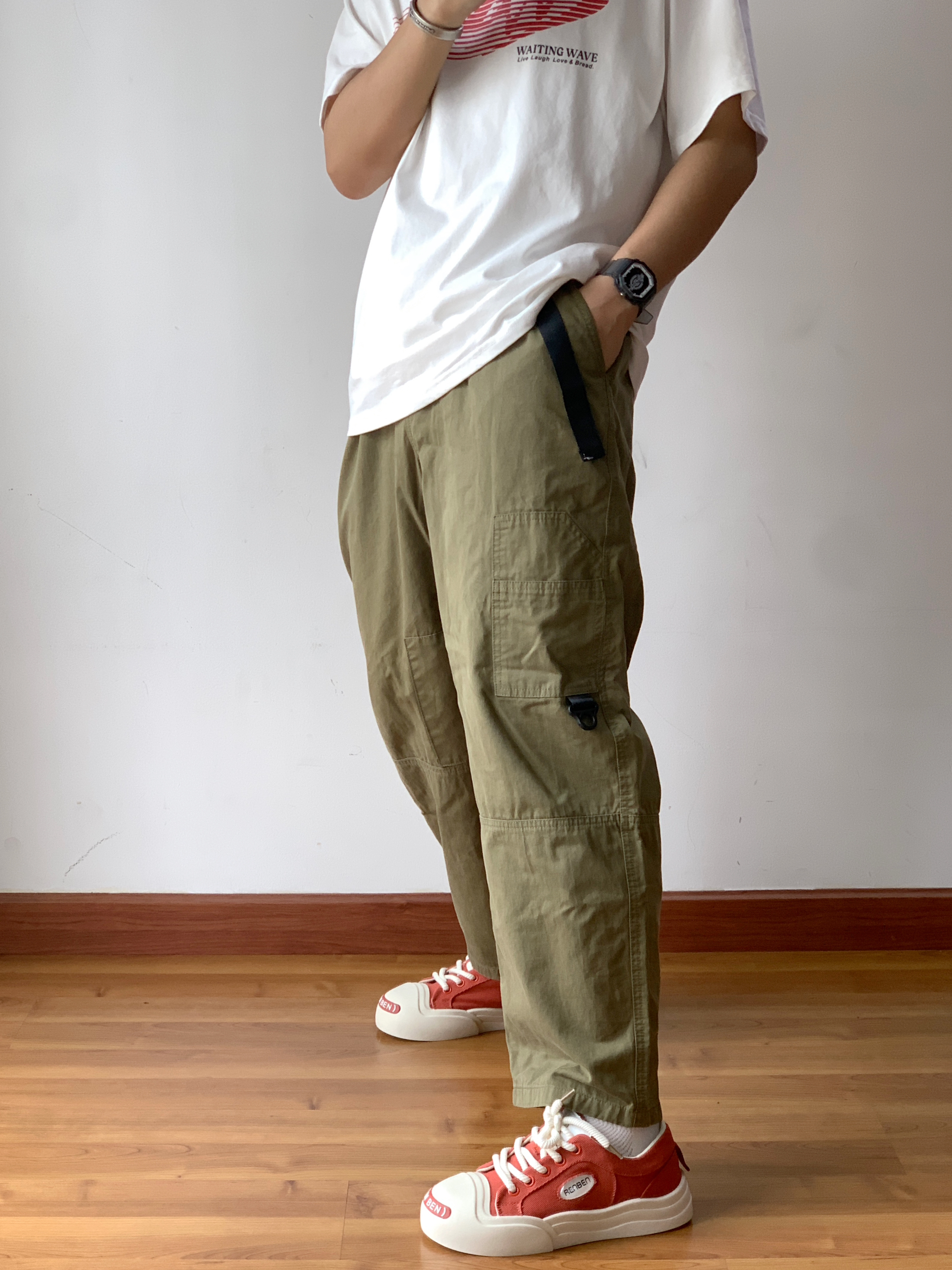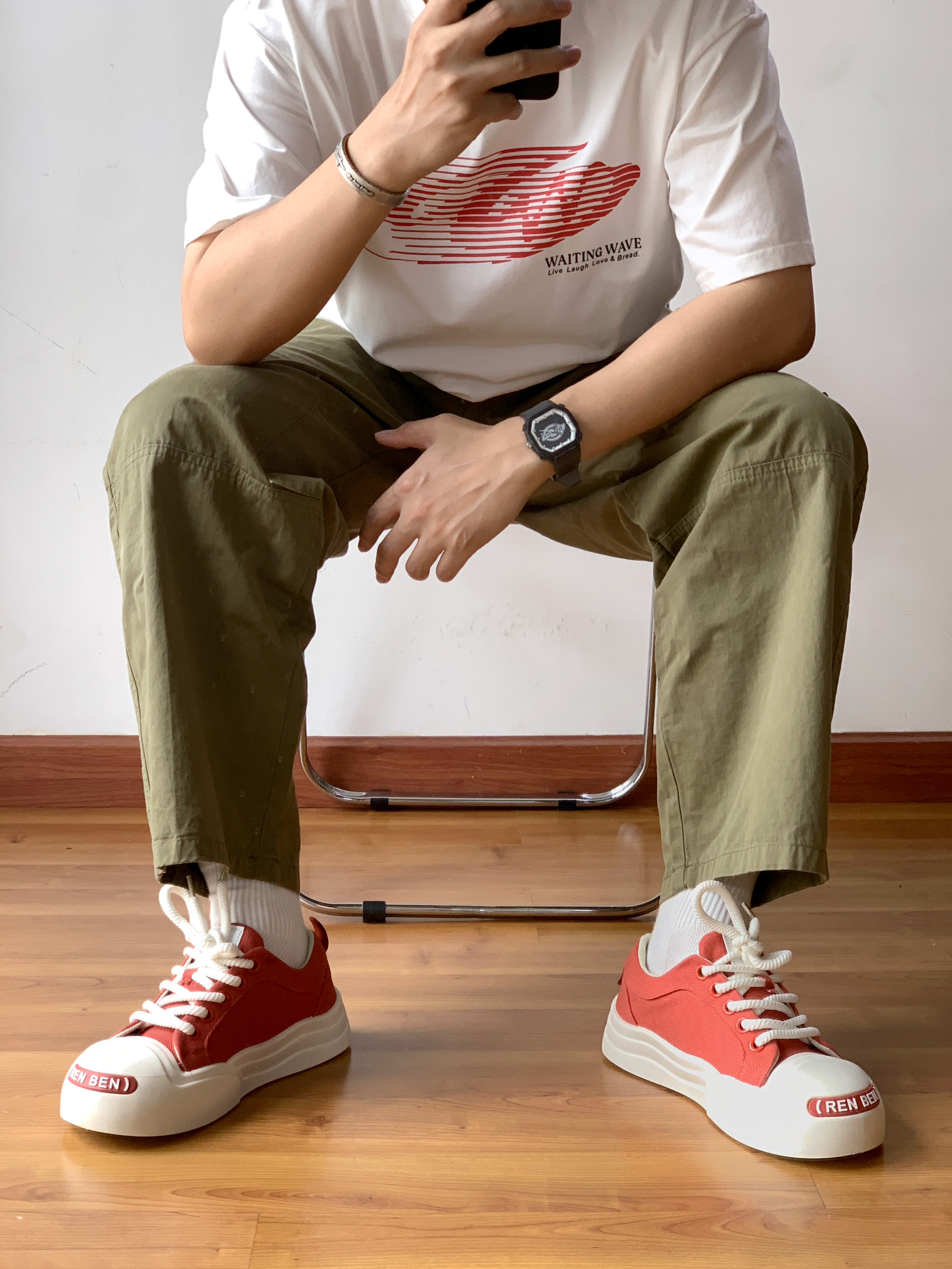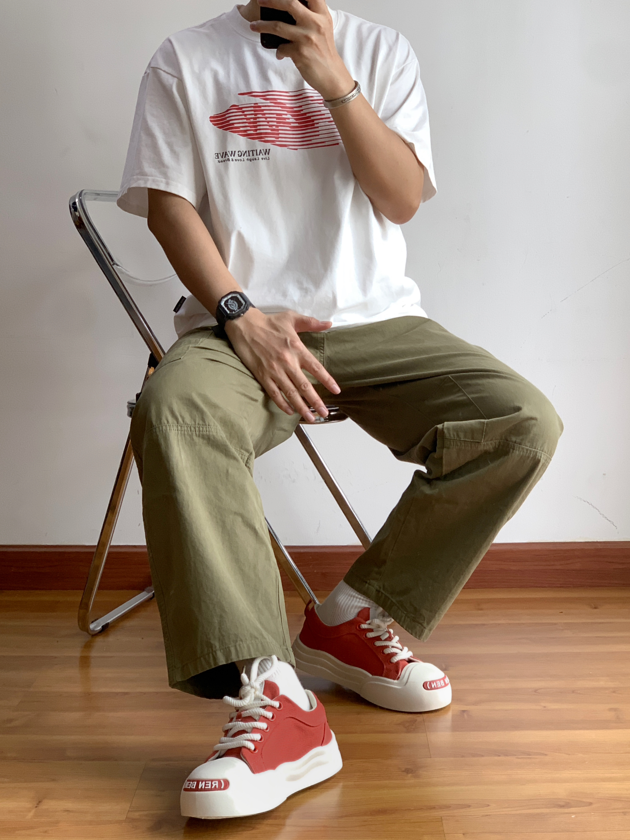 身高|体重:175/70 🧍♂️ 穿搭风格:夏日多巴胺穿搭 👔 上衣:美式休闲白T 👖 下装:军绿色工装裤 👟 鞋子:脏橘溶解鞋 ⌚ 配饰:夏日果冻表