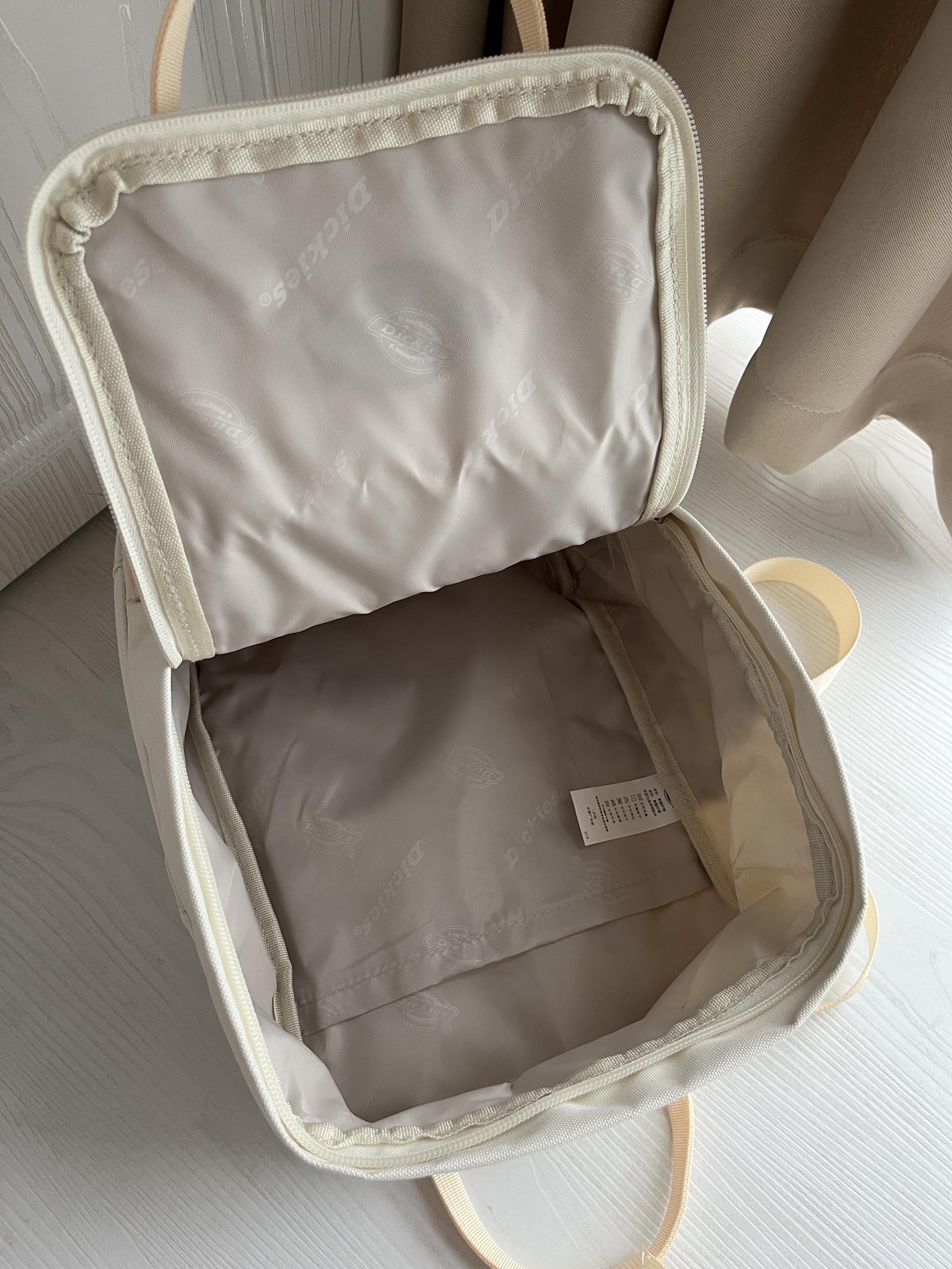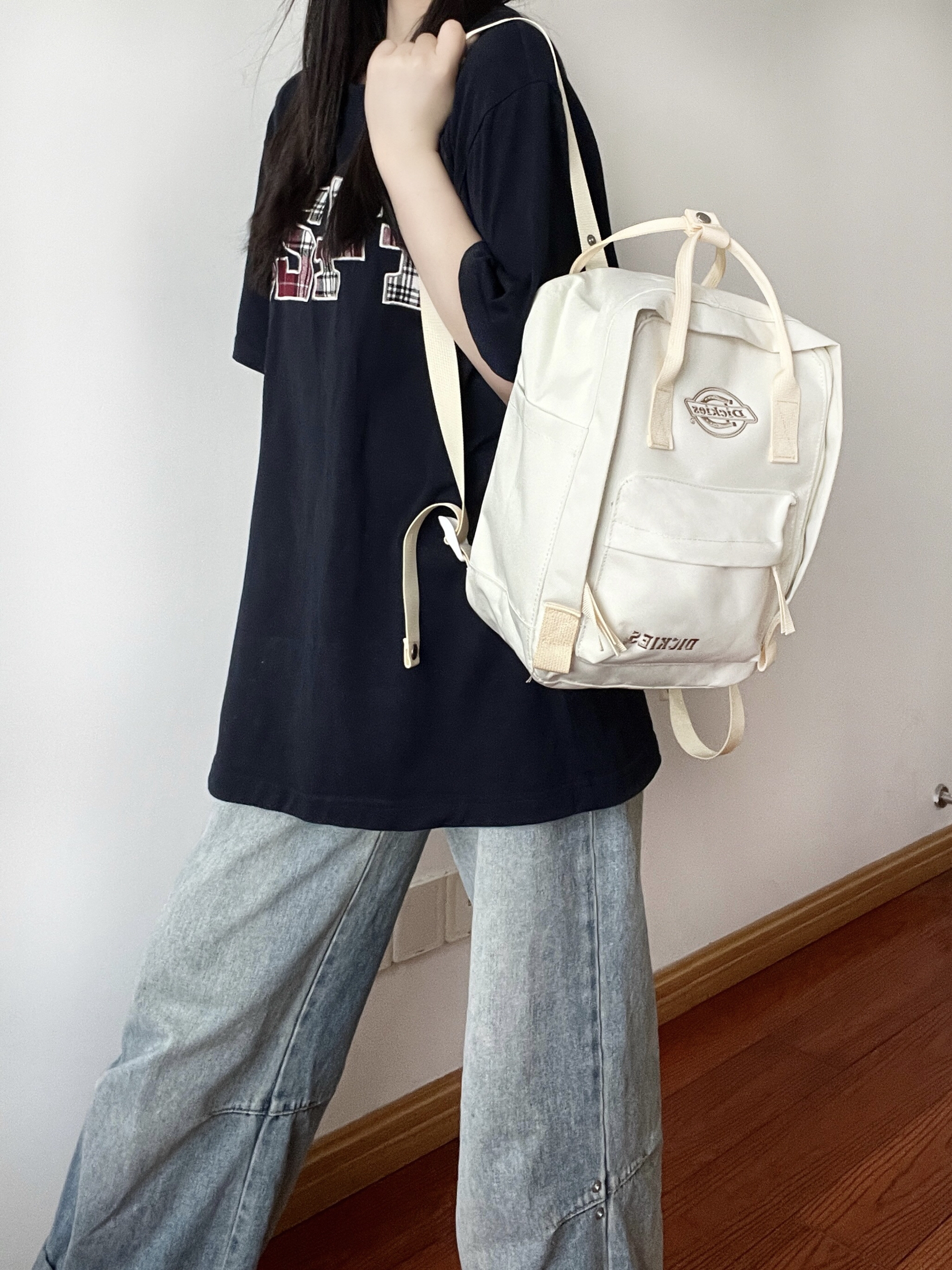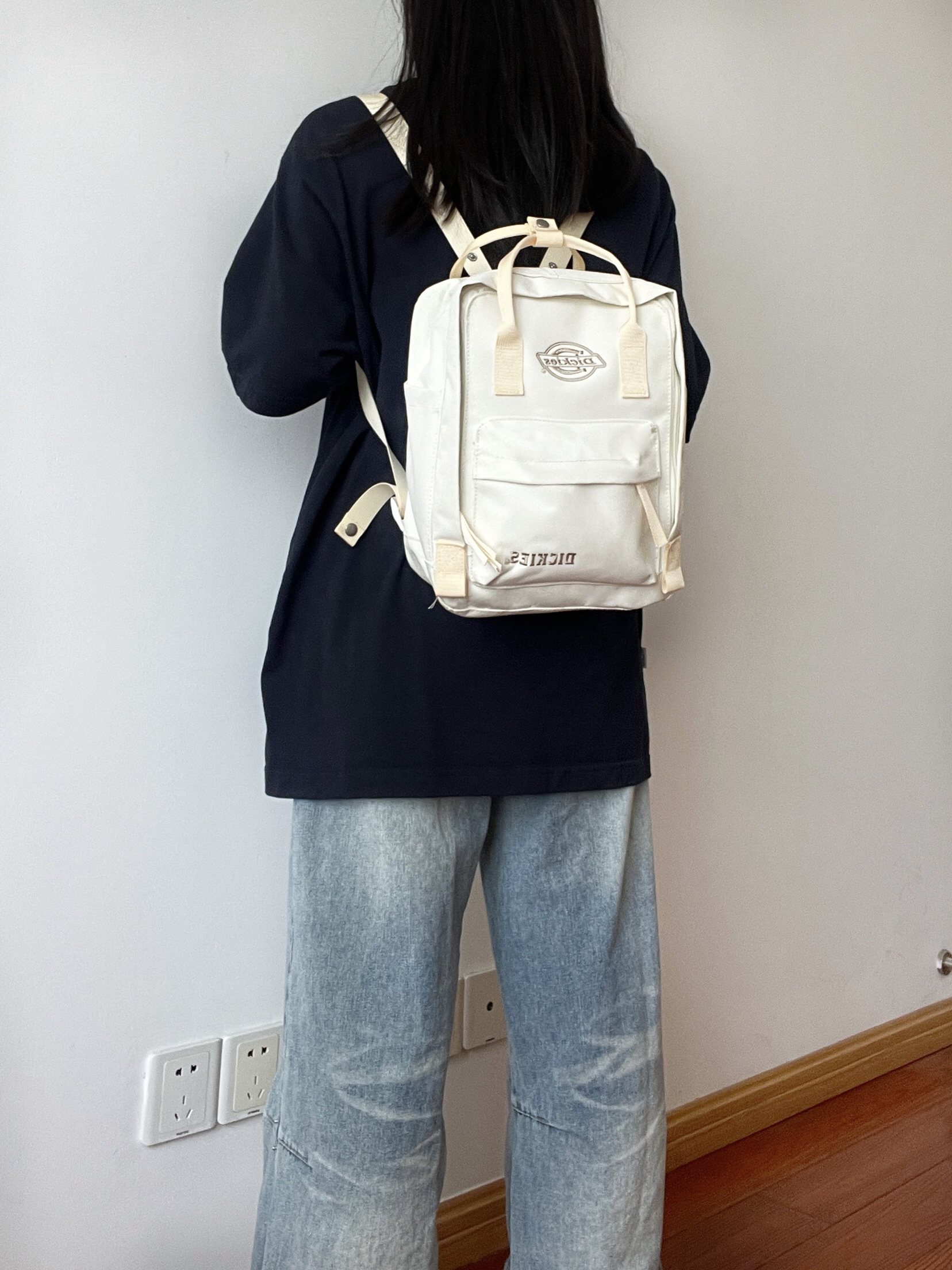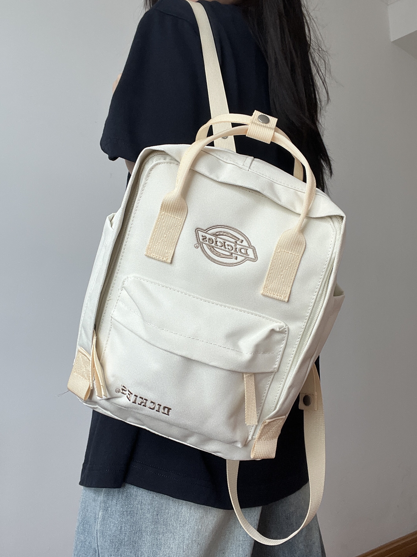种草了Dickies双肩包,到手后真的好爱啊啊! 米白色包包背上感觉自己好甜好乖巧😊这个包包大容量,日常所需都可以轻松的装下,还有侧袋可以装水杯、雨伞哒(˃ ⌑ ˂ഃ )图案是品牌LOGO刺绣,它是有多隔层袋设计。 日常上课或者出去玩都好适合,青春感很足,好喜欢啊啊🥰