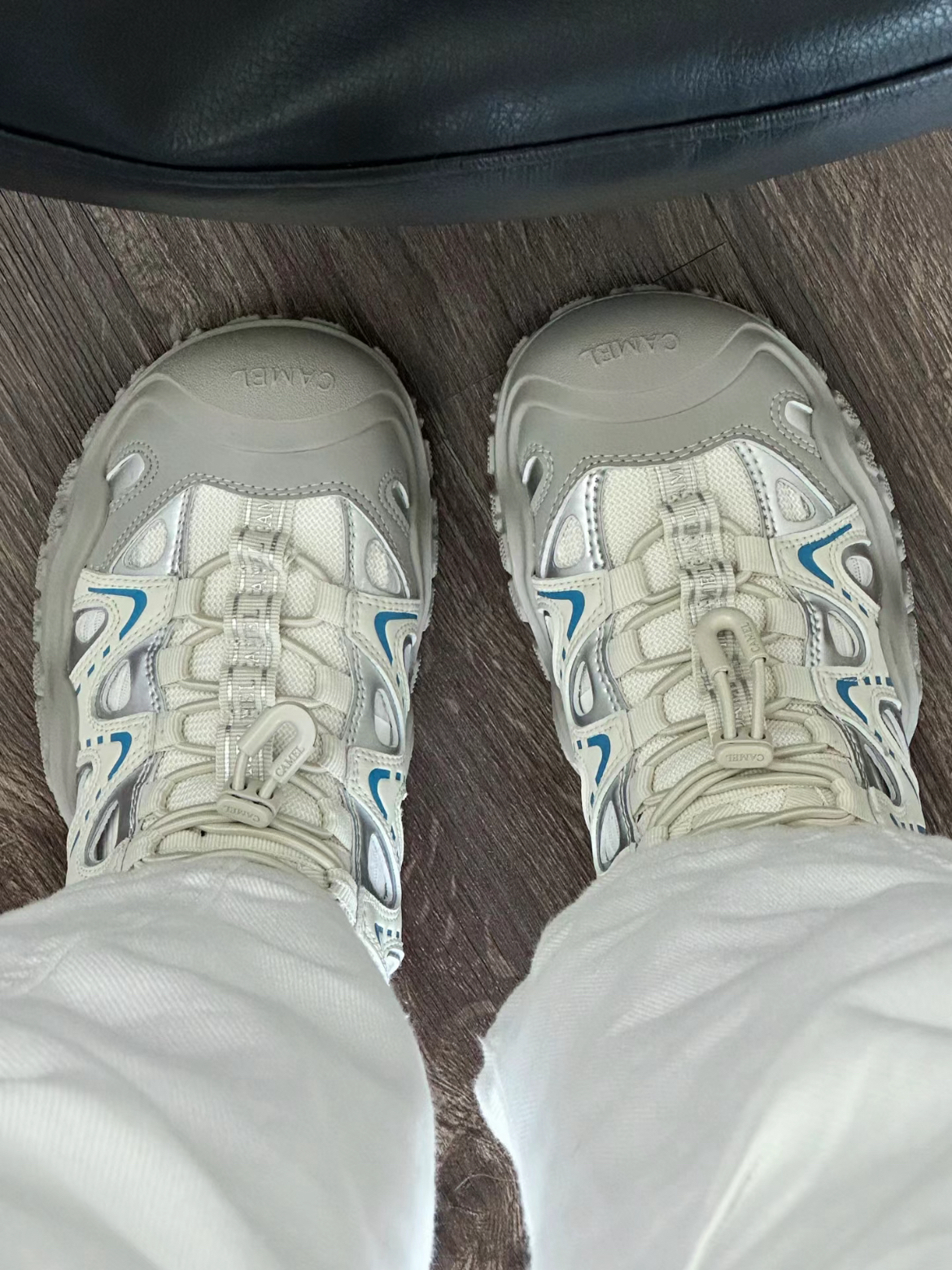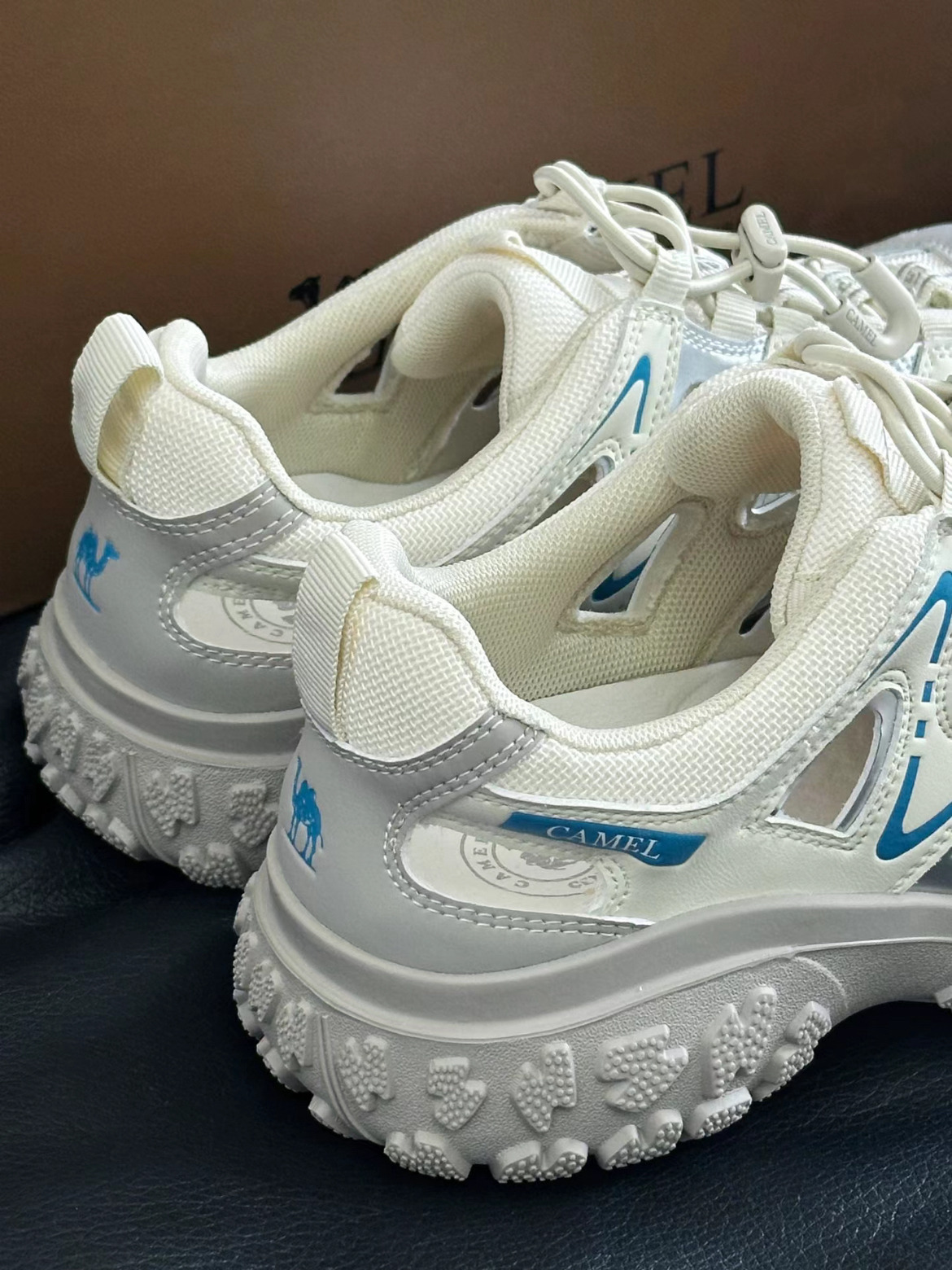 最近骆驼真的是开挂了🌟 奶乎乎的米白色搭配海盐蓝 丑萌丑萌的大鞋头 上脚很显腿细~ 侧面镂空的设计 夏天穿透气又清爽🫧 4cm的厚底 自带增高效果 hin 显高
