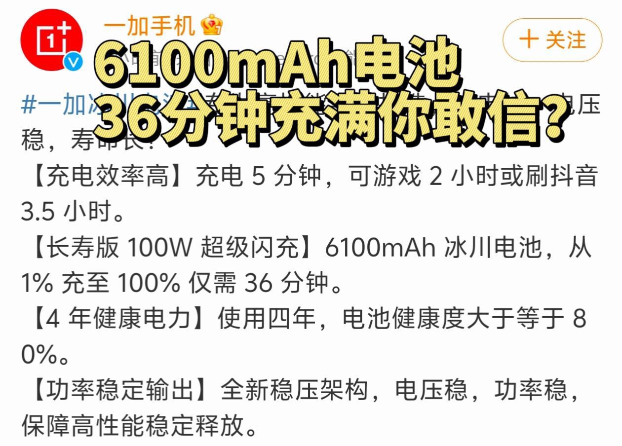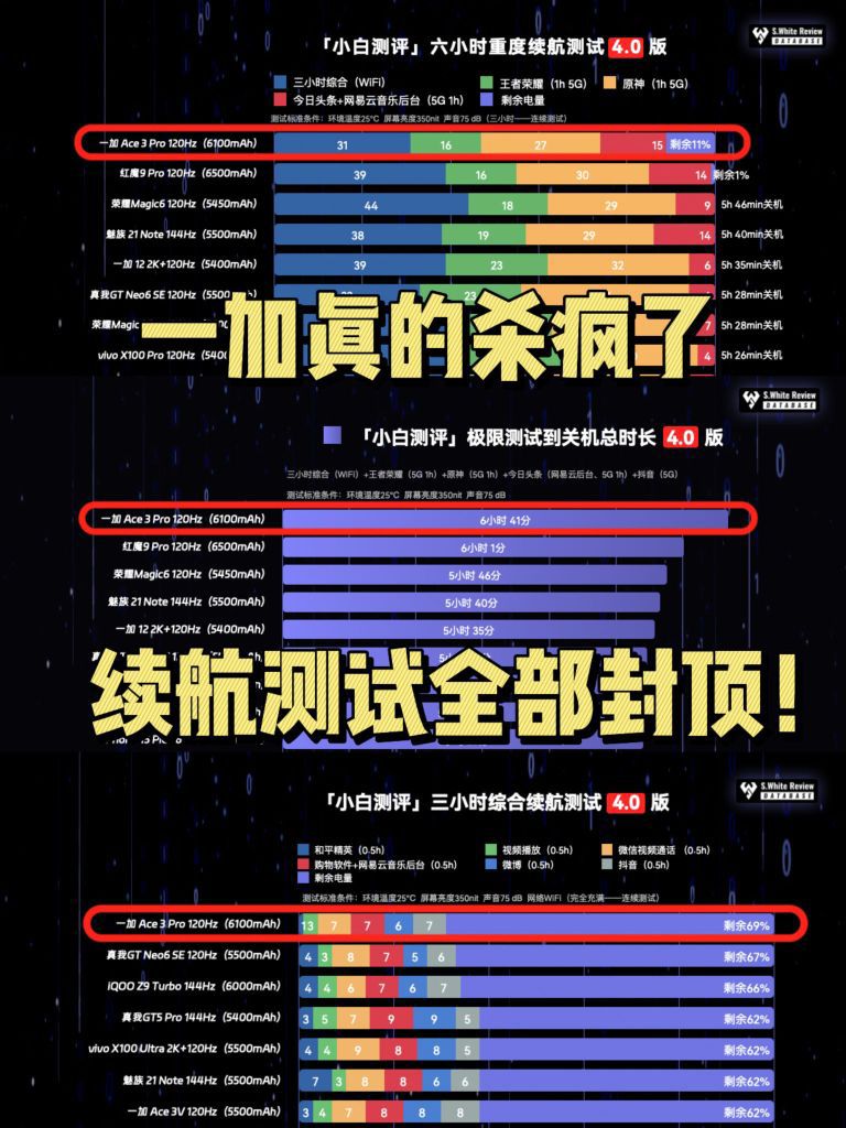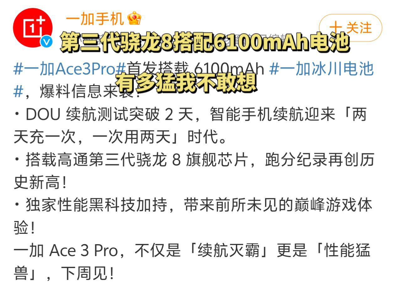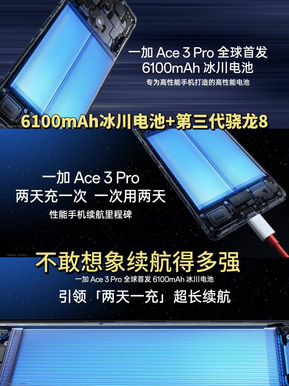 一加Ace3Pro搭载了第三代骁龙8处理器加上6100mAh的大电池,在众多机型中的续航测试表现非常好,封顶续航数据库的前列。采用了冰川电池,充电五分钟可以游戏2小时或者刷抖音3.5小时。妥妥的续航神机! 100W的快充回血速度也非常快,36分钟即可从1充至100%!这是目前为止一加最强的Ace! 狠狠期待一波!