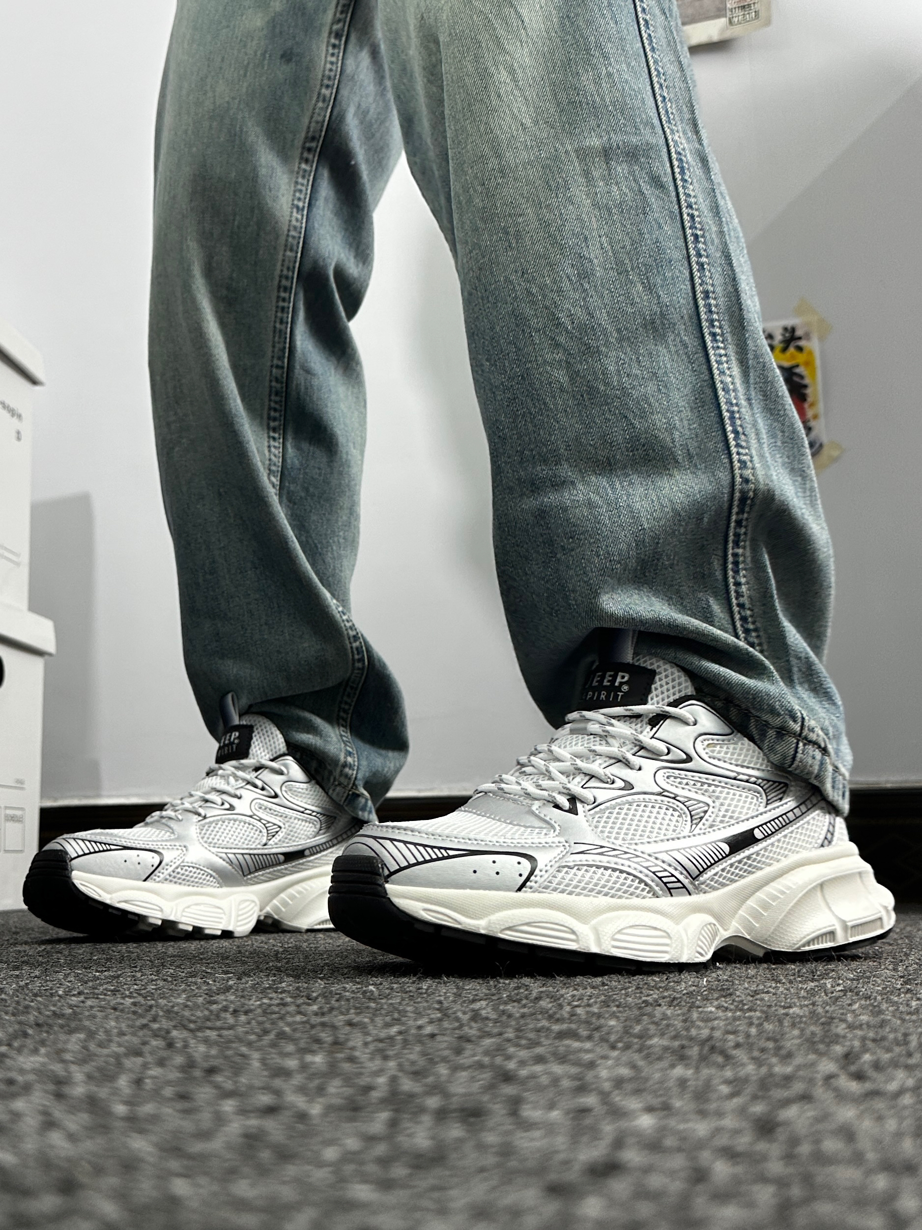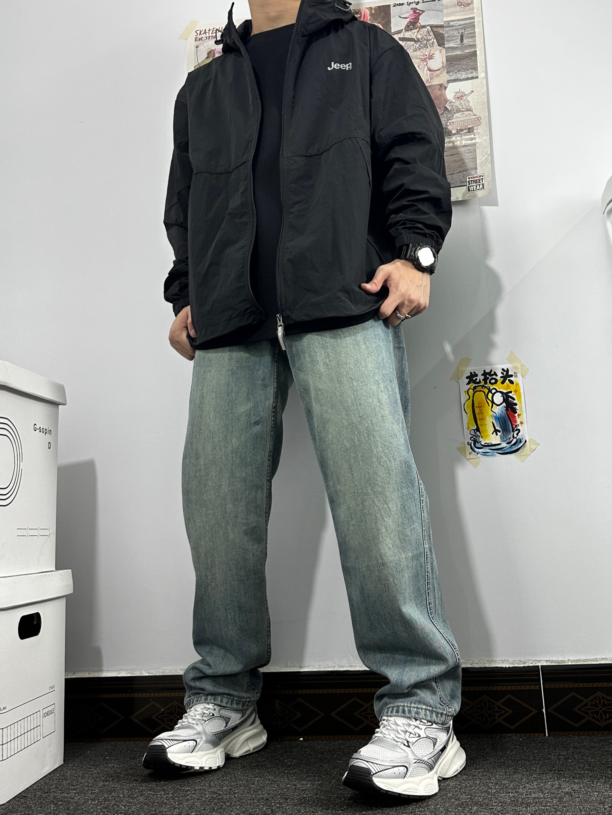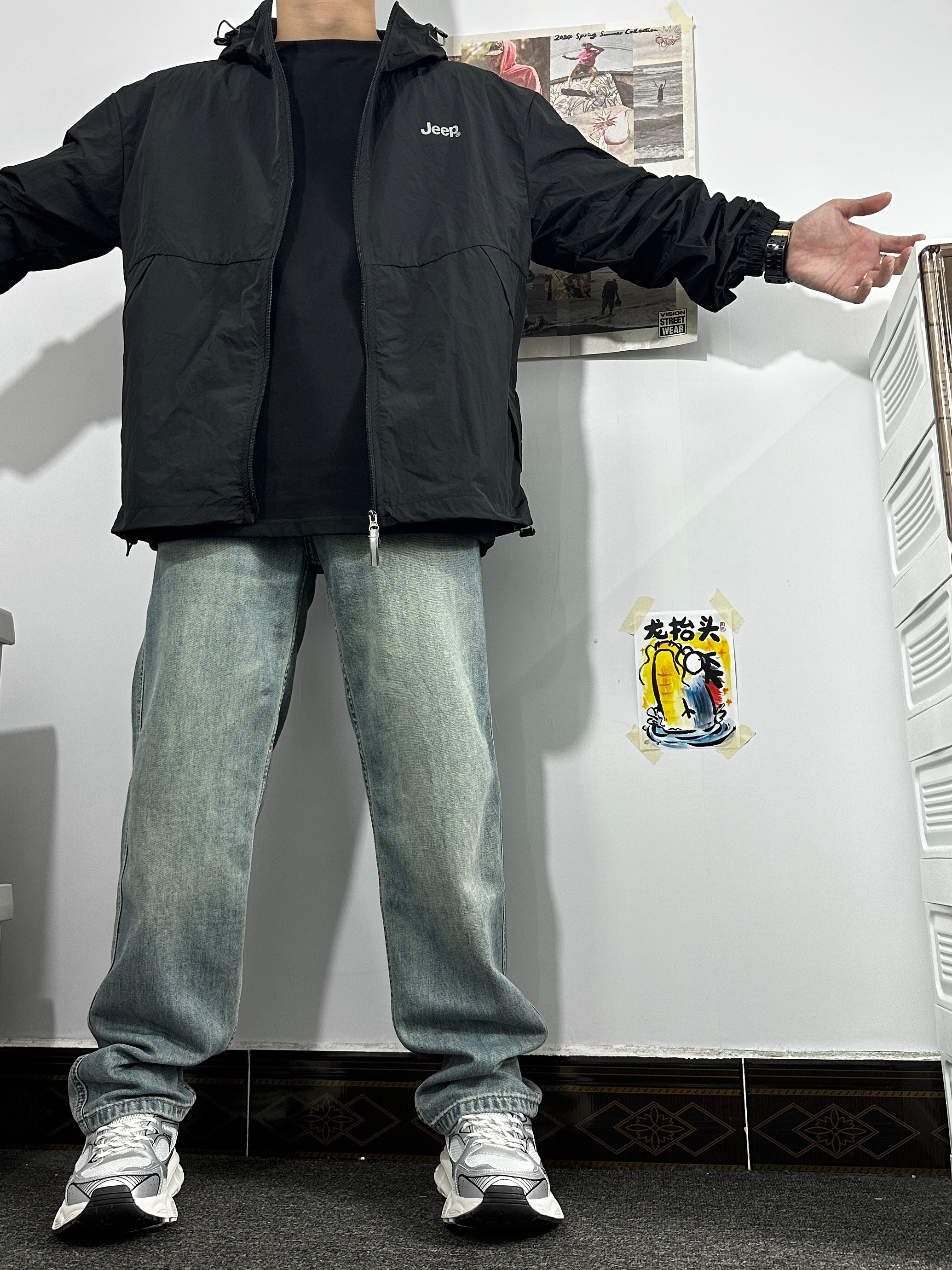 👔:JEEP黑色防晒衣,宽松薄款 双拉链的设计,上身有冲锋衣的感觉,哈哈哈就挺帅的啊; 👖:JEEP复古水洗做旧牛仔裤,宽松直筒的版型,上身比较有垂感,厚底比较薄,上身穿着不会闷; 👟:JEEP SPIRIT低帮老爹鞋,银白的配色还挺潮的,鞋子整个都是织物网,所以我上脚穿着也有不错的轻盈感和透气感,而且还有增高效果,绝绝子;