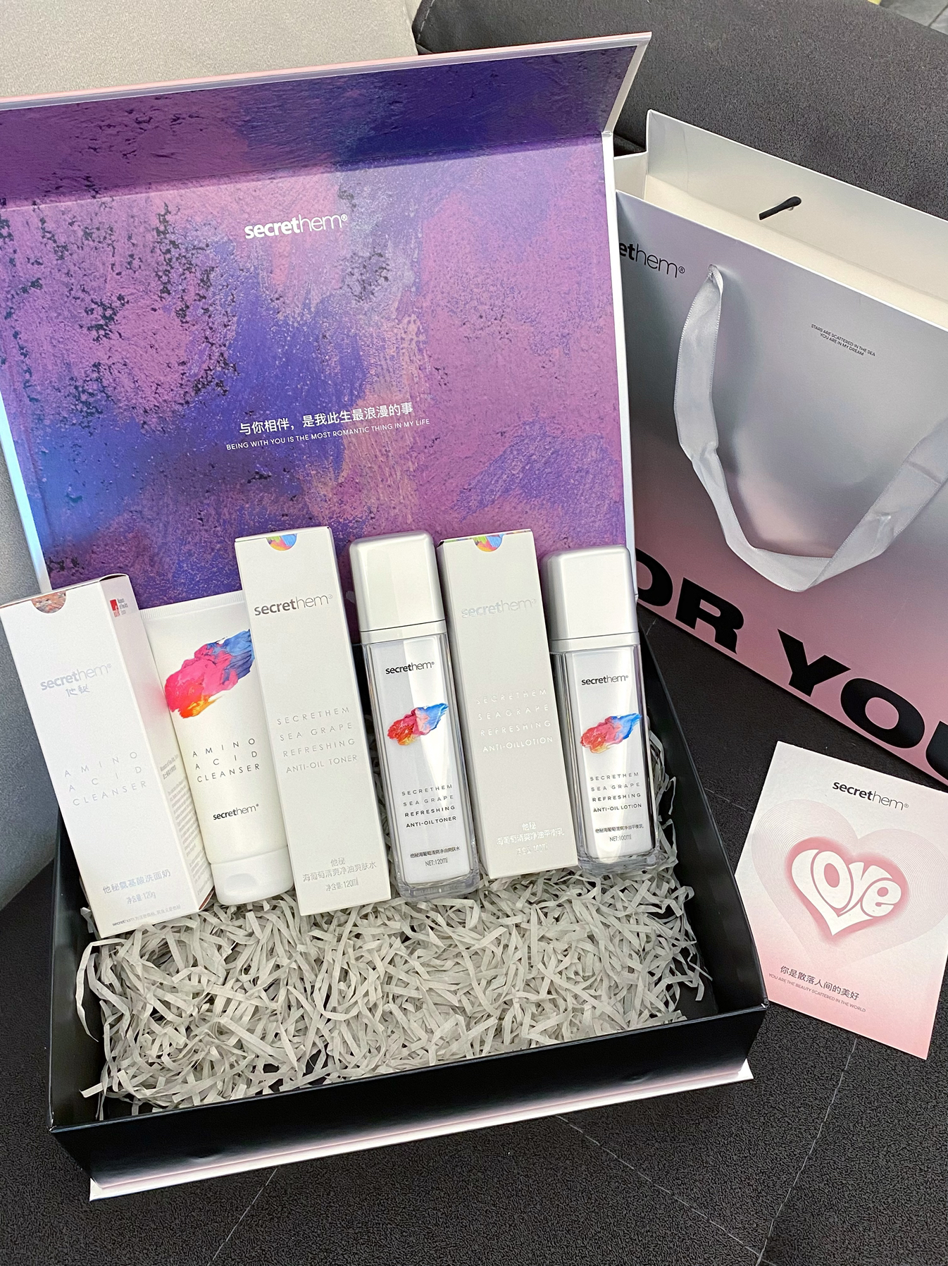时间过的好快呀 一眨眼就高中毕业了 想到再过几个月就要和男朋友异地了就有点难受 悄悄给男朋友准备了毕业礼物 是这套他秘海葡萄控油水乳套装 里面有洗面奶,爽肤水和平衡乳 质地都比较清爽,刚好适合男朋友现在这个季节用 礼盒是银色的设计,打开里面还有贺卡,很有仪式感 希望男朋友每次用到它的时候都能想起我