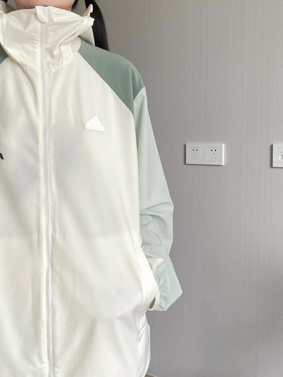 本篇笔记关联了Adidas/阿迪达斯 梭织轻拼接拼色凉感长袖拉链连帽插肩UPF50+防晒衣 JJ1303 JJ1304 JJ1305 汉玉白等商品,为用户提供真实的使用体验和购买参考。