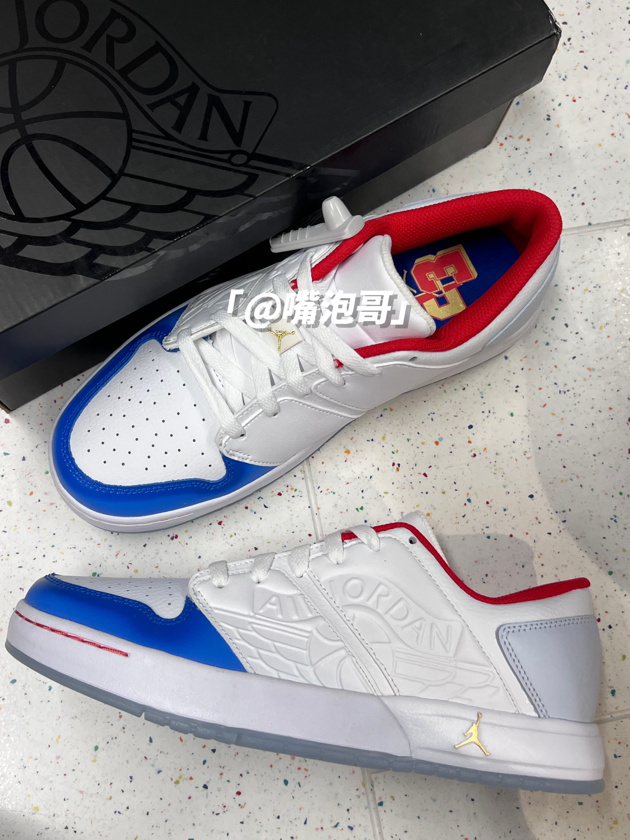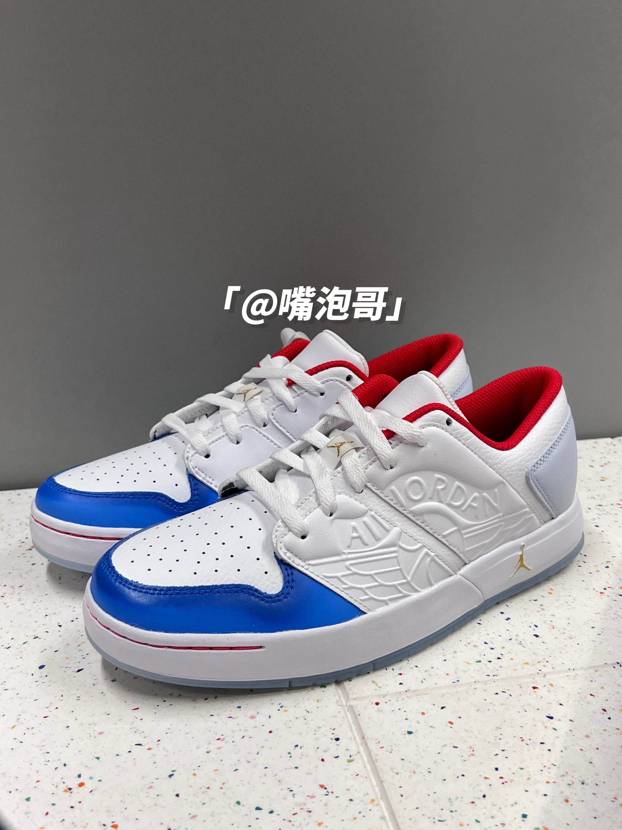 👟:Air Jordan Nu Retro 1 Low 白蓝红 简介: 鞋款是一双低帮的休闲板鞋,整双鞋子的配色选用白蓝红色三色组合,穿搭起来还蛮亮眼的,虽然鞋面是用了皮革材料而且大底也是水晶大底,质感上很不错,但整体脚感还是有点偏硬。 细节: 鞋面采用了柔软且光滑的复合皮革制成,质感上很不错,鞋身两侧使用皮革压印工艺制作了飞翼标志,鞋舌同样是皮革材料的,增强了质感,中大底是耐磨橡胶...