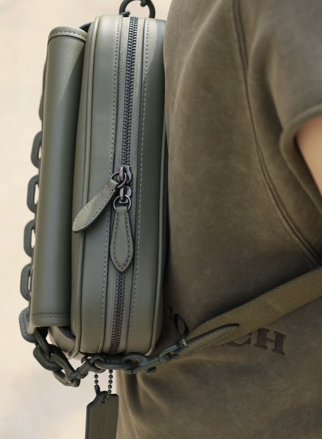 夏日的橄榄绿怎么能错过呢?绿色看着心情都好 这款也是粗链条点睛加持的, 最近偏爱这种设计感的包包,简单高级 不卡性别的包包,男女可背款式