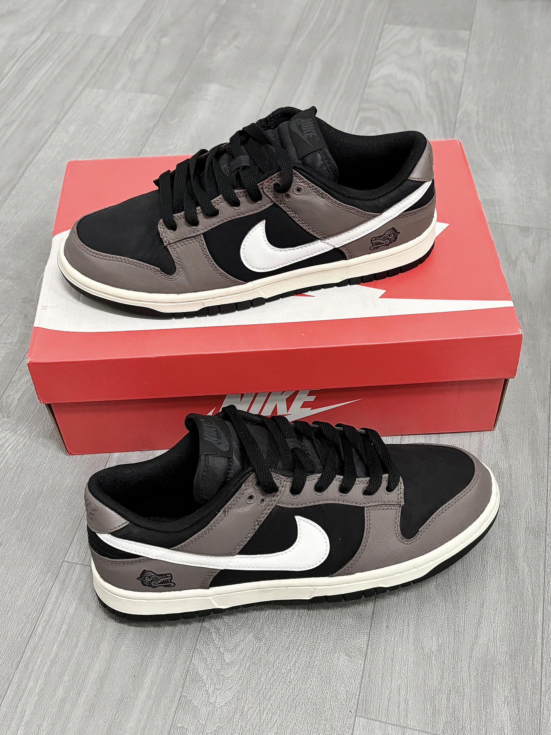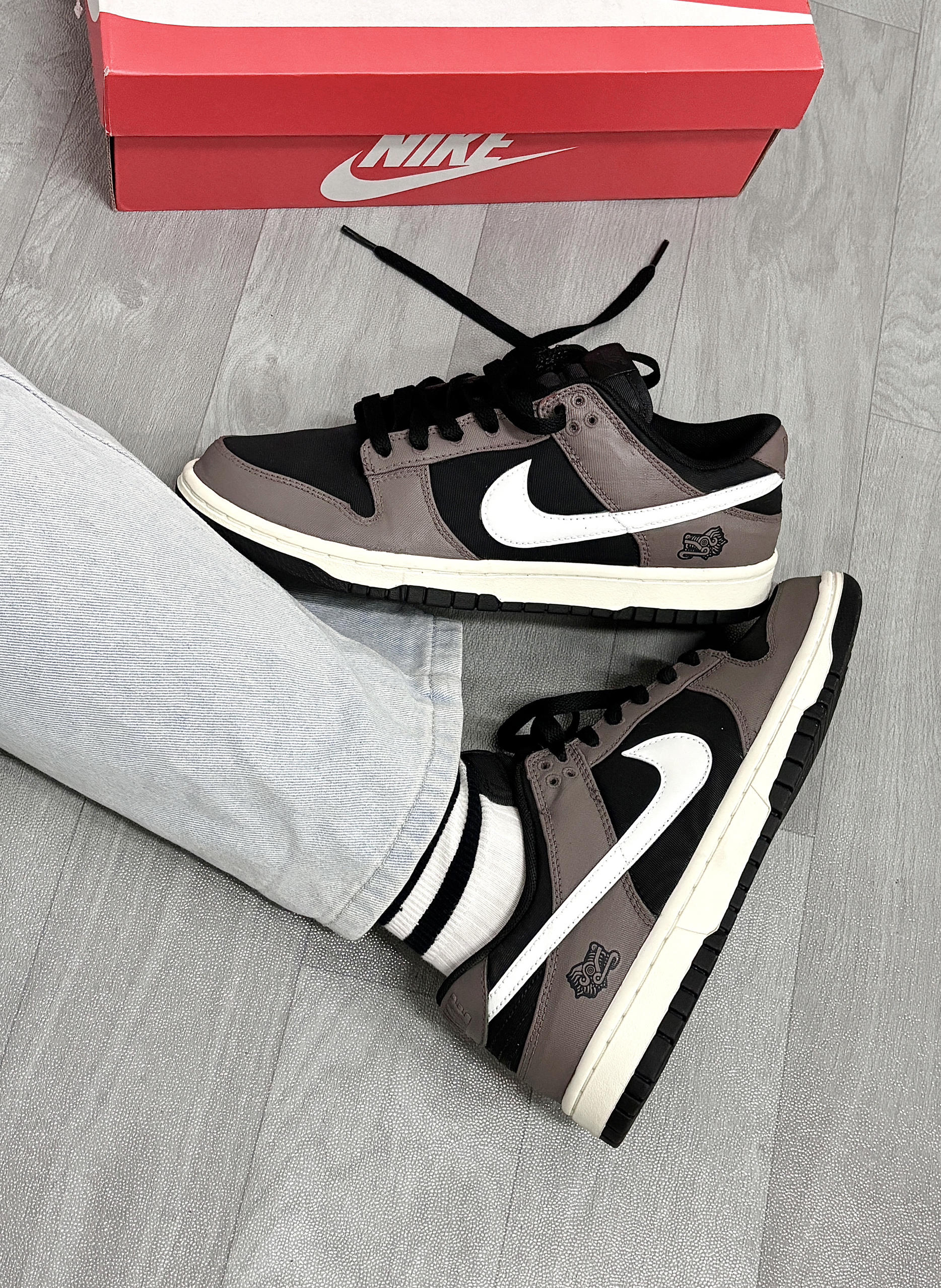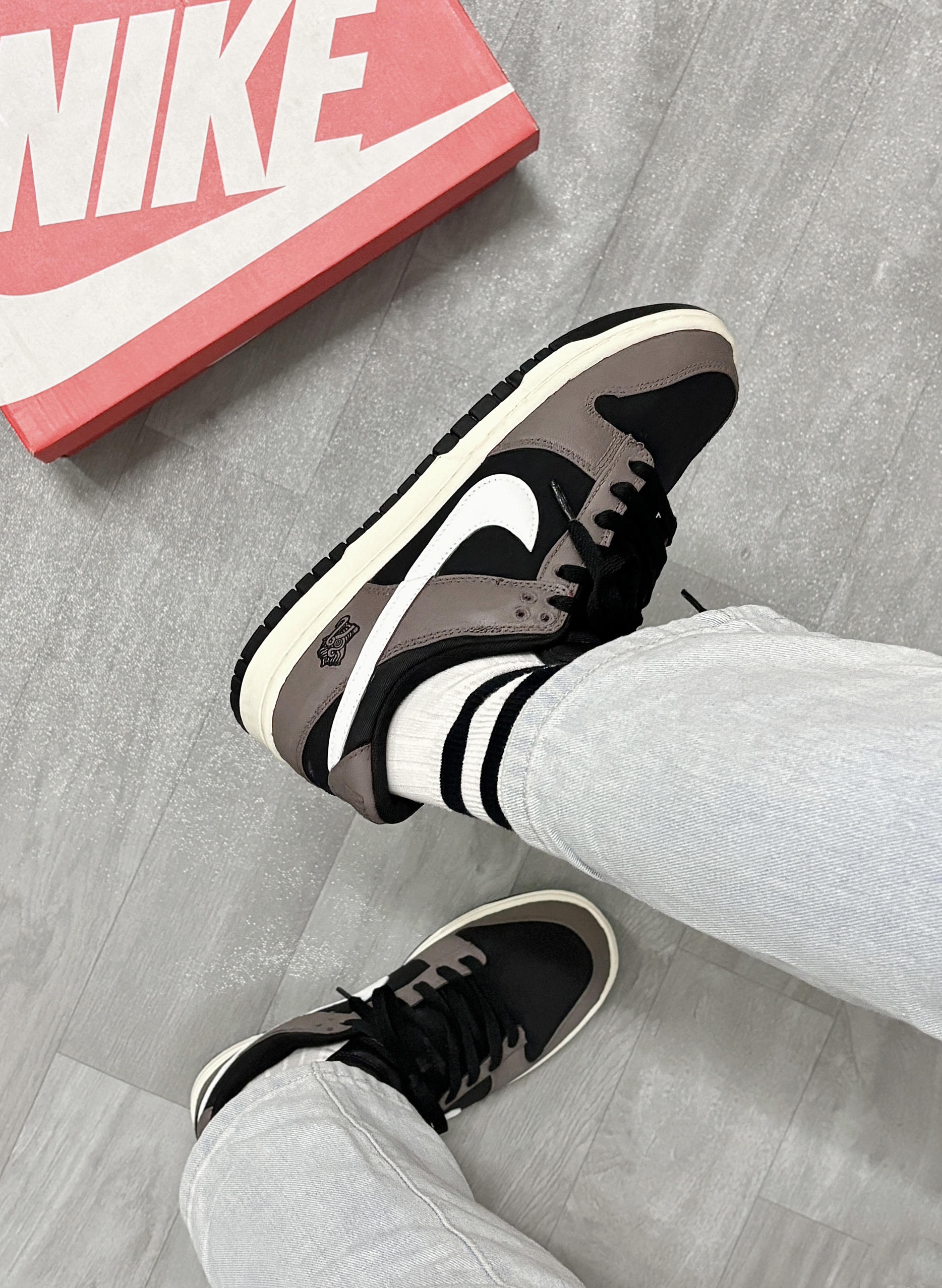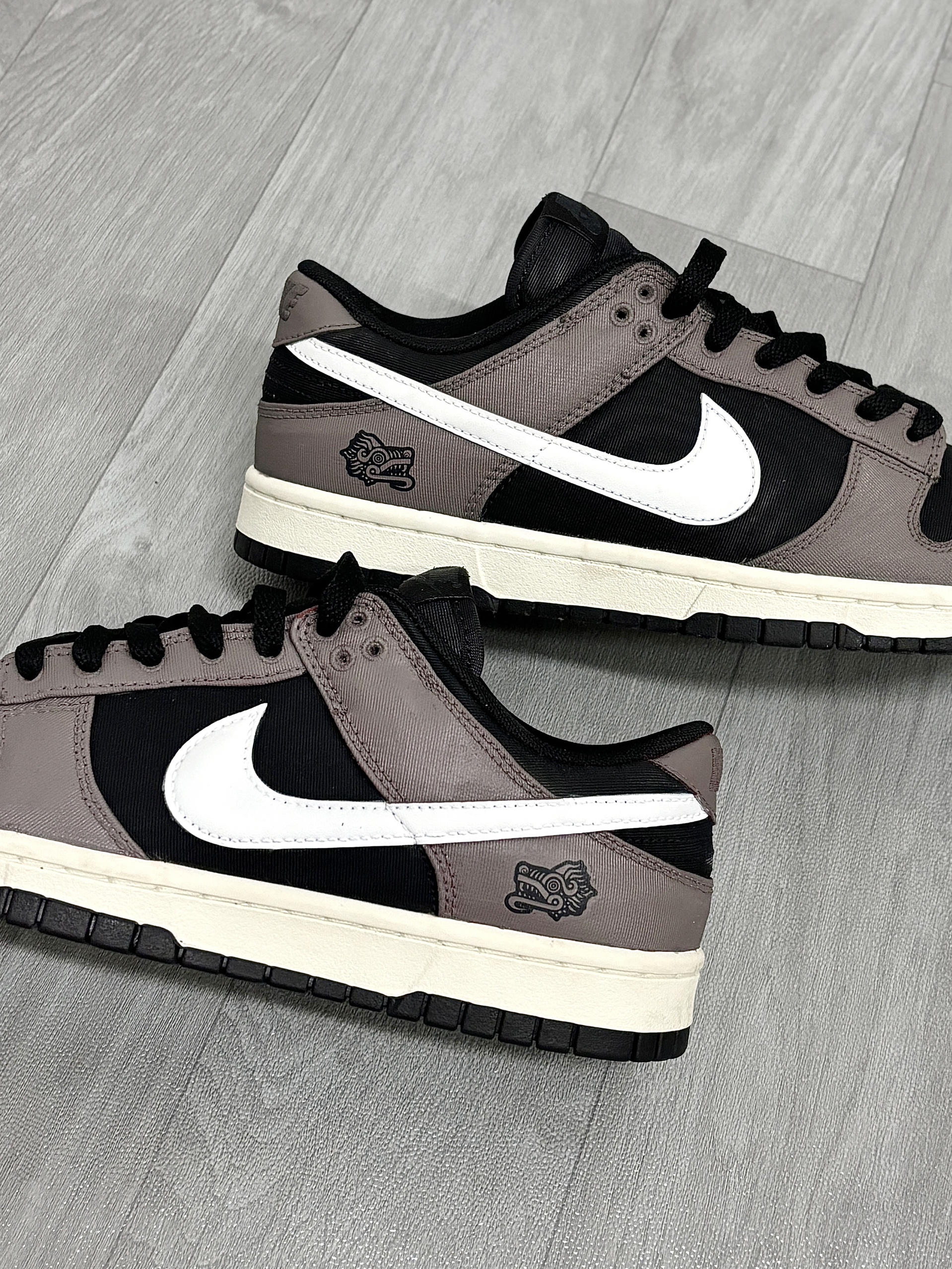 💁♂️:Hi~ 这里是大大纳mi~ 新dunk到啦,忍不住分享一下下😅 摩卡棕+黑白拼接,低调的配色 有种磨砂高级感,妥妥美式复古的味道! 版型百搭不挑衣服,牛仔裤👖休闲裤都适配 后跟手绘的龙头🐲图案,挺个性 出街穿杠杠滴,还不用担心会撞款✔️ 尺码不偏码,正常选择就可以!