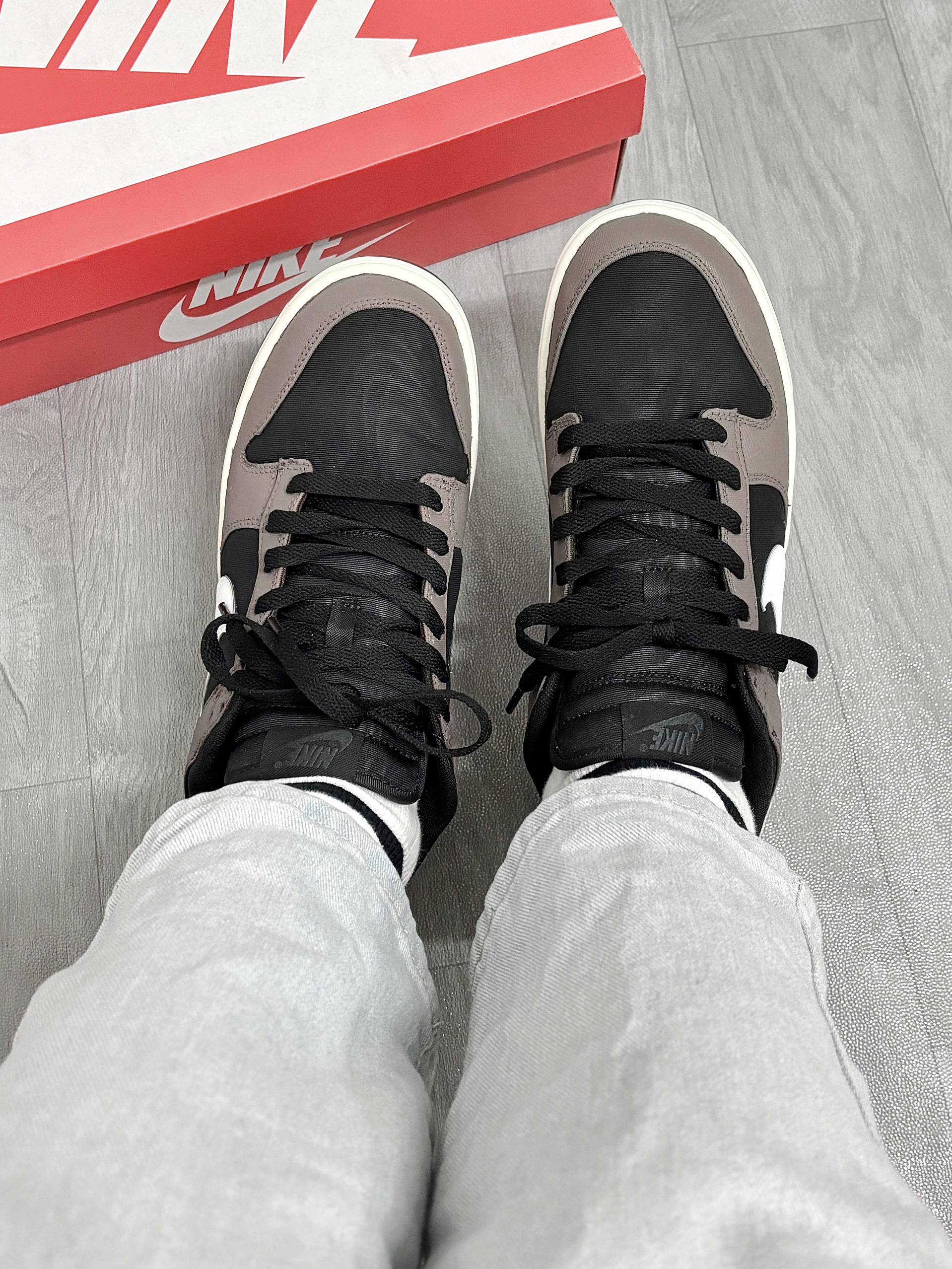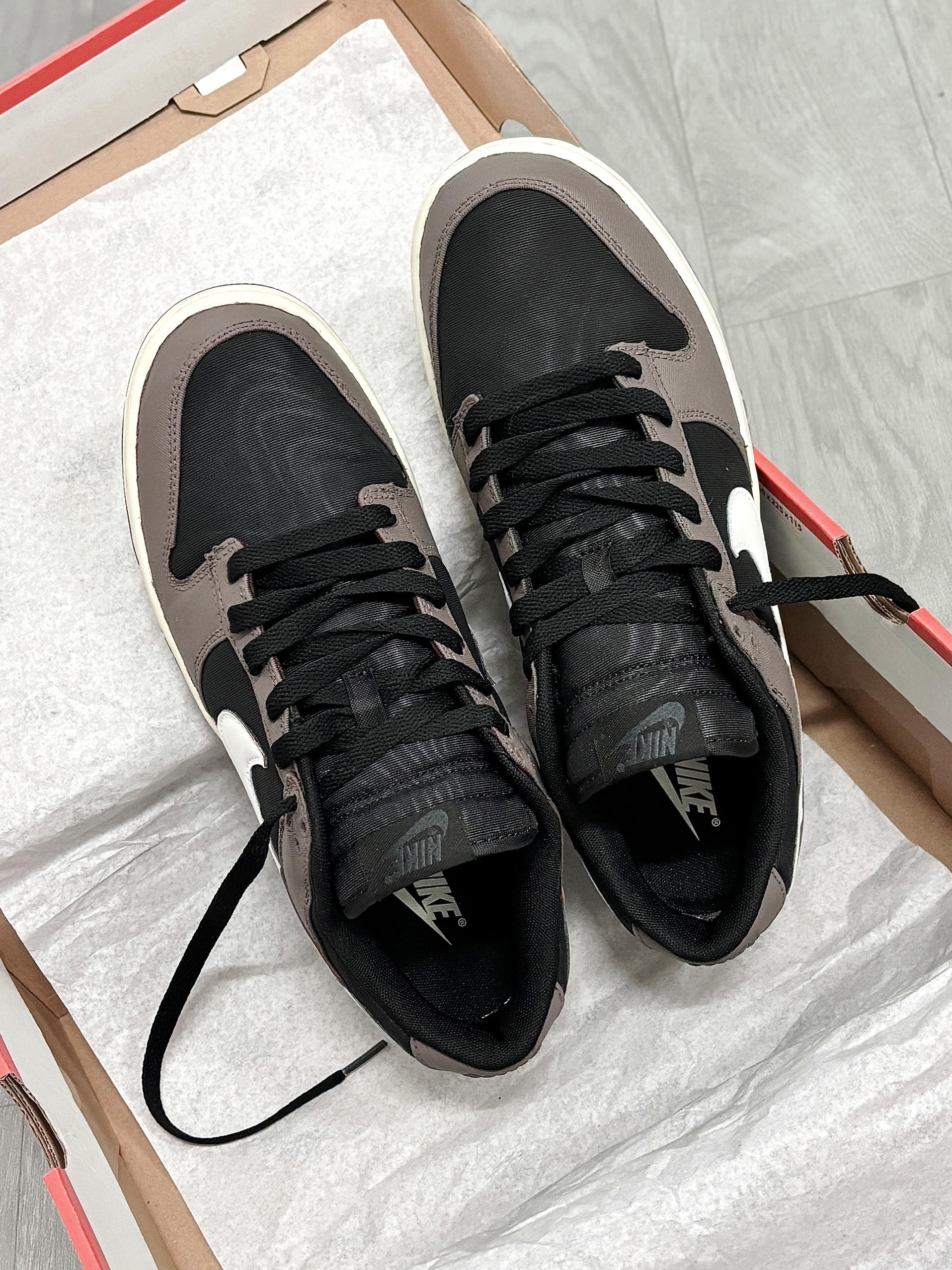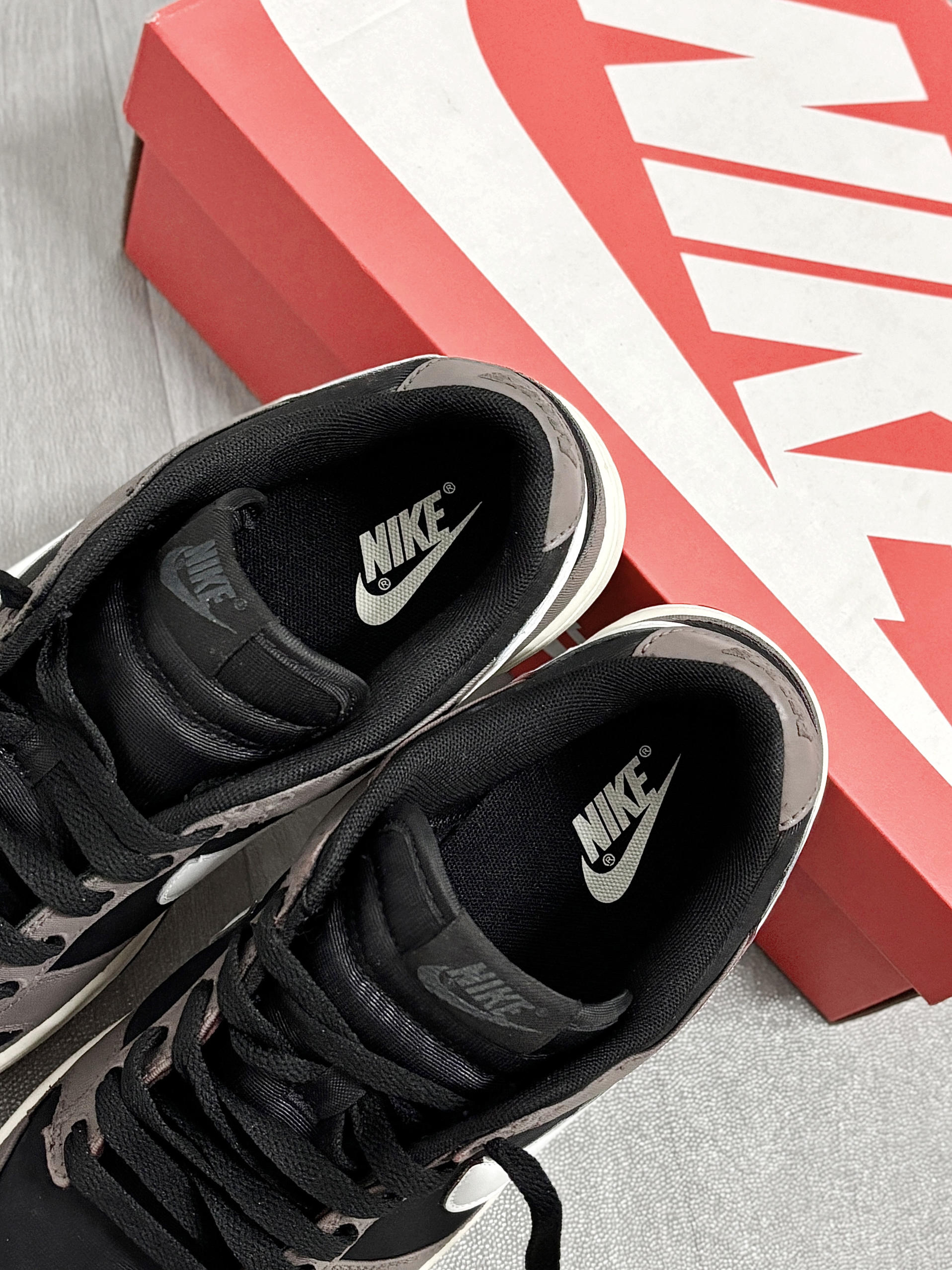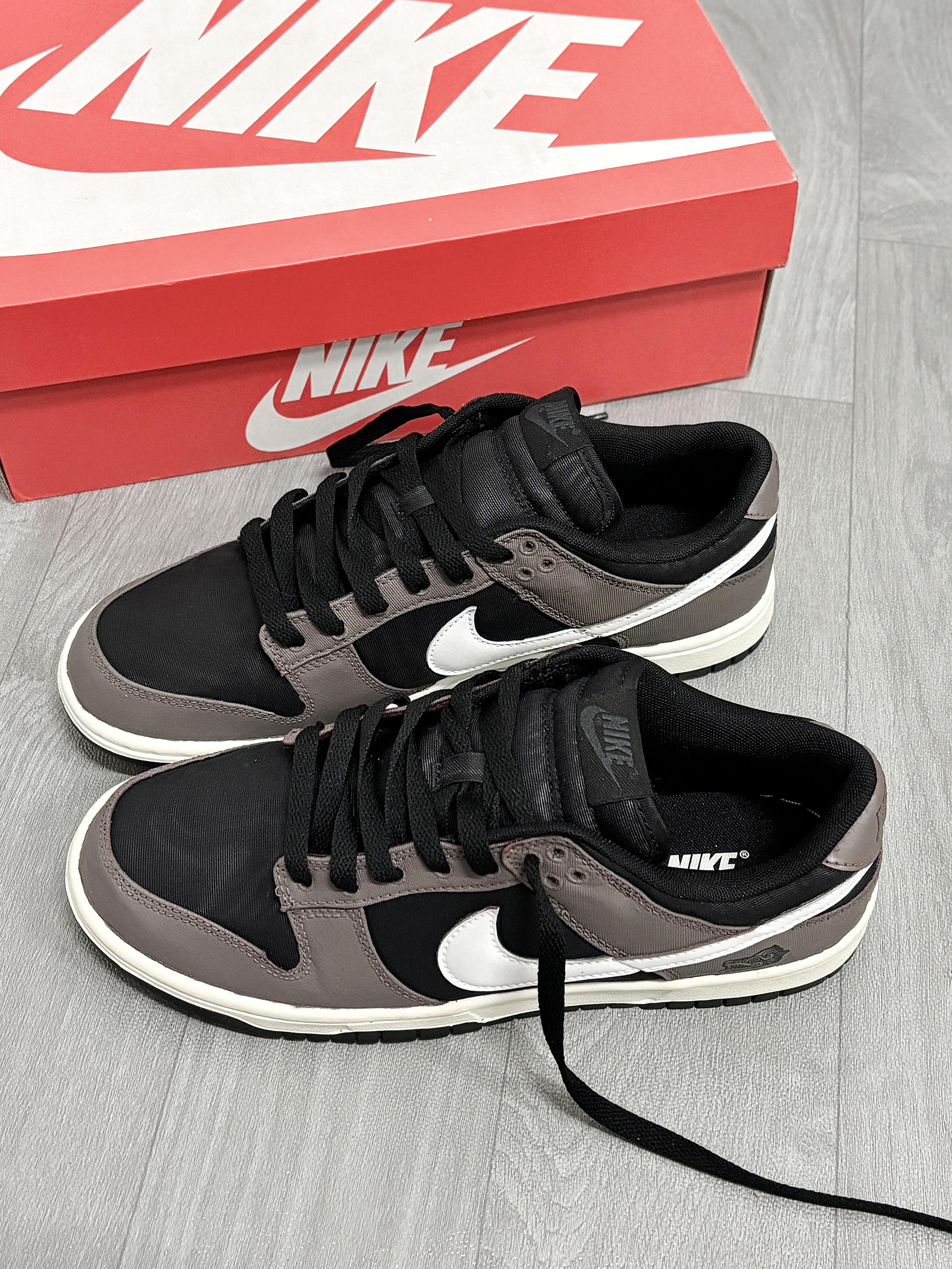 💁♂️:Hi~ 这里是大大纳mi~ 新dunk到啦,忍不住分享一下下😅 摩卡棕+黑白拼接,低调的配色 有种磨砂高级感,妥妥美式复古的味道! 版型百搭不挑衣服,牛仔裤👖休闲裤都适配 后跟手绘的龙头🐲图案,挺个性 出街穿杠杠滴,还不用担心会撞款✔️ 尺码不偏码,正常选择就可以!