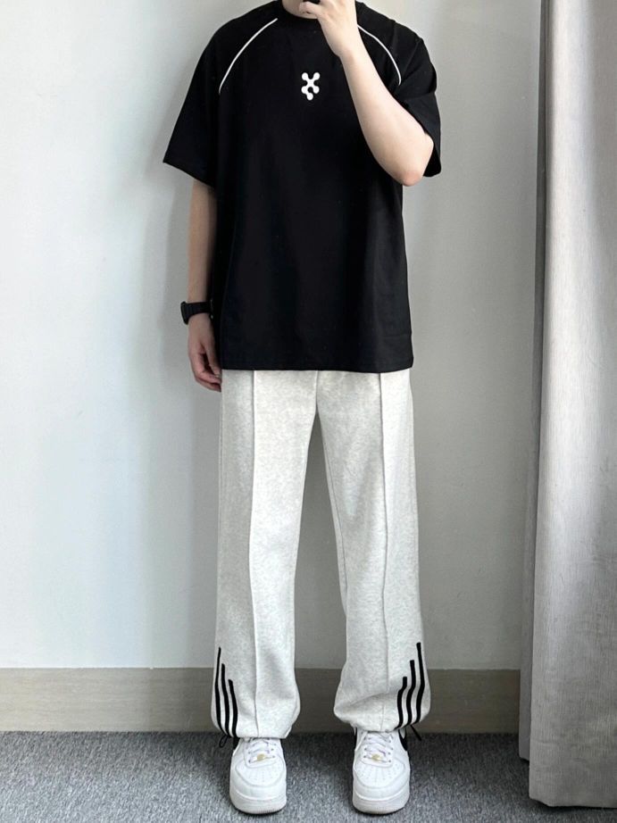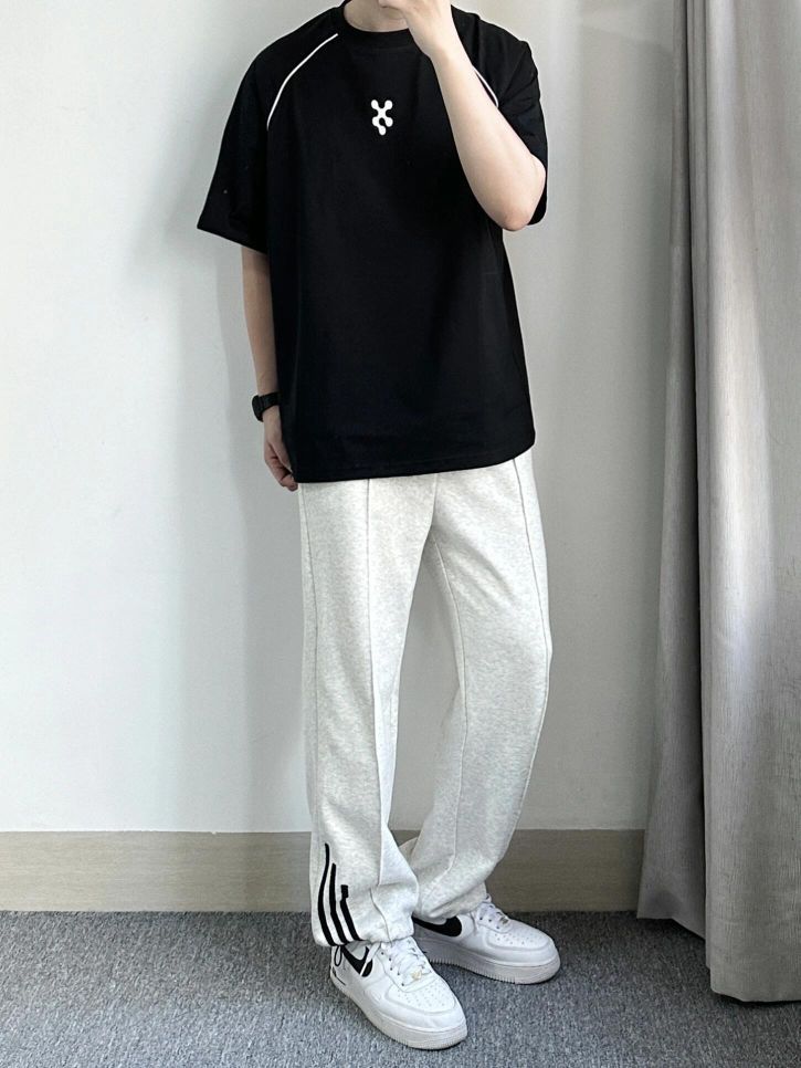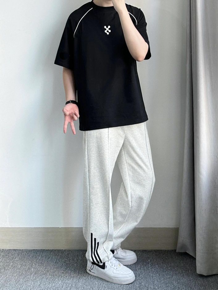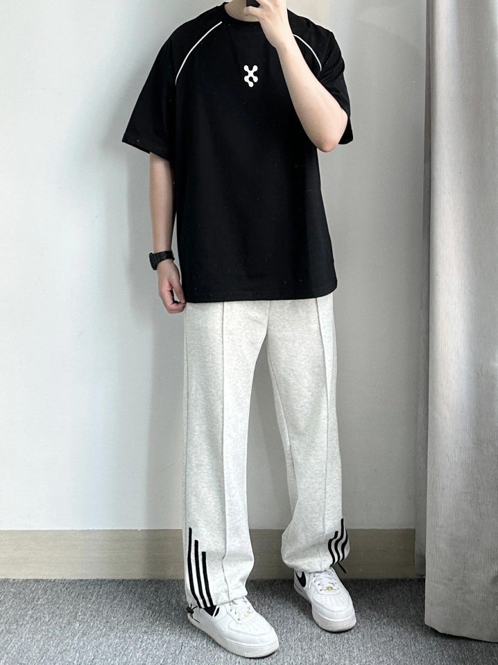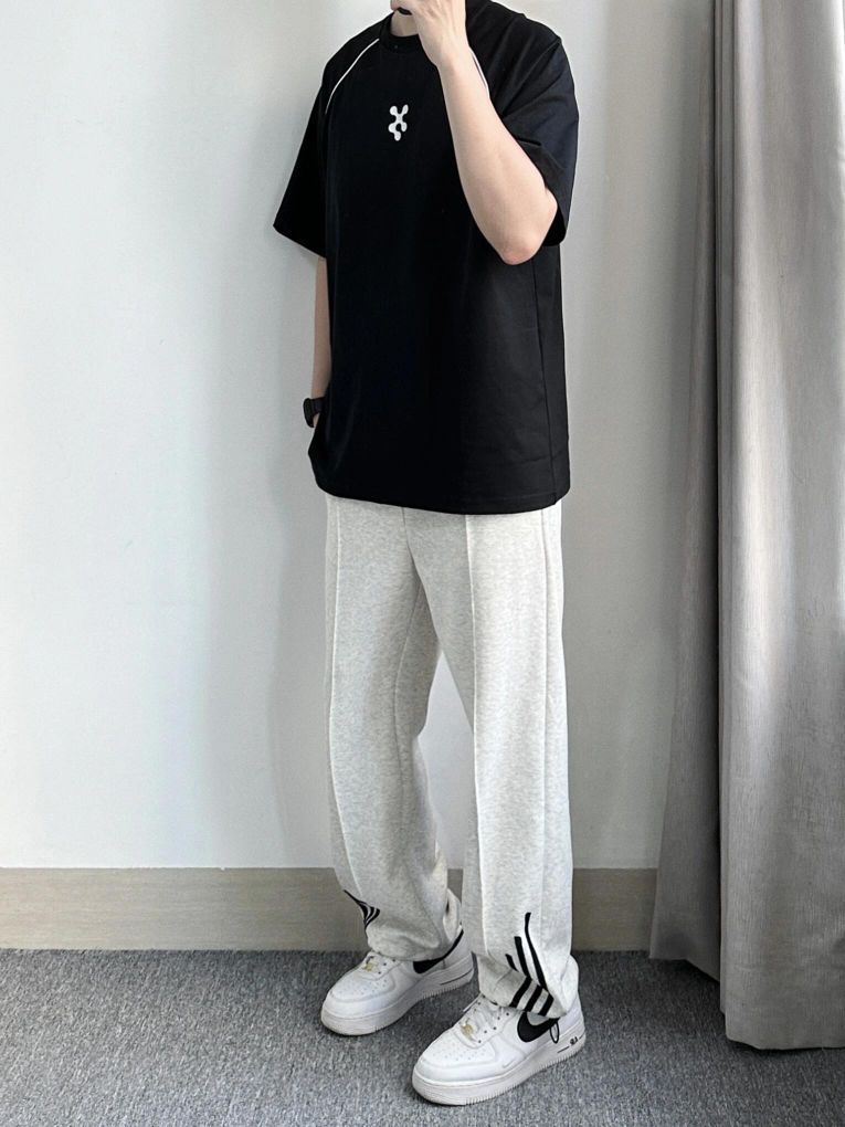 ✨今天又是一期主打一个舒适度拉满的夏日通勤穿搭 👌黑白灰简约搭配真的好穿又穿不腻 纯色短袖领口的细节简单又不单调 而且很好搭 ✨男生一定要有一条灰色卫裤 我选这条舒适又时髦的 宽松版型就是不挑身材不挑人穿 侧面细节很有层次感 (图片来自博主:我想吃鸡腿)