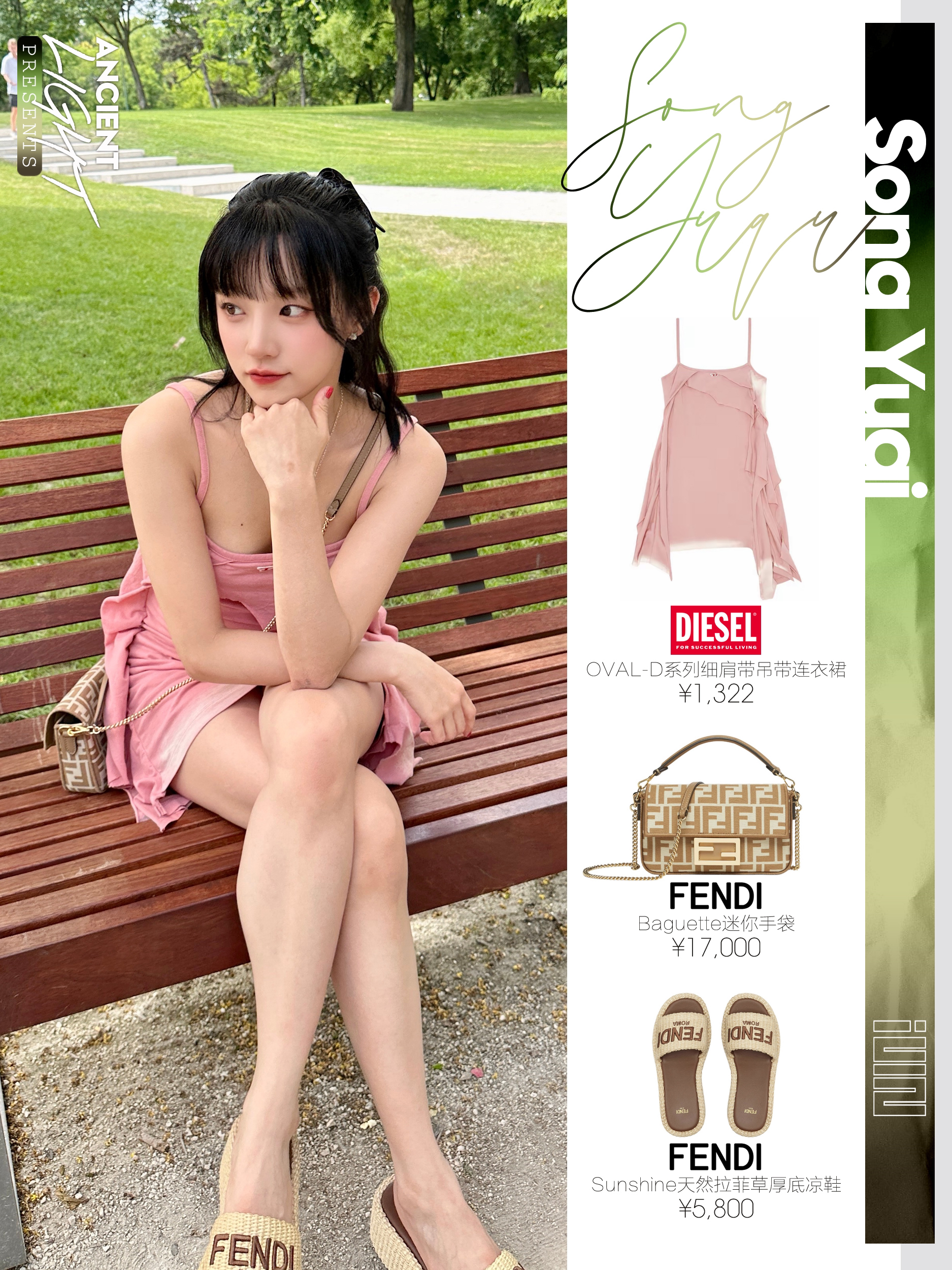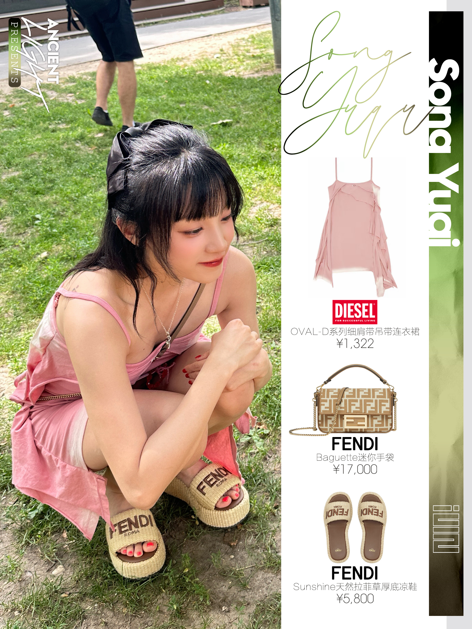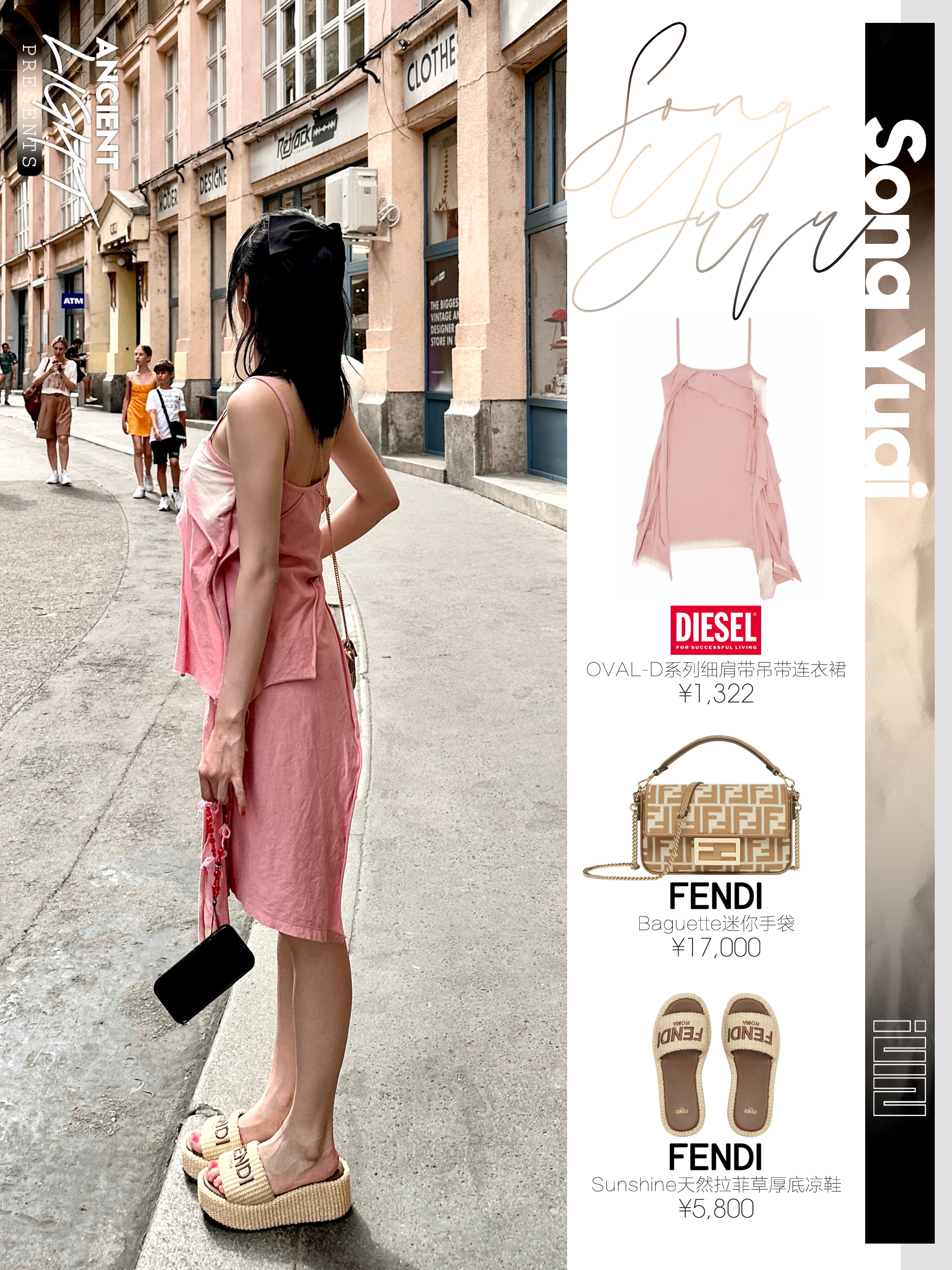 宋雨琦的团队是懂抓人眼球的妆造,每次都能把雨琦的少女感兼清新感糅合的无缝衔接,身着粉色的吊带裙的雨琦好像一颗奶香奶香的小草莓,看着就很香甜。 服饰|DIESEL OVAL-D系列细肩带吊带连衣裙 货号A129800KLAH-3CI 手袋|FENDI Baguette迷你手袋 货号8BS017AOVFF1PIQ 鞋履|FENDI Sunshine天然拉菲草厚底凉鞋 货号8R8515AORGF...