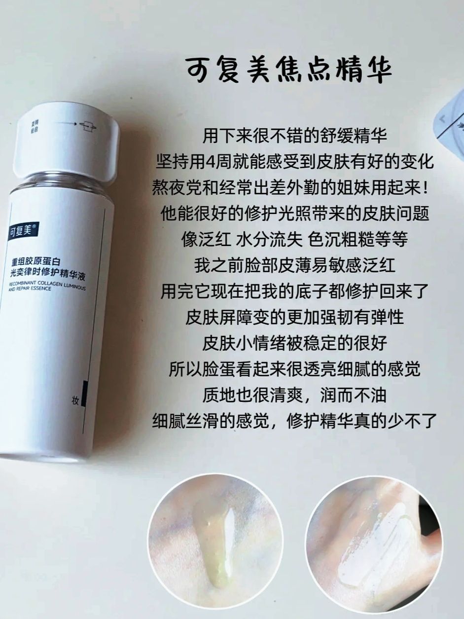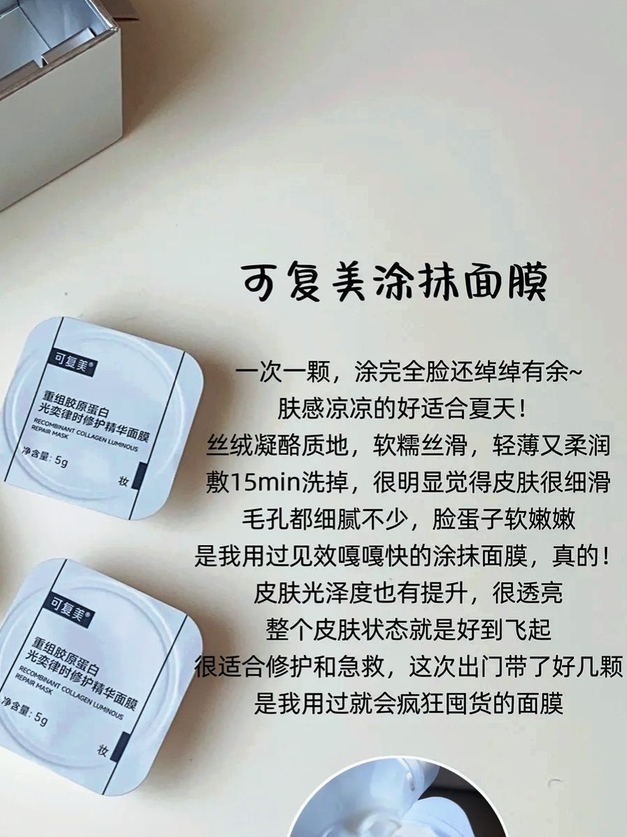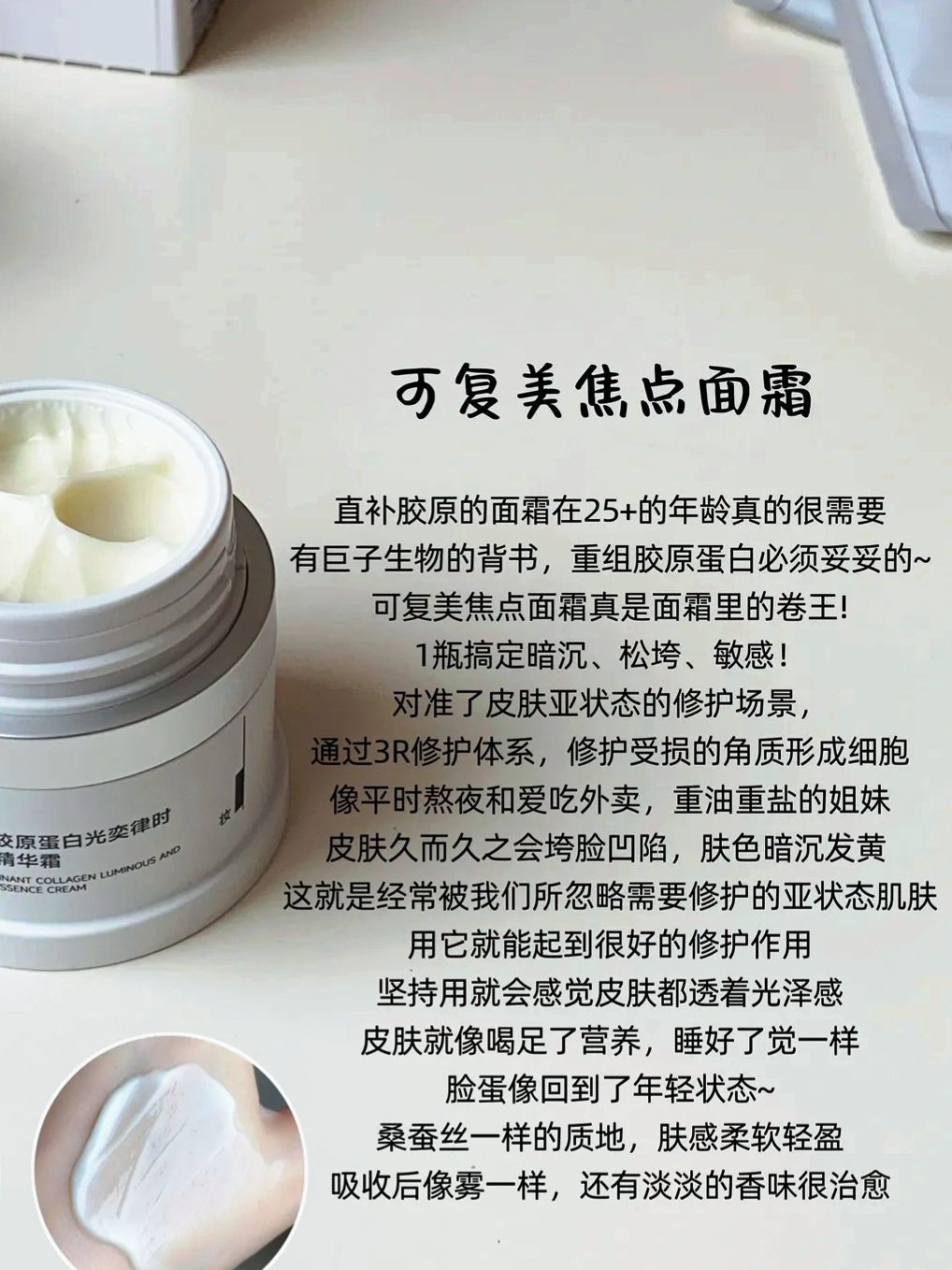 本篇笔记关联了可复美 焦点涂抹面膜重组胶原蛋白光奕律时修护 滋润、可复美 焦点重组胶原蛋白光奕律时精华霜 修护暗沉紧致 保湿舒缓、可复美 重组胶原蛋白光奕御能修护精华面膜 补水等商品,为用户提供真实的使用体验和购买参考。