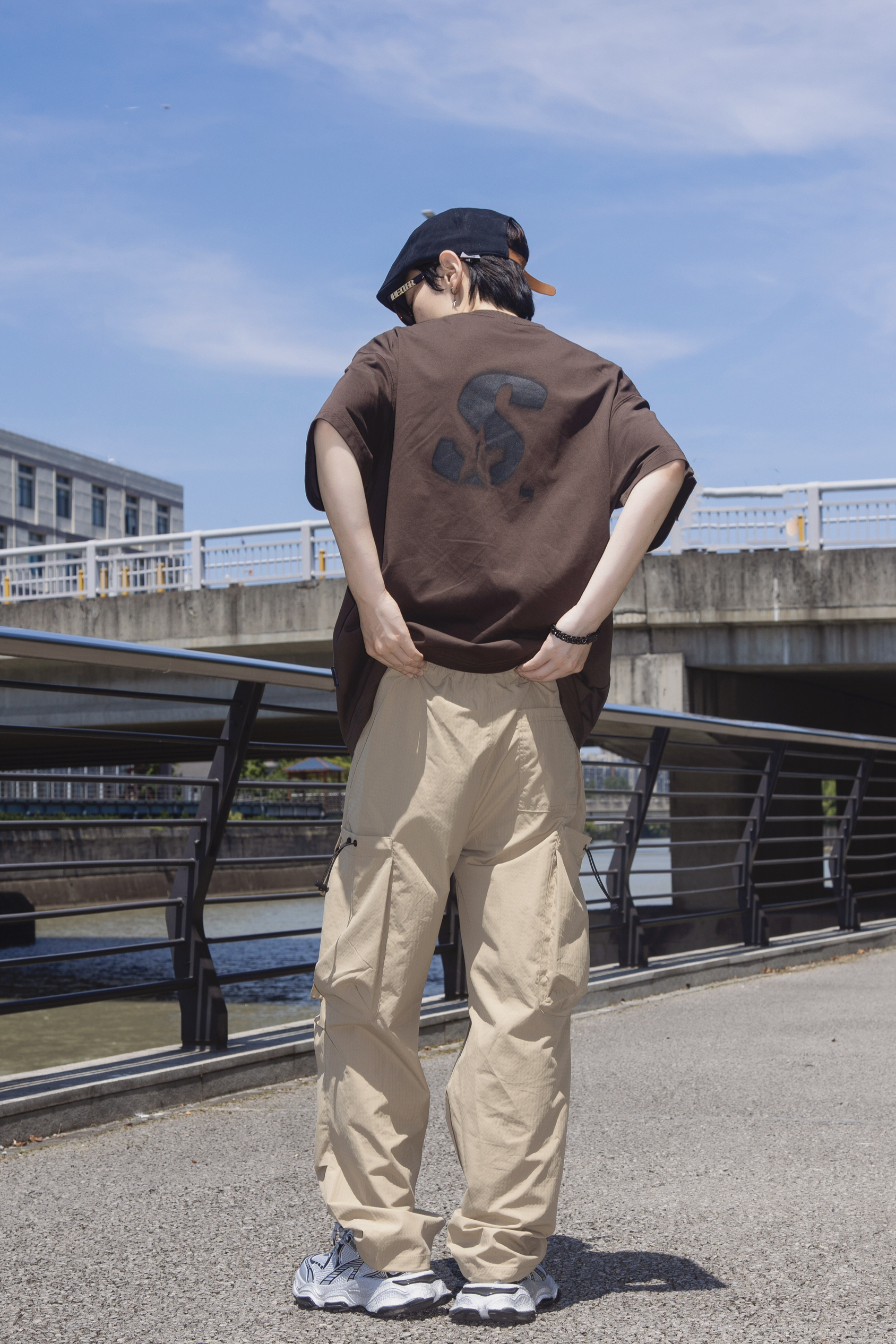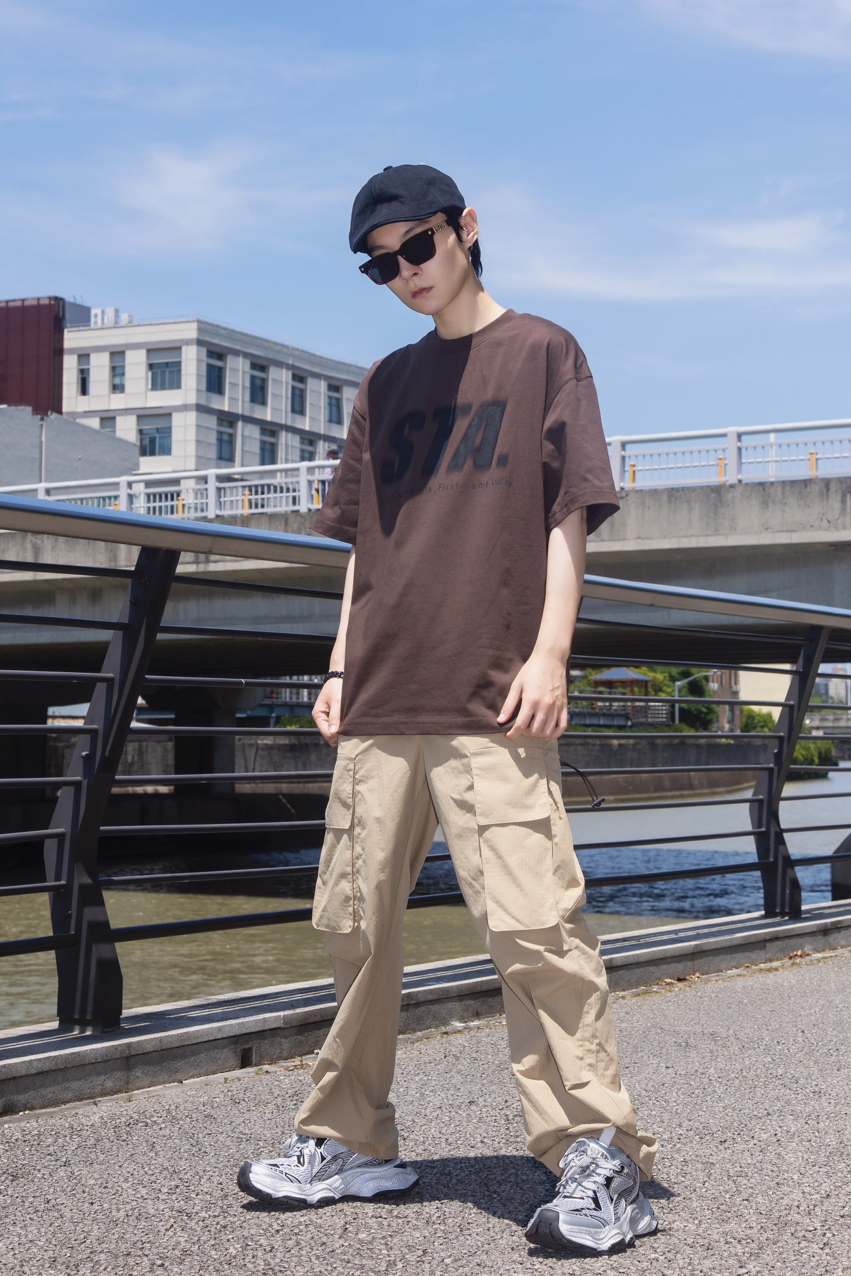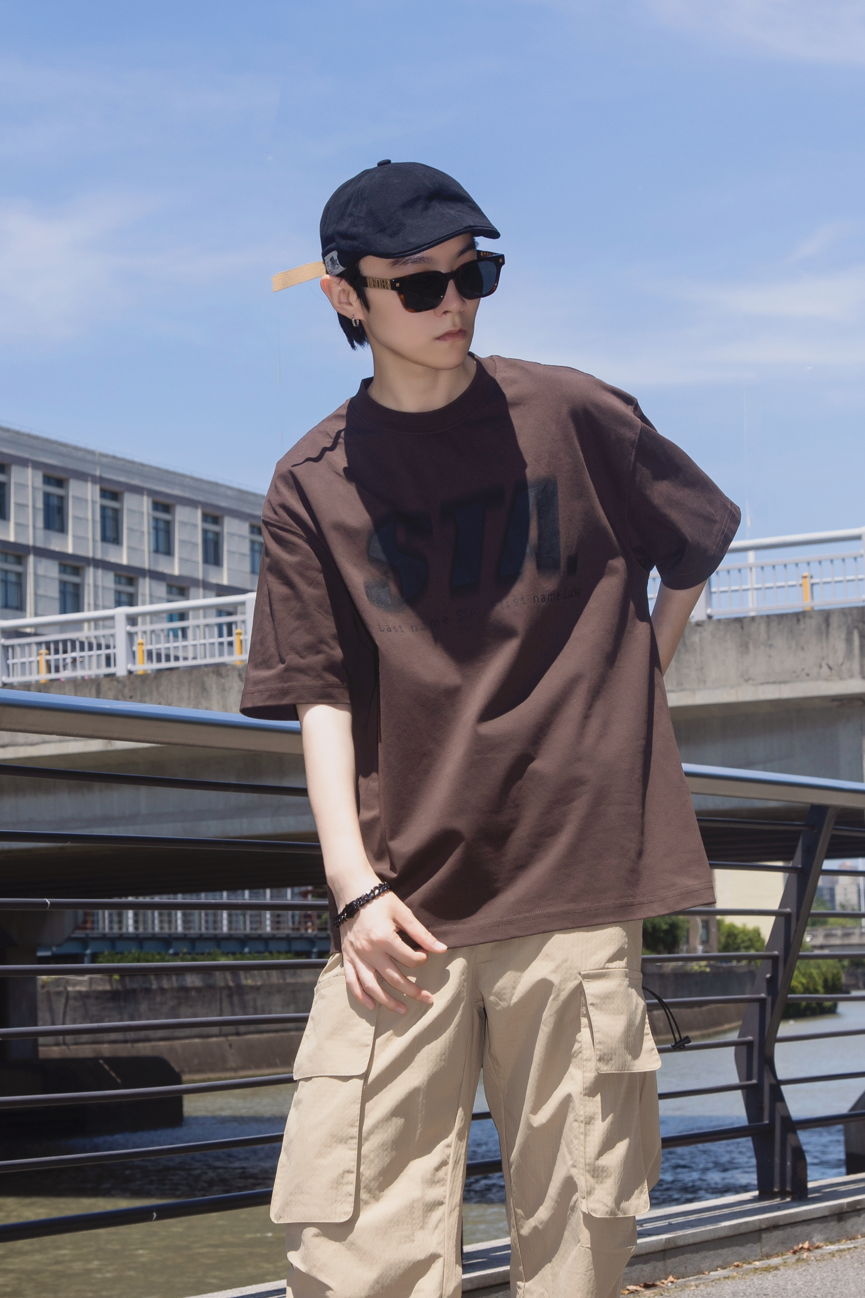 夏日一杯冰拿铁 活力满满一整天 分享一套奶咖味的复古街头穿搭 穿搭指南: 上身一件棕色短袖T恤 宽松的版型搭配黑色字母印花复古随性 下身搭配一条卡其色工装裤 大口袋设计 休闲舒适 很有街头味 戴一顶黑色复古贝雷帽点缀一下 整套大地色系 同色系不同色调搭配很夏天