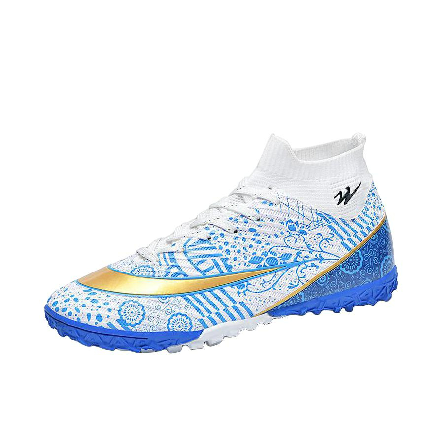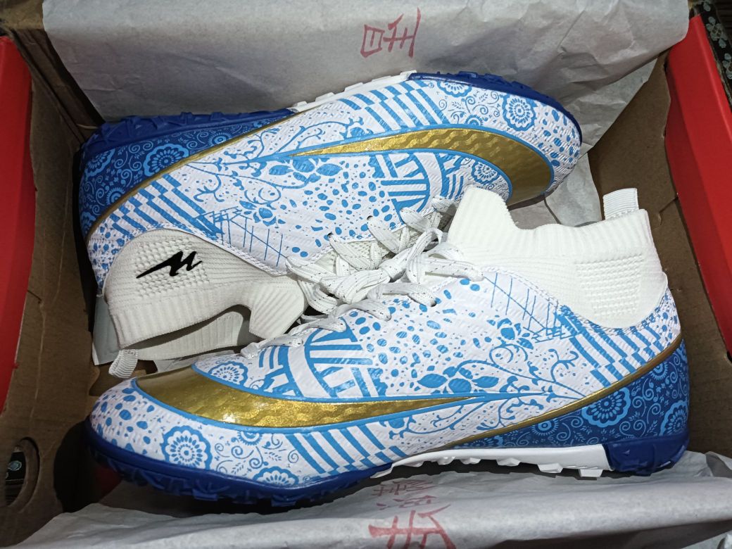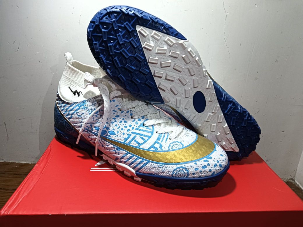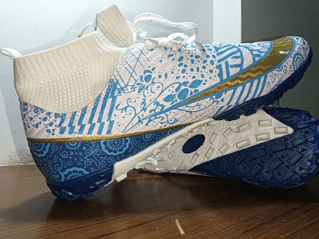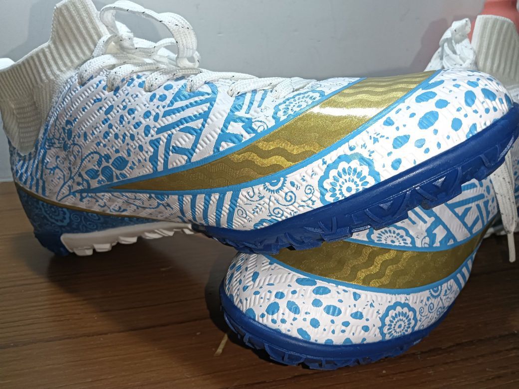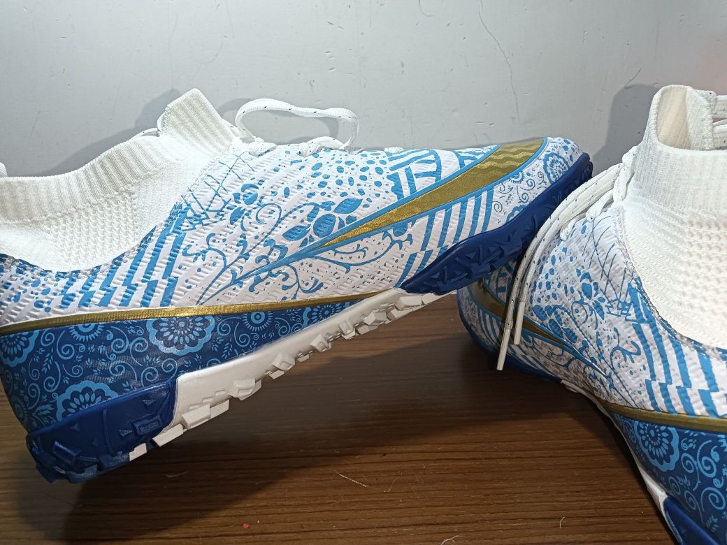 大家好今天给你们带来了一双入门级的足球 鞋 1鞋子的材质 整双鞋子的鞋面材料采用的是皮革的材料有 颗粒感又饱满方便我们清洁 鞋子的颜色主要以蓝白为主很有青春感充满 了夏天在足球场的活力 脚下的钉子主要是碎钉行走在路上啊不容易 打滑方便日常出行 还有袜套的设计不容易鞋子划出去 2尺码选择 我建议脚偏框的包子要记住买大半码或者大 一码,其他的就买正常码就行了 3实战效果 1.这双鞋子的抓地力很强有着更...