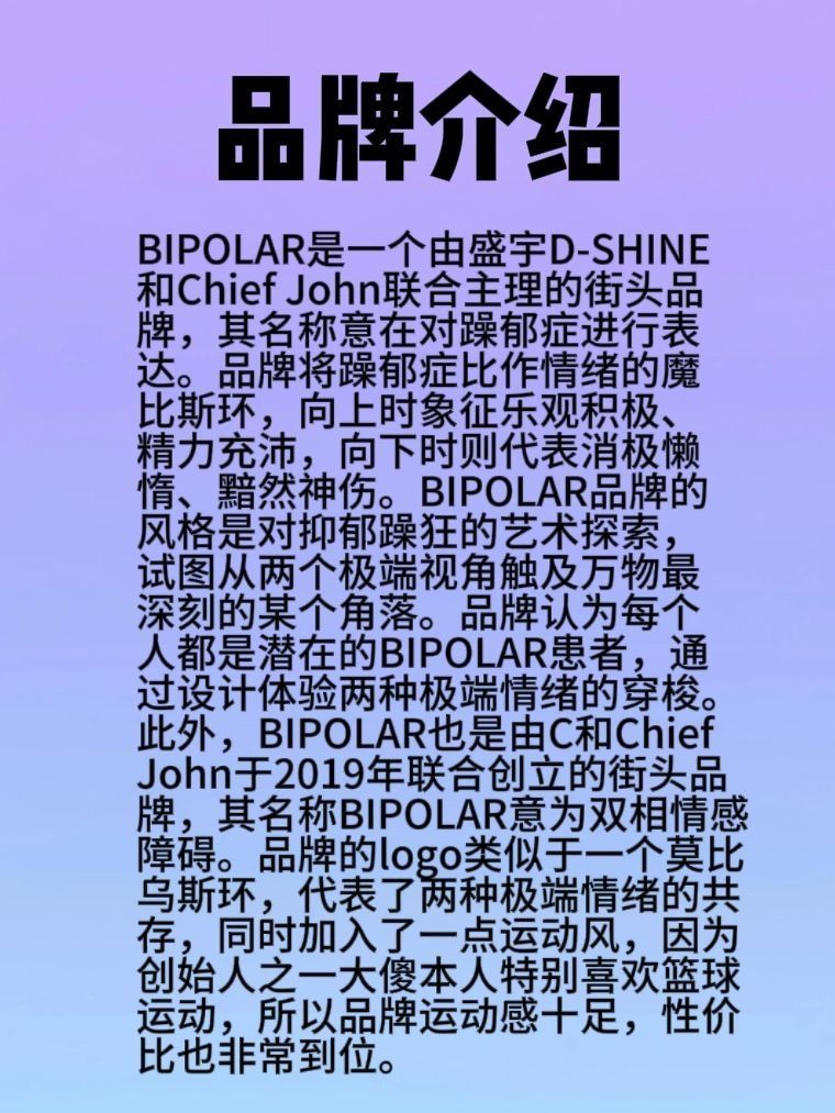 ☘️品牌介绍 BIPOLAR是一个由说唱歌手大傻DamnShine在长沙创立的运动服饰潮牌 。品牌成立于2019年,其名称BIPOLAR意在关注和表达躁郁症,将躁郁症比作情绪的魔比斯环,品牌型格是对抑郁躁狂的艺术探索,从两个极端视角试图触及万物最深刻的某个角落 。 ☘️品牌设计 BIPOLAR品牌的设计融合了街头艺术风格,每个系列都接触了小众、复古文化的根源,并与服装相融合,致力于推出多领域人群...