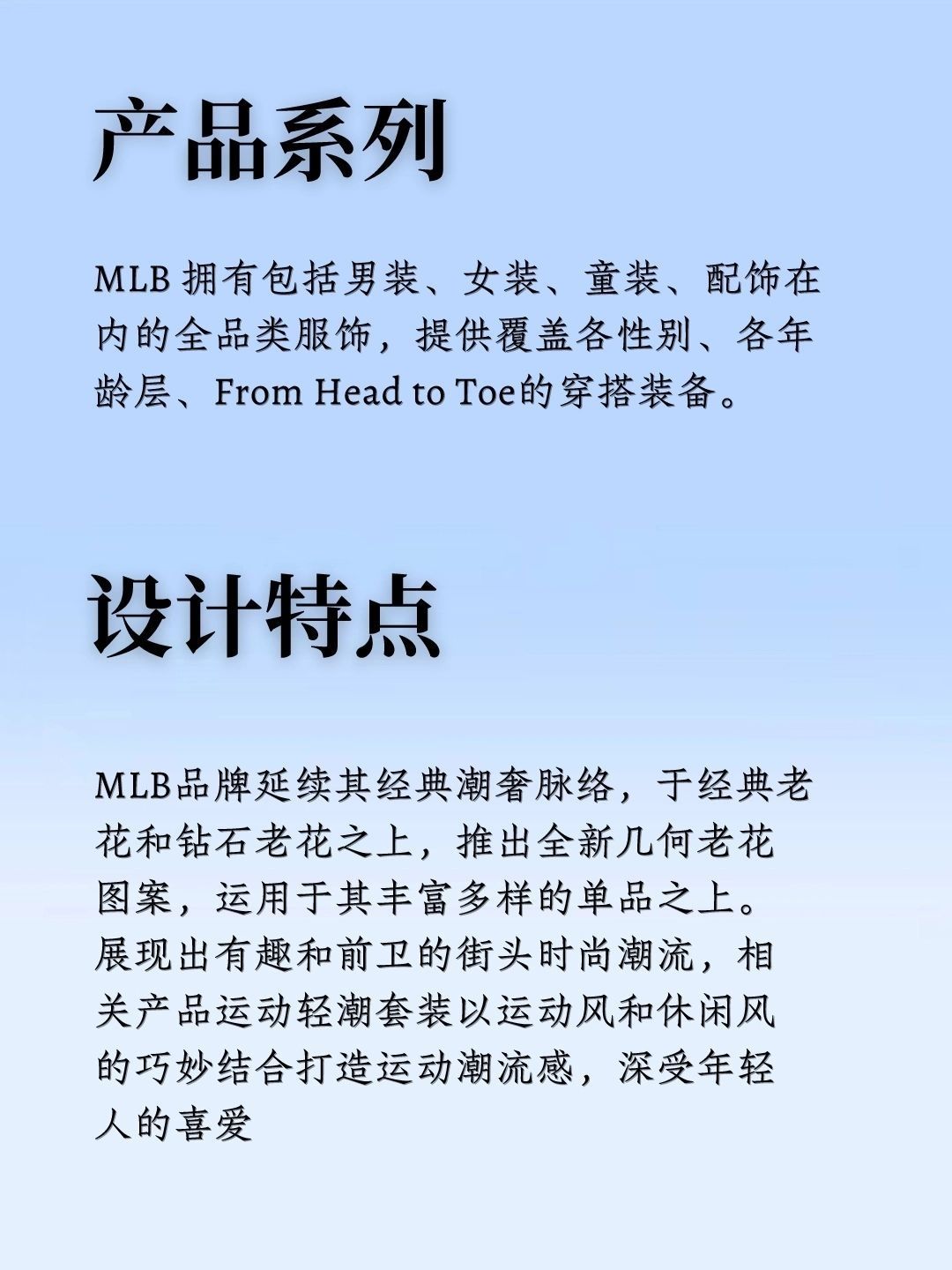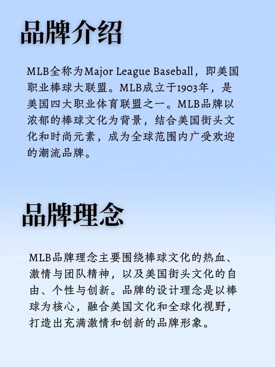 🌟品牌介绍 MLB 全称为 Major League Baseball ,即美国职业棒球大联盟。 MLB 成立于1903年,是美国四大职业体育联盟之一。 MLB 品牌以浓郁的棒球文化为背景,结合美国街头文化和时尚元素,成为全球范围内广受欢迎的潮流品牌。 🌟品牌理念 MLB 品牌理念主要围绕棒球文化的热血、激情与团队精神,以及美国街头文化的自由、个性与创新。品牌的设计理念是以棒球为核心,融合美...