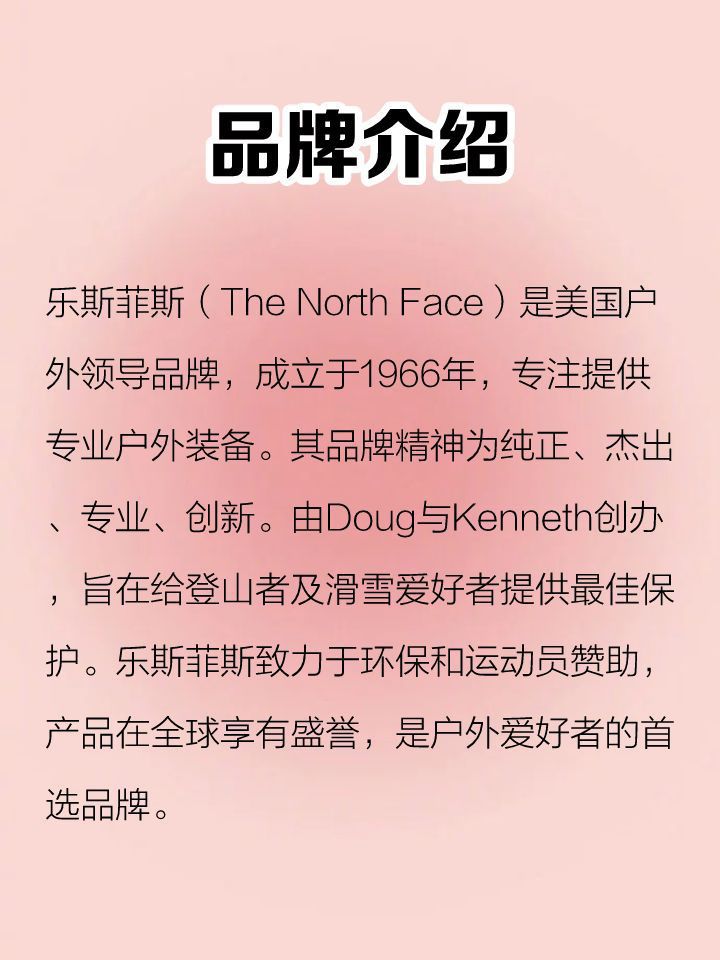 品牌介绍 乐斯菲斯(The North Face)是美国户 外领导品牌,成立于1966年,专注提供 专业户外装备。其品牌精神为纯正、杰出 、专业、创新。由Doug与Kenneth创办 ,旨在给登山者及滑雪爱好者提供最佳保 护。乐斯菲斯致力于环保和运动员赞助, 产品在全球享有盛誉,是户外爱好者的首 选品牌。