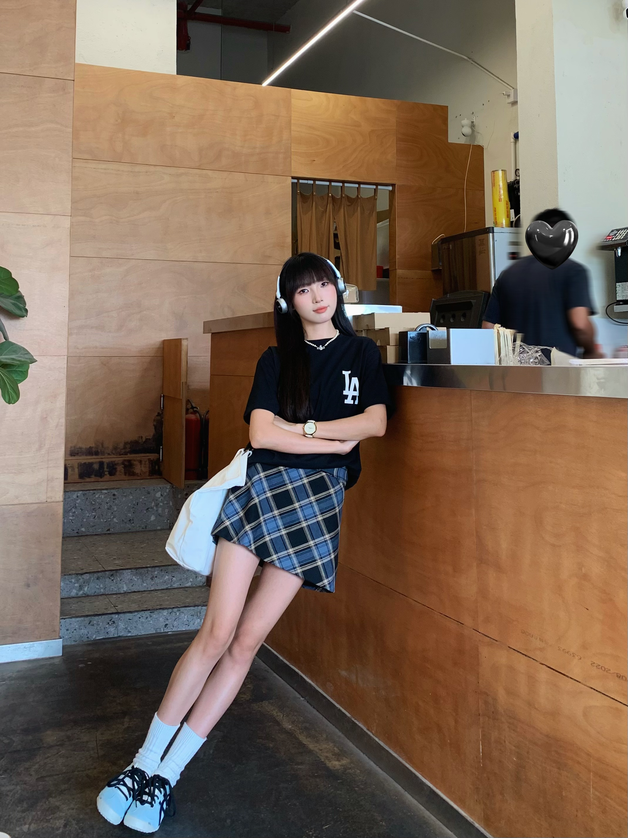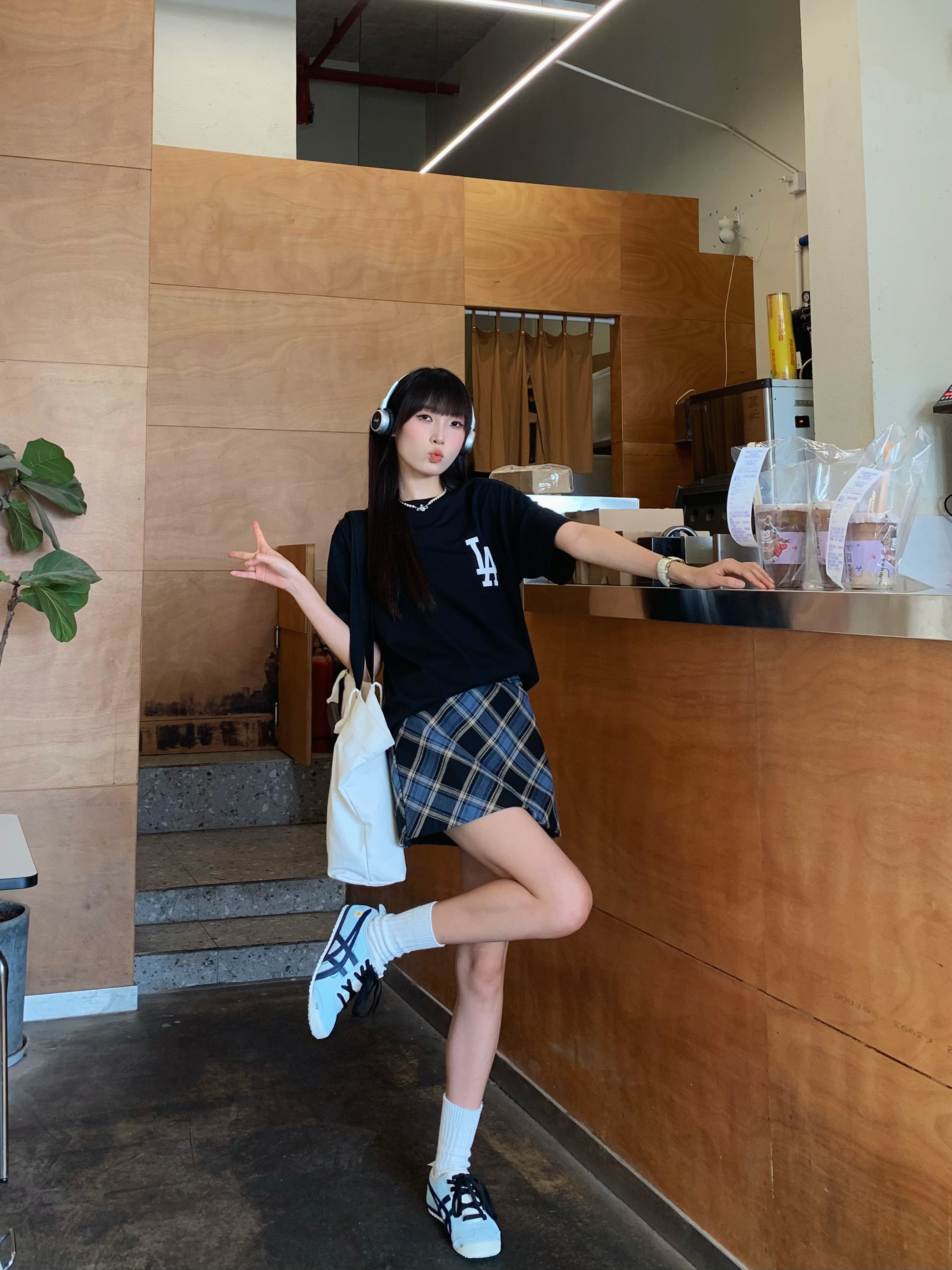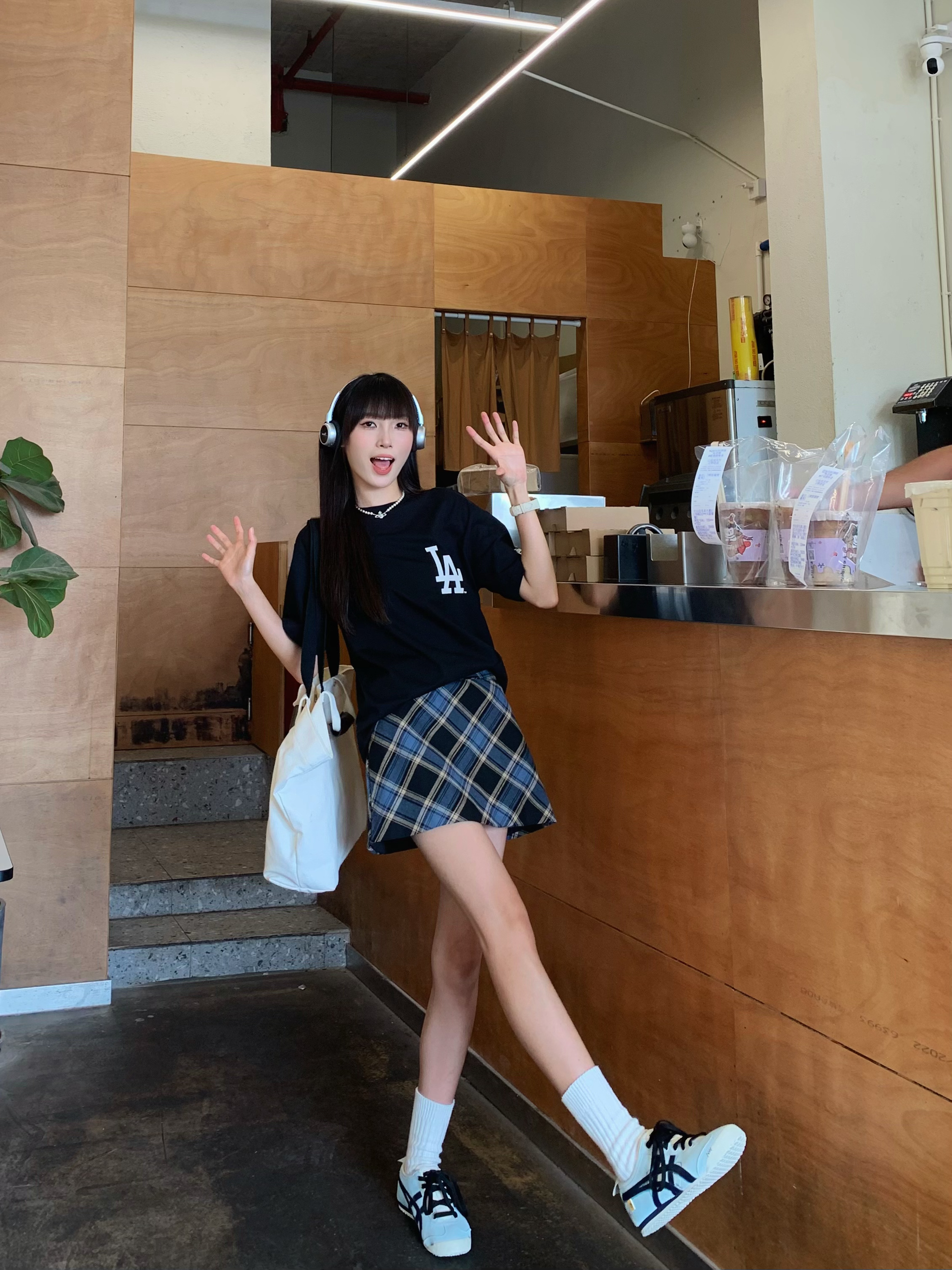 身高|体重: 🧍♂️ 穿搭风格:甜酷少女风 👔 上衣:MLB T恤 👖 下装:格子小短裙