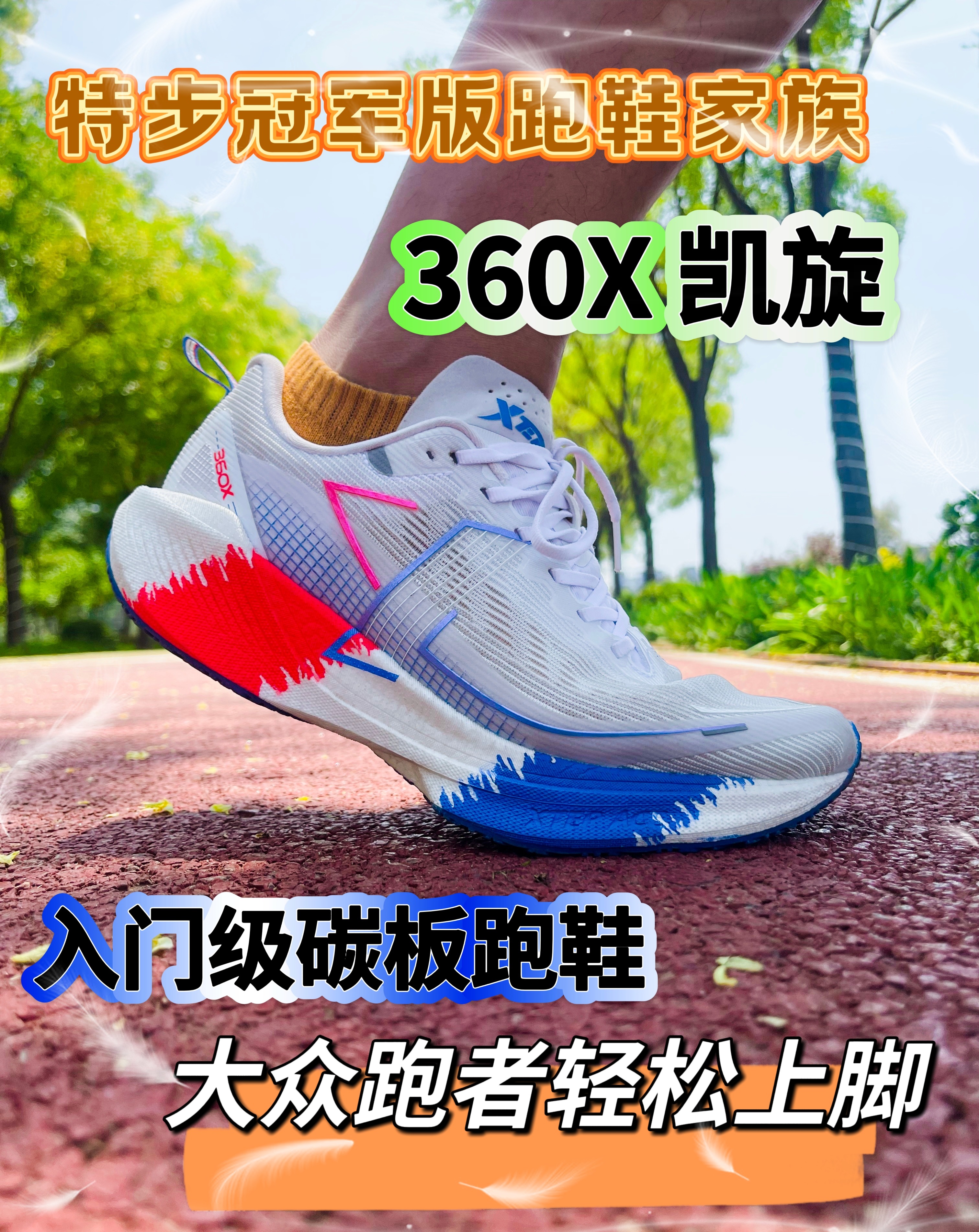 哈喽,大家好,这里是鲤鱼的新鞋开箱 今天分享的是特步360X国民碳板跑鞋 凯旋配色 众所周知,巴黎奥运会即将到来,这款特步的360X整体配色以白色加上红色以及蓝色,整体外观有一种法式浪漫的味道与巴黎奥运会主题相呼应。 鞋面采用了透气性非常不错的飞织材质,中底采用XTEP ACE科技加上镂空的大底加上全掌碳板,鞋子整体给我的感觉回弹效果以及脚感都是不错的。 尺码建议按照正常尺码选择就可以了。