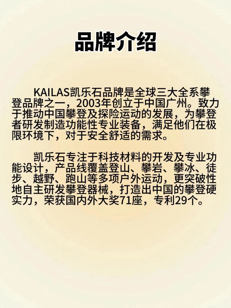 📆品牌介绍: KAILAS凯乐石品牌是全球三大全系攀登品牌之一,2003年创立于中国广州,致力于推动中国攀登及探险运动的发展,为攀登者研发制造功能性专业装备,满足他们在极限环境下,对于安全舒适的需求。凯乐石专注于科技材料的开发及专业功能设计,产品线覆盖登山、攀岩、攀冰、徒步、越野跑山等多项户外运动,更突破性地自主研发攀登器械,打造出中国的攀登硬实力,荣获国内外大奖71座,专利29个。 🏷️品牌口号...