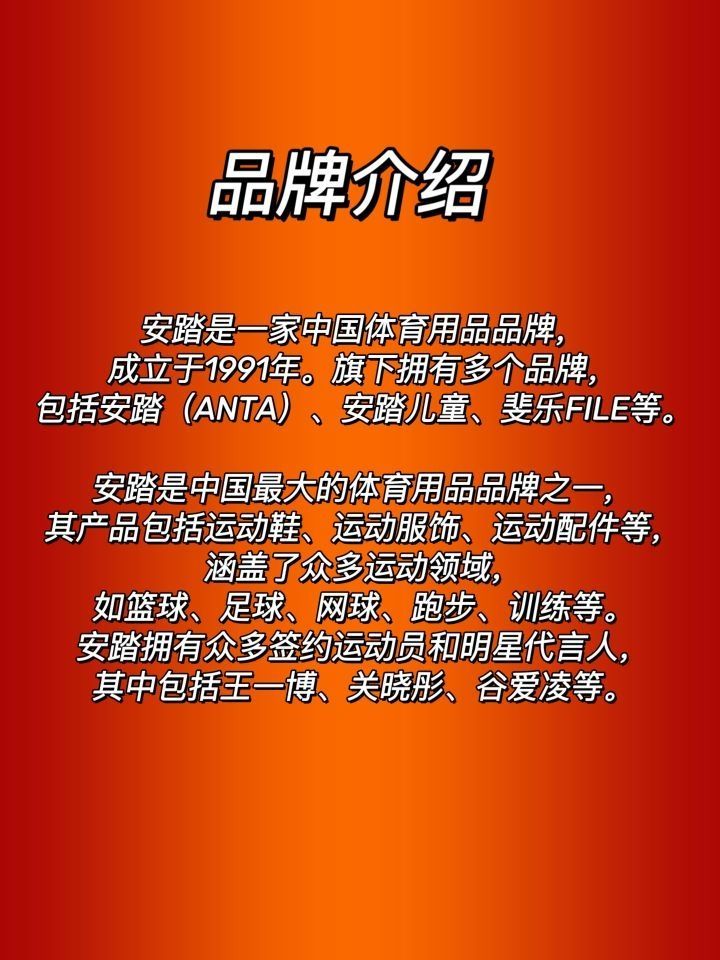 ⭐品牌简介 安踏是一家中国体育用品品牌,成立于1991年。旗下拥有多个品牌,包括安踏(ANTA)、安踏儿童、斐乐FILE等。 安踏是中国最大的体育用品品牌之一,其产品包括运动鞋、运动服饰、运动配件等,涵盖了众多运动领域,如篮球、足球、网球、跑步、训练等。安踏拥有众多签约运动员和明星代言人,其中包括王一博、关晓彤、谷爱凌等。 ⭐产品定位 安踏的产品定位是面向大众的运动品牌,注重提供高品质的运动装...