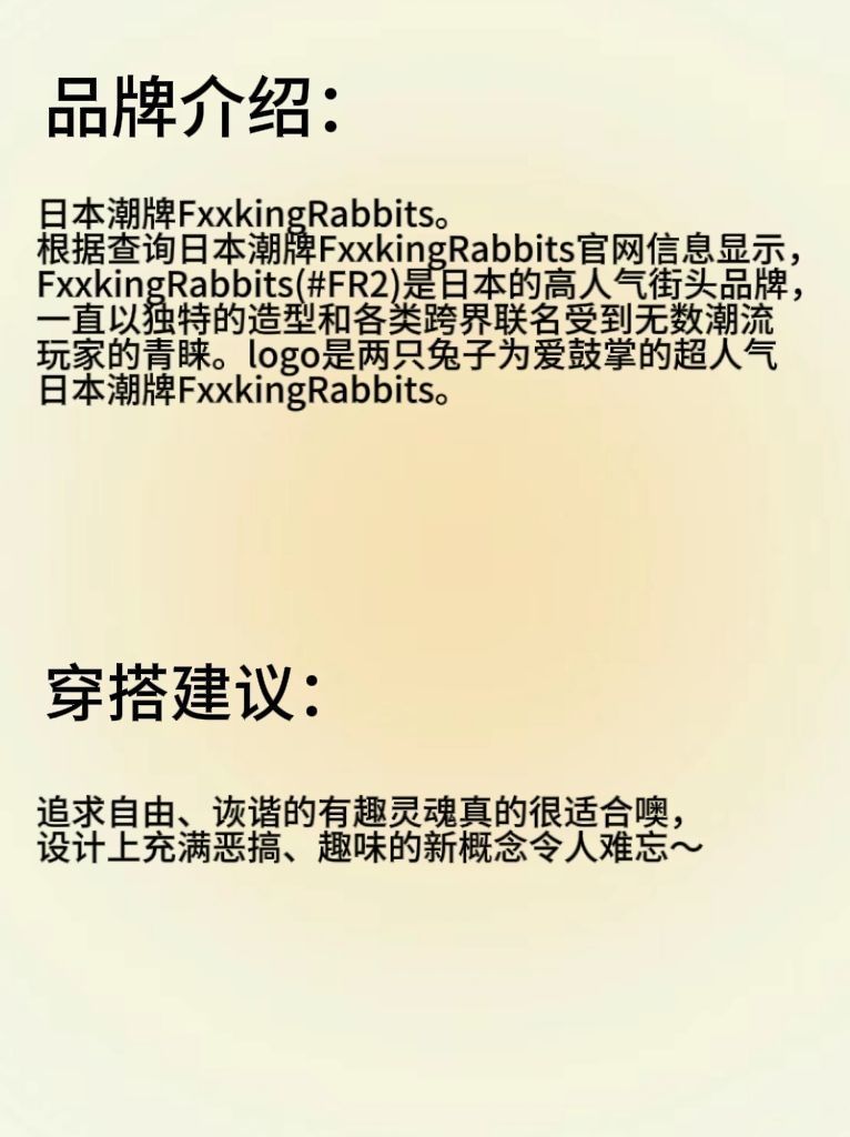 🍑品牌介绍: 日本潮牌FxxkingRabbits。根据查询日本潮牌FxxkingRabbits官网信息显示,FxxkingRabbits(#FR2)是日本的高人气街头品牌,一直以独特的造型和各类跨界联名受到无数潮流玩家的青睐。logo是两只兔子为爱鼓掌的超人气日本潮牌FxxkingRabbits。 🍒穿搭建议: 追求自由、诙谐的有趣灵魂真的很适合噢,设计上充满恶搞、趣味的新概念令人难忘~