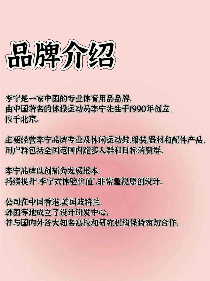 每天认识一个品牌|李宁品牌介绍 李宁是一家中国的专业体育用品品牌,由中国著名的体操运动员李宁先生于1990年创立,位于北京。 主要经营李宁品牌专业及休闲运动鞋服装、器材和配件产品,用户群包括全国范围内跑步人群和目标消费群。 李宁品牌以创新为发展根本,持续提升“李宁式体验价值”,非常重视原创设计。 公司在中国香港美国波特兰韩国等地成立了设计研发中心,并与国内外各大知名高校和研究机构保持密切合作...