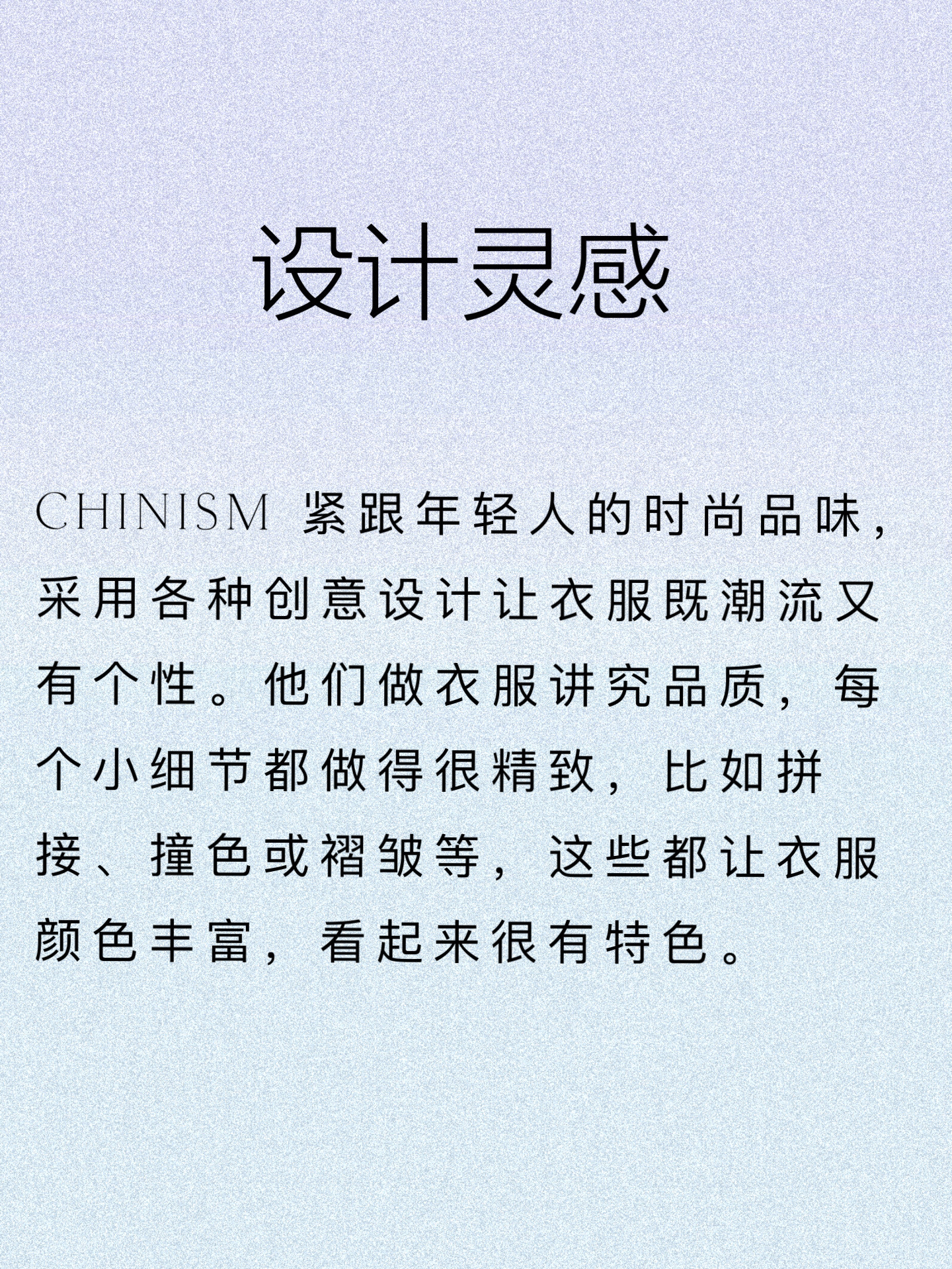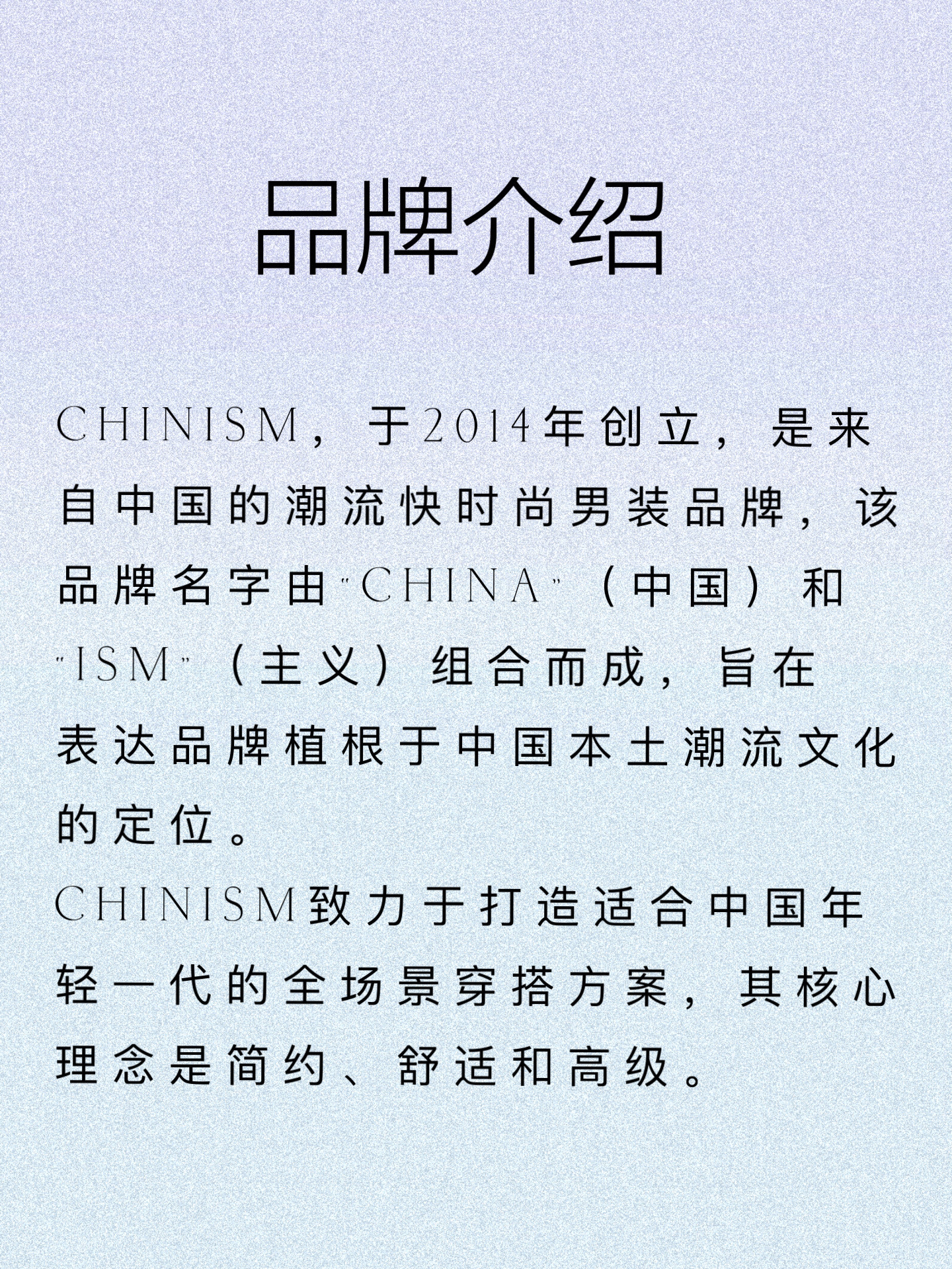 ✨品牌介绍 CHINISM,于2014年创立,是来自中国的潮流快时尚男装品牌,该品牌名字由CHINA,(中国)和ISM(主义)组合而成,旨在表达品牌植根于中国本土潮流文化的定位。 CHINISM致力于打造适合中国年轻一代的全场景穿搭方案,其核心理念是简约、舒适和高级。 ✨ 品牌特点 CHINISM 专注于将中国传统文化融入产品设计之中,通过时尚、简约且实用的艺术风格,展现传统元素的魅力,并使之在当...