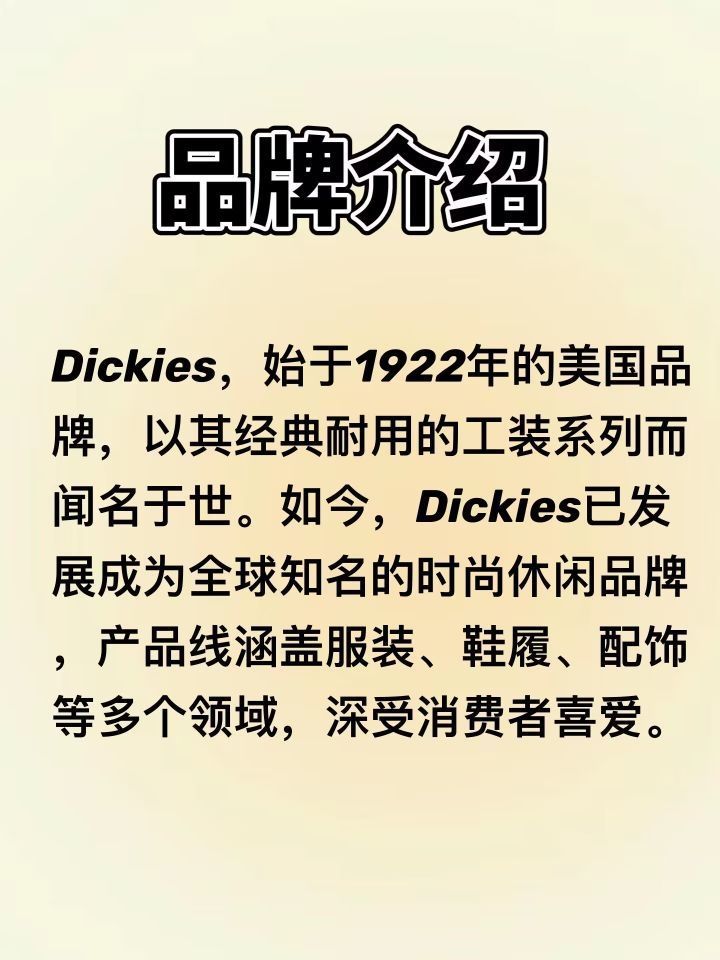 每天认识一个品牌 | Dickies 一、品牌介绍 Dickies,始于1922年的美国品牌,以其经典耐用的工装系列而闻名于世。自诞生以来,Dickies始终致力于提供高品质、舒适耐用的服装产品,为劳动者们打造专业的工装选择。如今,Dickies已发展成为全球知名的时尚休闲品牌,产品线涵盖服装、鞋履、配饰等多个领域,深受消费者喜爱。 二、品牌理念 Dickies的品牌理念是“经典、耐用、时尚”...