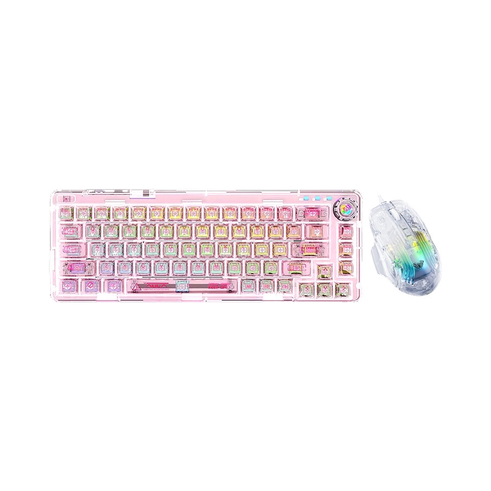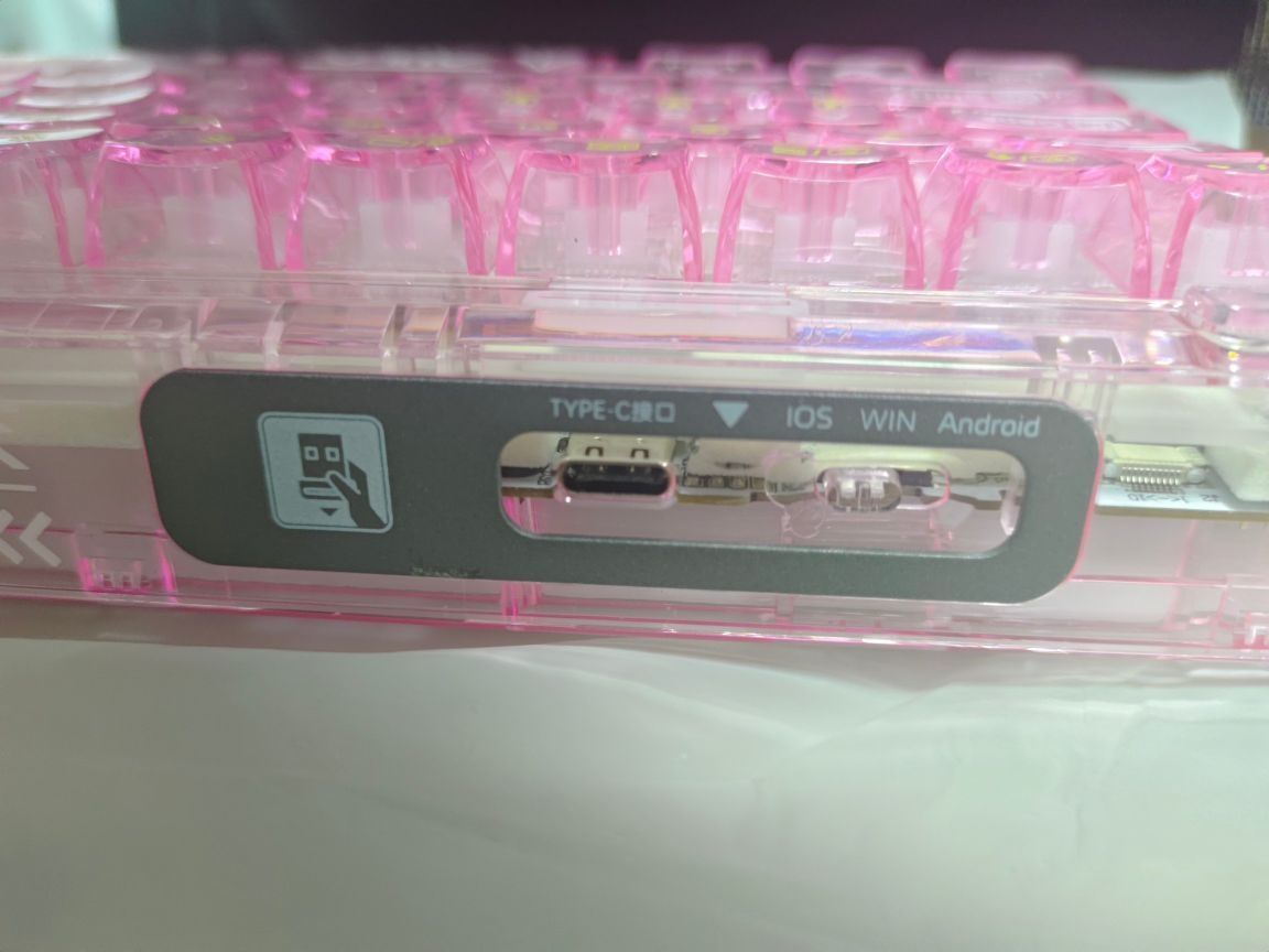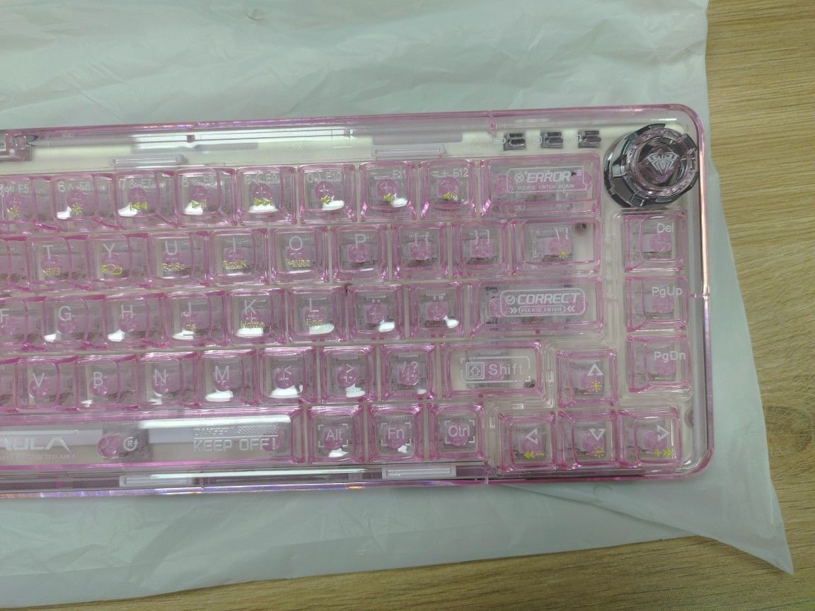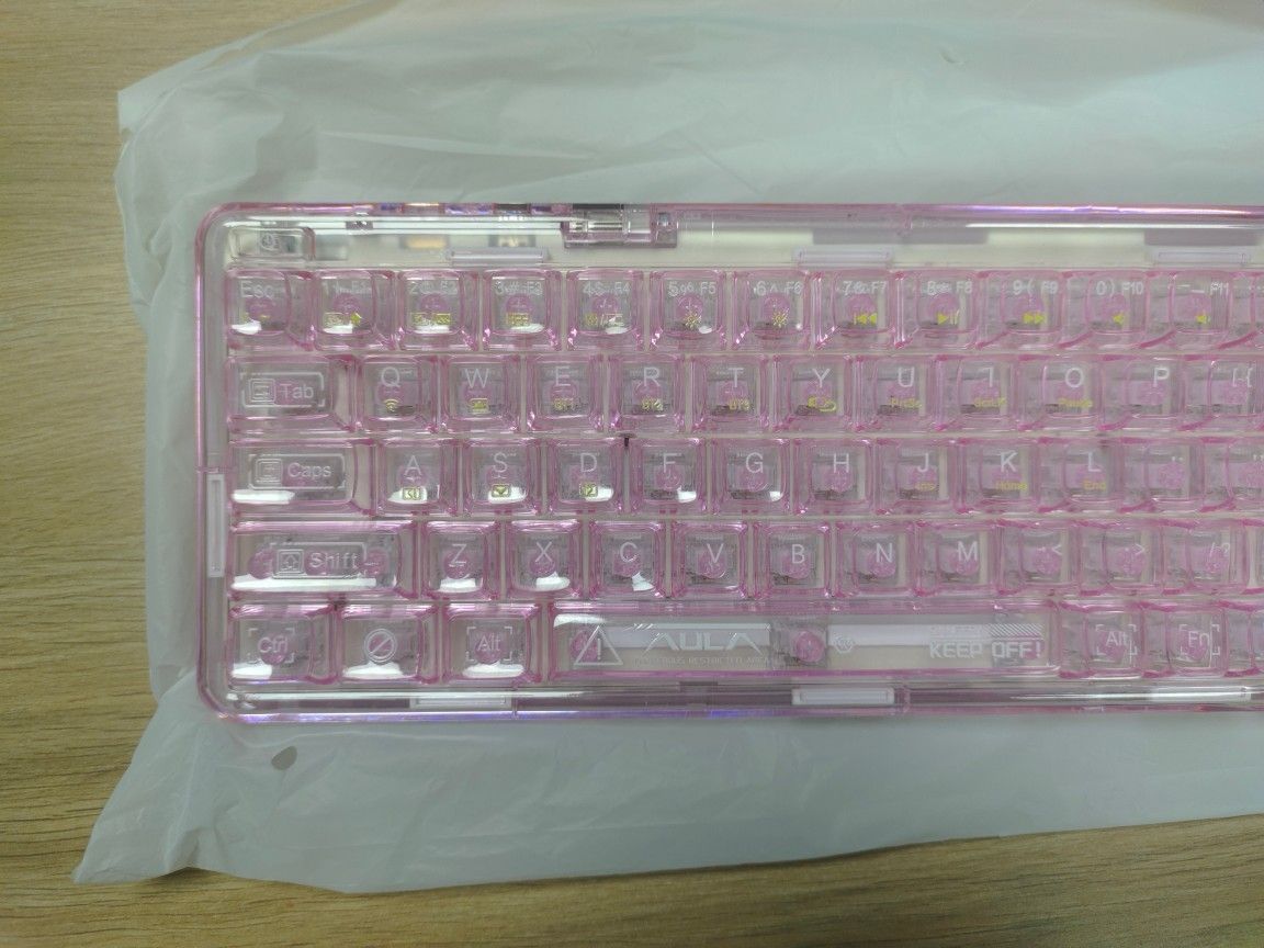 这是狼蛛F68 粉透 冰晶轴 68键 粉色加上透明的设计真的很好看,造型做的也很可爱 但是有一个缺点,就是没有数字小键盘