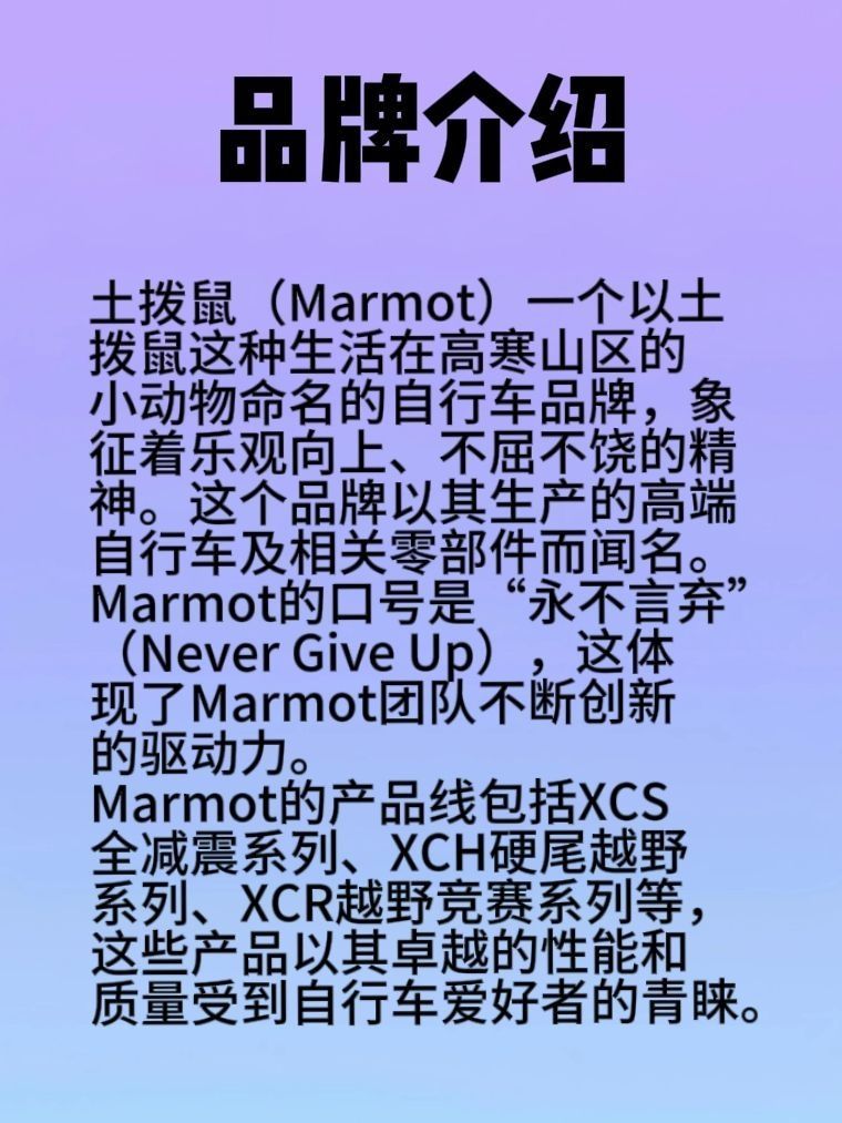 ☘️品牌介绍 土拨鼠(Marmot)是一个以土拨鼠这种生活在高寒山区的小动物命名的自行车品牌,象征着乐观向上、不屈不饶的精神。这个品牌以其生产的高端自行车及相关零部件而闻名。 ☘️品牌成立 Marmot品牌由美国高端自行车品牌CANNONDALE的前任总裁等人在2009年联合创立。Marmot专注于生产27.5英寸/650B山地自行车,并致力于成为该尺寸山地自行车的王者品牌。 ☘️品牌口号 M...