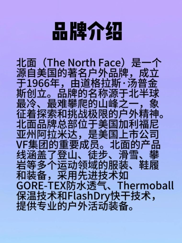 🌸🌸每天认识一个品牌-北面 ☘️品牌介绍 北面(The North Face)是一家美国户外运动装备品牌,成立于1966年,由道格拉斯·汤普金斯(Douglas Tompkins)创立。品牌名称来源于山脉中最为艰难和寒冷的北坡,象征着探索最严酷环境的决心和勇气。 ☘️品牌系列 北面以生产高质量的户外运动装备、服装和鞋类而闻名,包括帐篷、背包、羽绒服、徒步鞋等。 ☘️品牌产品 品牌的产品以其耐...