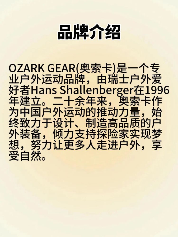 📆品牌介绍: OZARK GEAR(奥索卡)是一个专业户外运动品牌,由瑞士户外爱好者Hans Shallenberger在1996年建立。二十余年来,奥索卡作为中国户外运动的推动力量,始终致力于设计、制造高品质的户外装备,倾力支持探险家实现梦想,努力让更多人走进户外,享受自然。 🏷️品牌理念: 改变你的生活方式 🔆品牌价值观: 奥索卡代表着最纯粹的户外精神,提倡体验自然和挑战户外的精神。 📚品牌故...