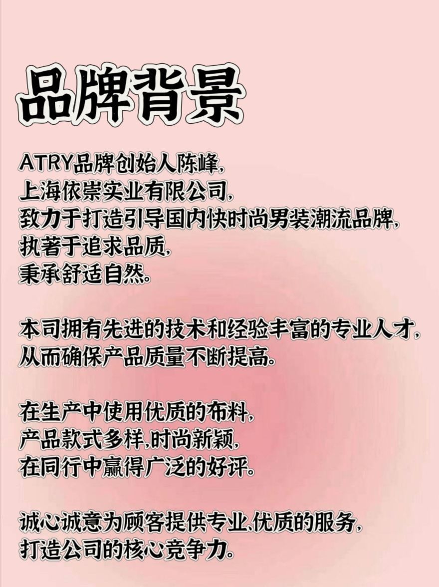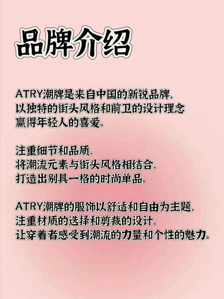 ✨品牌介绍 ATRY潮牌是来自中国的新锐品牌,以独特的街头风格和前卫的设计理念赢得年轻人的喜爱。注重细节和品质,将潮流元素与街头风格相结合,打造出别具一格的时尚单品。 ATRY潮牌的服饰以舒适和自由为主题,注重材质的选择和剪裁的设计,让穿着者感受到潮流的力量和个性的魅力。 ✨品牌背景 ATRY品牌创始人陈峰,上海依崇实业有限公司。致力于打造引导国内快时尚男装潮流品牌,执著于追求品质,秉承舒适自...