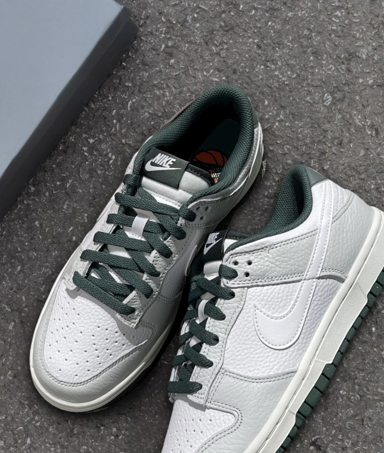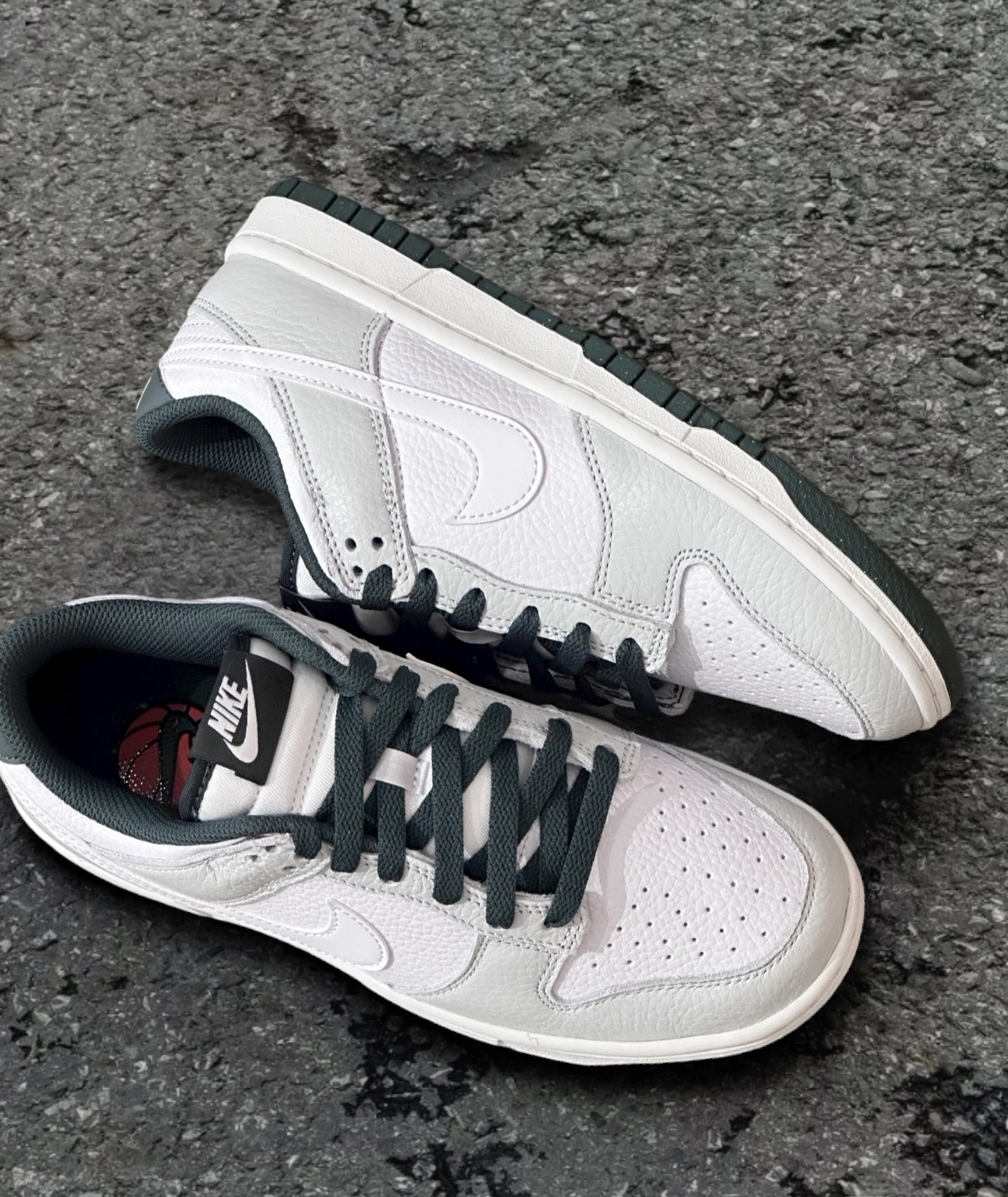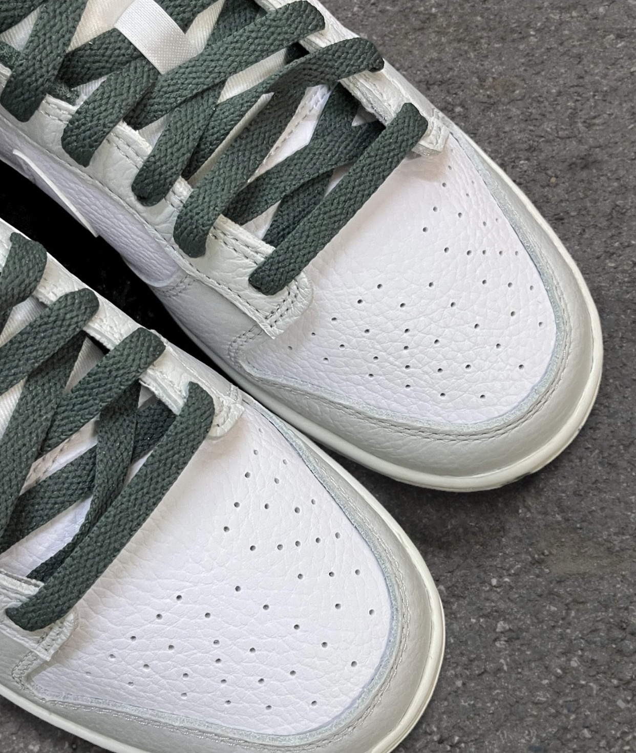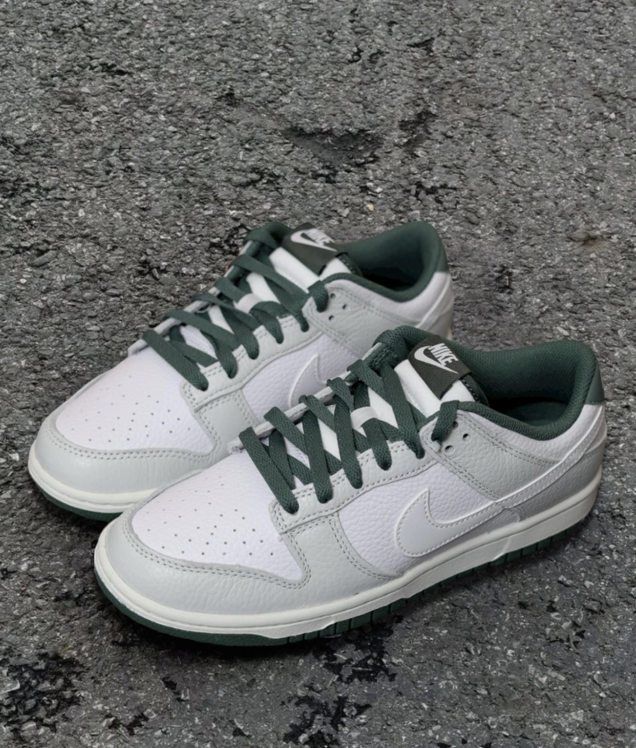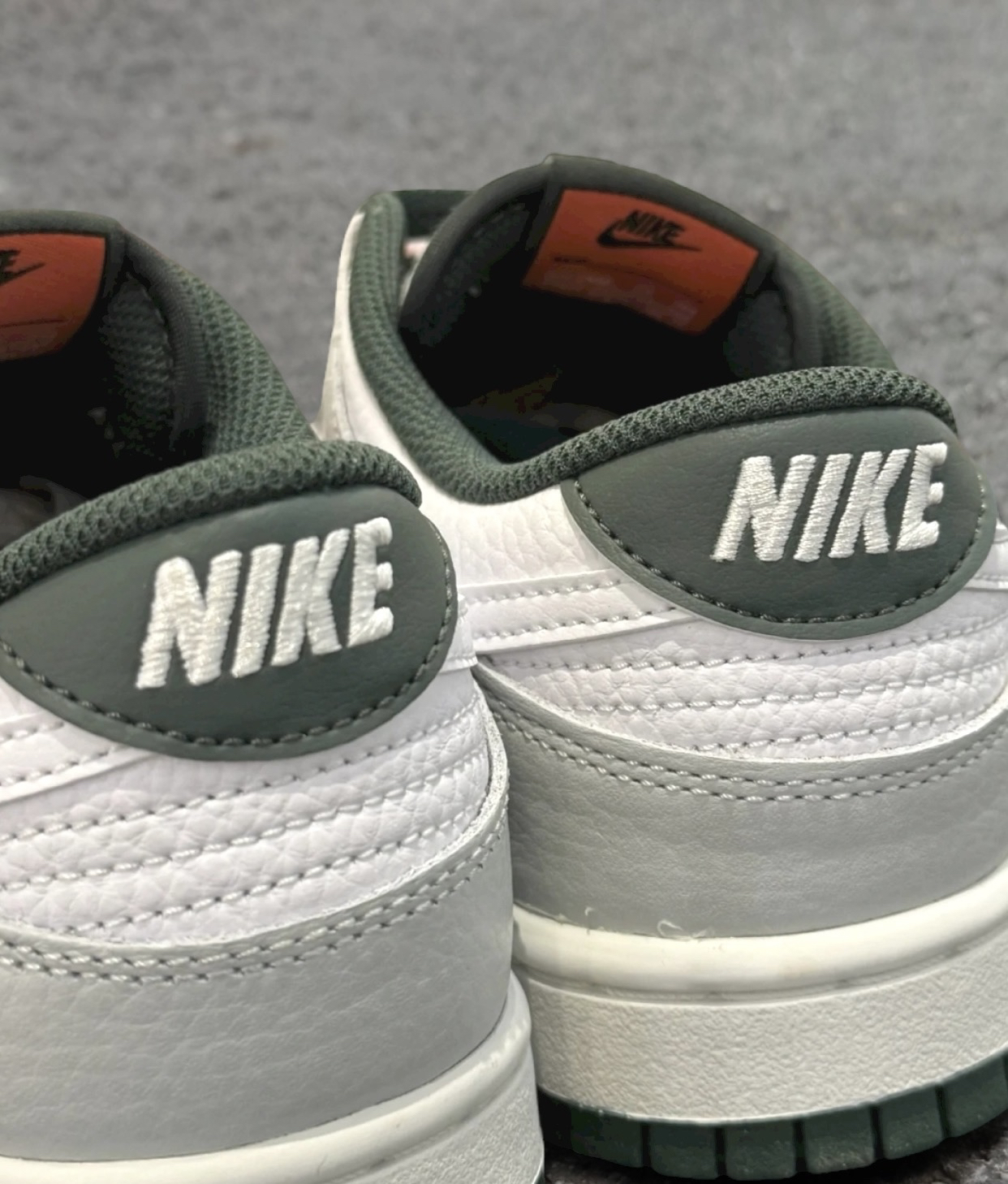 这双白灰绿的dunk是要向空军靠齐了吗?不用于普通合成革,这双居然是荔枝纹的 质感满满的,手感很棒柔软又细腻,不会开裂配色也是我喜欢的复古帅气,主打时尚休闲白色鞋面搭配灰色框架,暗调的橄榄绿巨复古简直帅炸了!!简单搭配牛仔裤、休闲裤都行穿着脚感还行,不会太硬,穿着穿着就习惯了 尺码不偏码正常穿就好,不挤脚很灵活