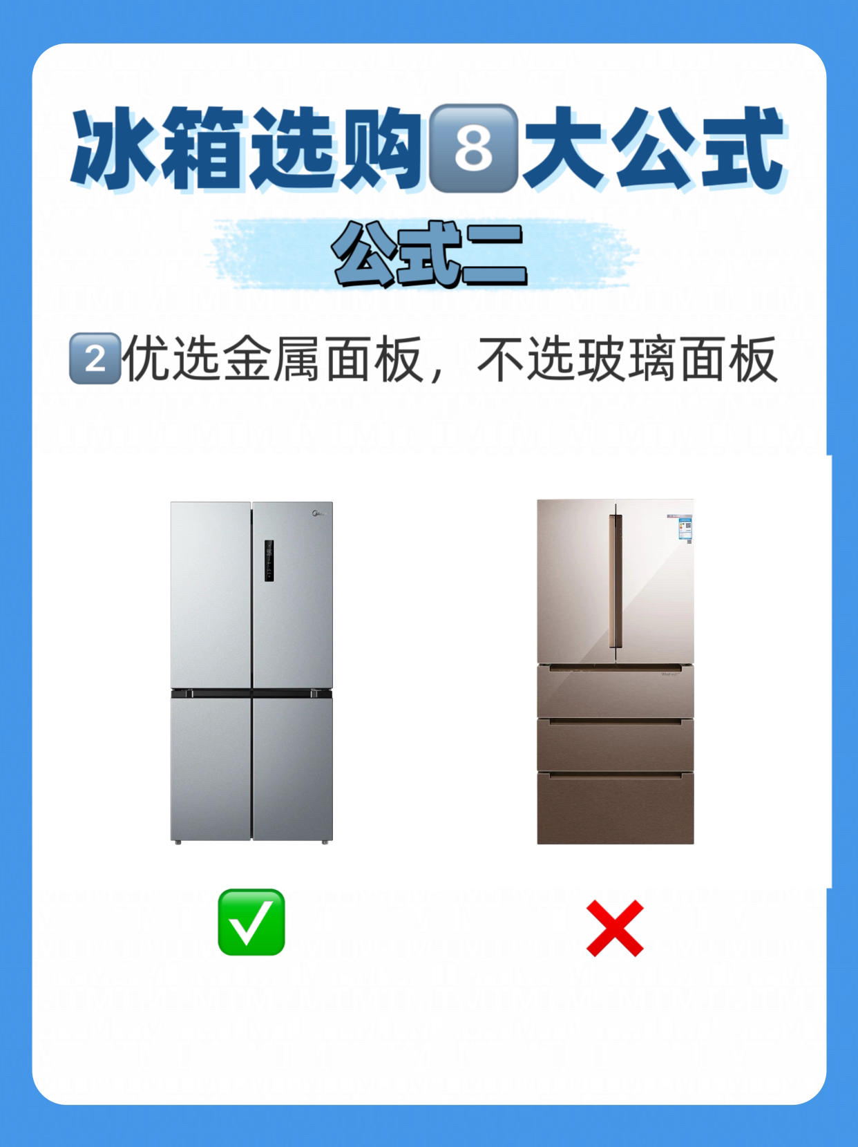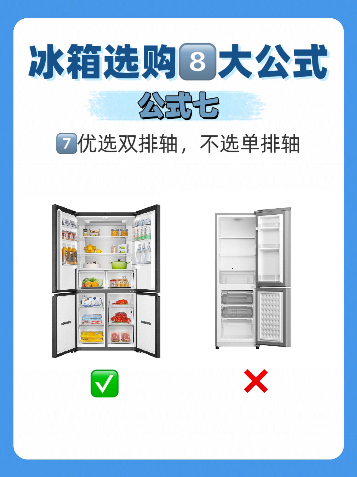今天用这八招,帮你选到心仪又好用的冰箱,增添你的家庭幸福感💯 1⃣️优选十字门,不选双开门 十字门冰箱设计合理,分区收纳空间利用率高,保鲜效果更佳。双开门冰箱虽然方便取物,但是不容易方便收纳,开关容易泄漏冷气,温控难也更耗电。 2⃣️优选金属面板,不选玻璃面板 金属面板耐用、易清洁,不易有划痕。玻璃面板虽然美观,但容易留下指纹和划痕,碎裂难维修。 3⃣️ 优选双循环,不选单循环 双循环冰箱的冷藏和...