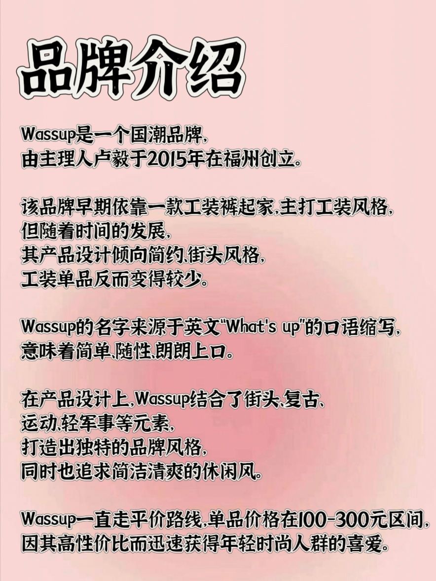 ✨品牌介绍 Wassup是一个国潮品牌,由主理人卢毅于2015年在福州创立。 该品牌早期依靠一款工装裤起家,主打工装风格,但随着时间的发展,其产品设计倾向简约、街头风格,工装单品反而变得较少。 Wassup的名字来源于英文“What's up”的口语缩写,意味着简单、随性、朗朗上口。 在产品设计上,Wassup结合了街头、复古、运动、轻军事等元素,打造出独特的品牌风格,同时也追求简洁清爽的休...