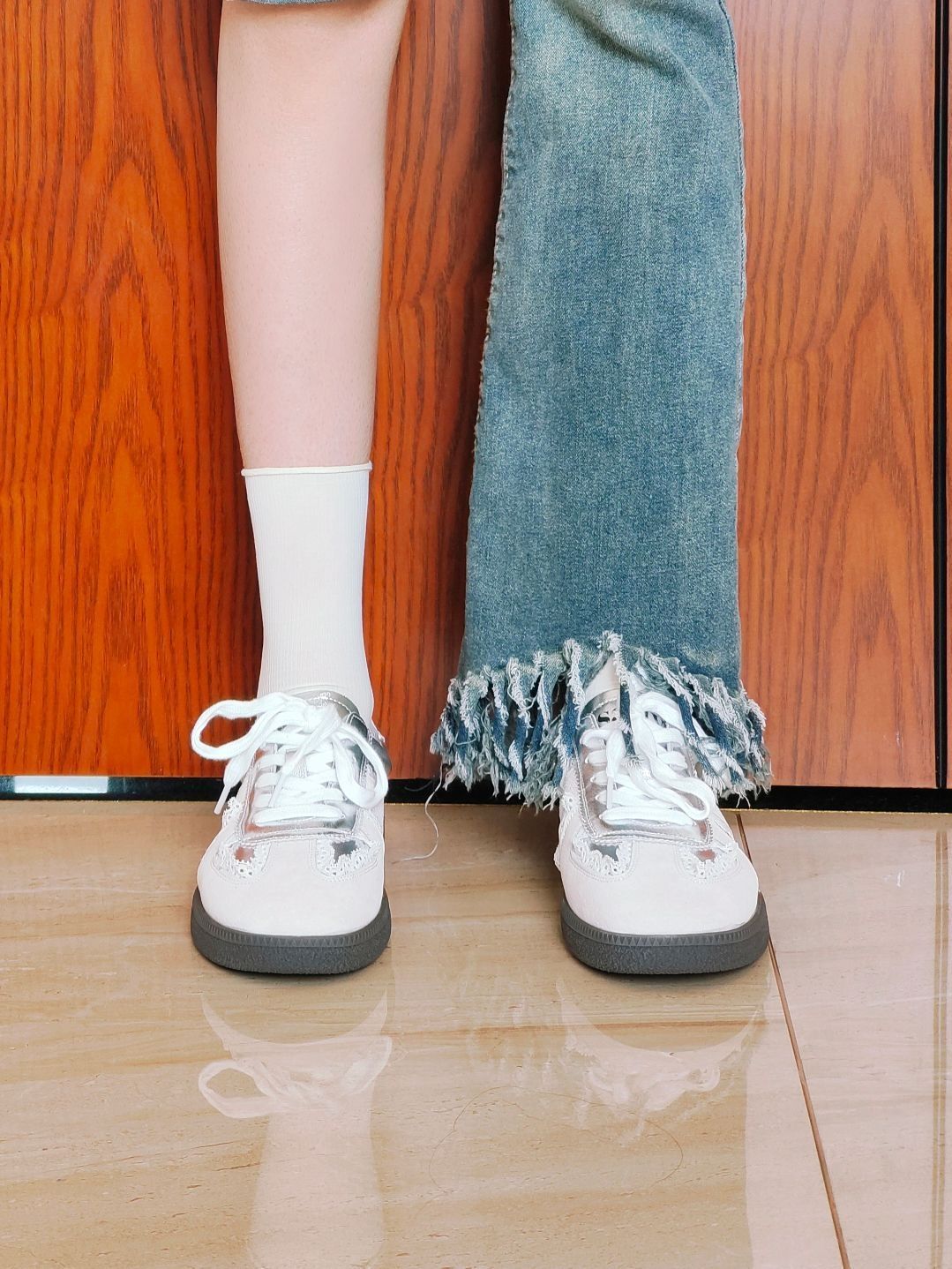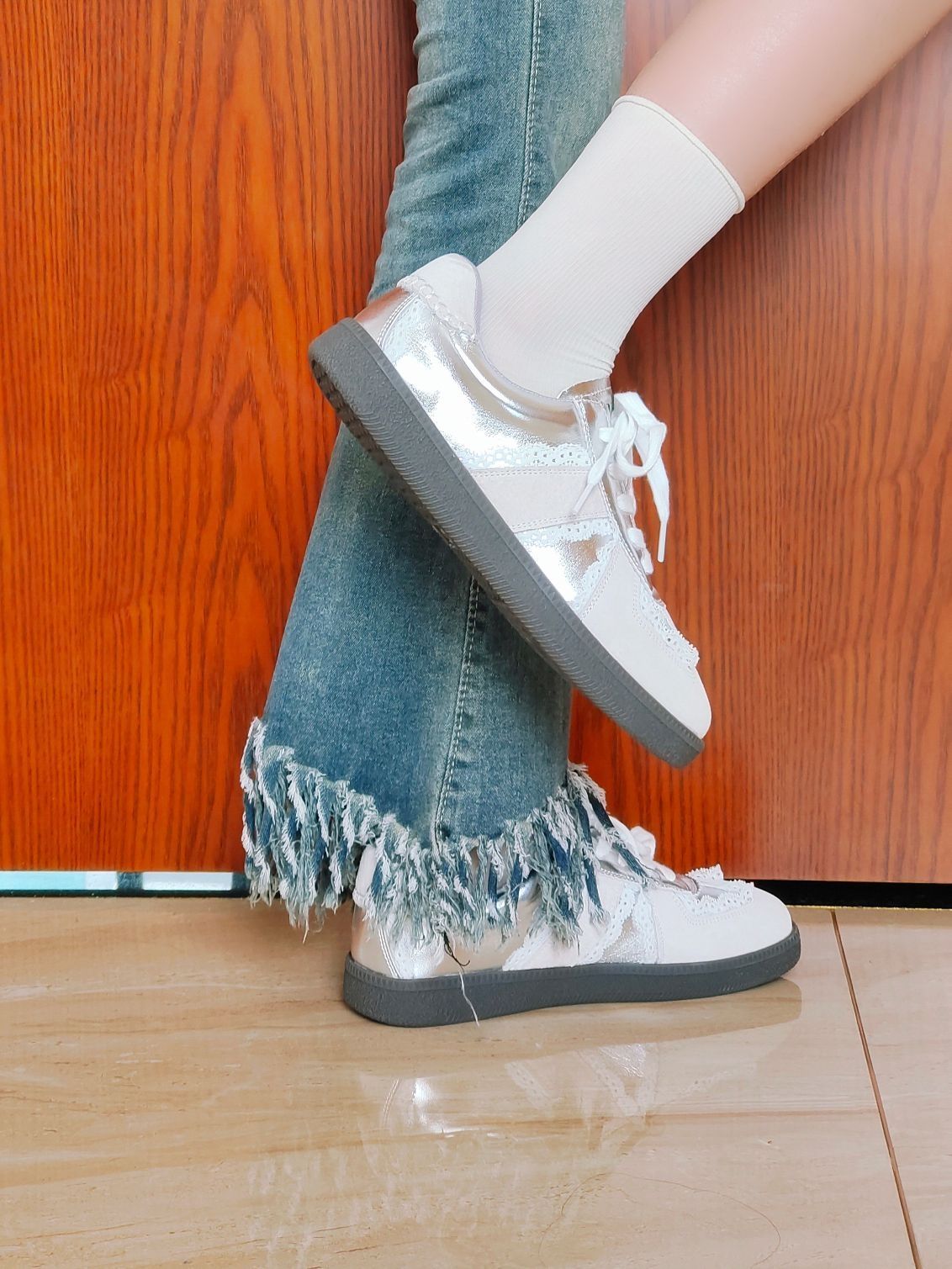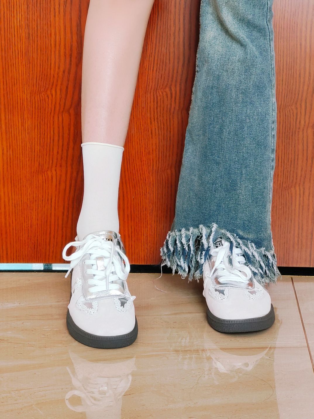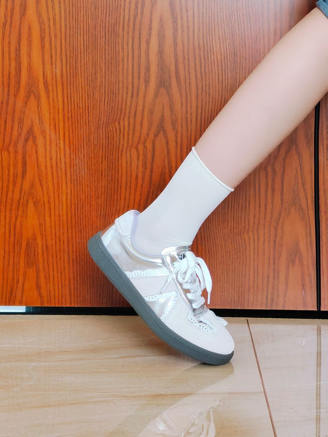 这款索菲娅家的银色芭蕾风的德训鞋吼米呀,有一种冷清感 上脚很舒服,不像其他德训鞋那样很硬的底 尺码是正码的哦 像我一样搭配一条阔腿牛仔裤就很好看啦,或者搭配一条小香风裙子也很好看 毕业季送朋友也很不错哦