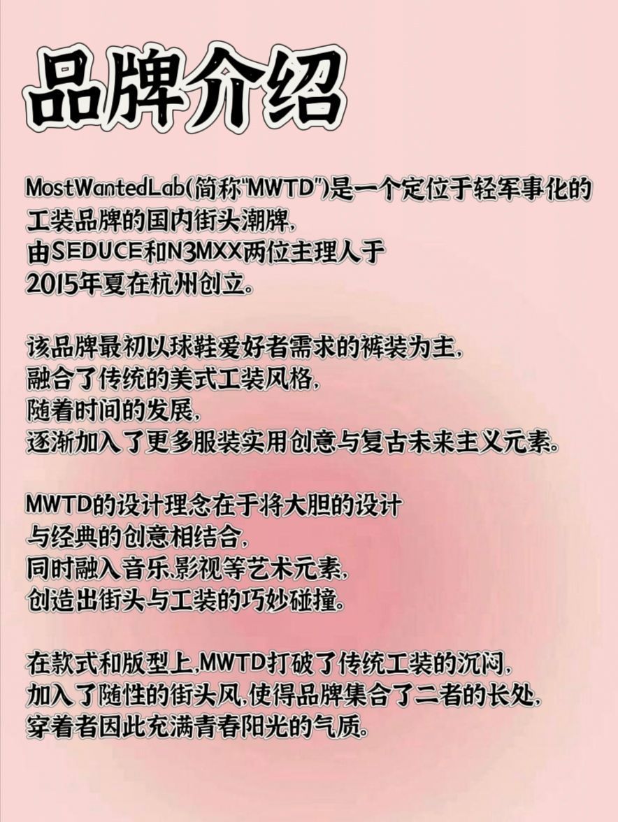 ✨品牌介绍 MostWantedLab(简称“MWTD”)是一个定位于轻军事化的工装品牌的国内街头潮牌,由SEDUCE和N3MXX两位主理人于2015年夏在杭州创立。 该品牌最初以球鞋爱好者需求的裤装为主,融合了传统的美式工装风格,随着时间的发展,逐渐加入了更多服装实用创意与复古未来主义元素。 MWTD的设计理念在于将大胆的设计与经典的创意相结合,同时融入音乐、影视等艺术元素,创造出街头与工装...