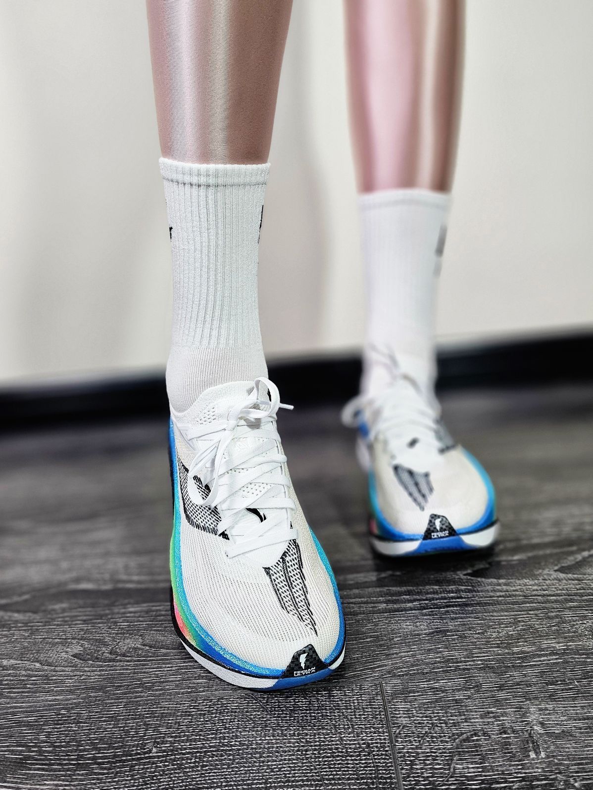 旗舰级的跑鞋,这款标准白是首发配色,鞋盒是仪式感很强,感觉很高大上的黑色箱子,后续配色就是普通的鞋盒了! 鞋面材质是䨻丝,重量还是很轻的,单只200多克。中底䨻弜双层缓震,全掌异形碳板,配置绝对旗舰级别!助推感和前冲感是非常明显的,但是普通人是没法穿的,上脚很不稳,走路往前倒啊!日常穿就别想了,不是精英级别的跑者也基本上不适合,普通跑者还是飞电4c更合适!