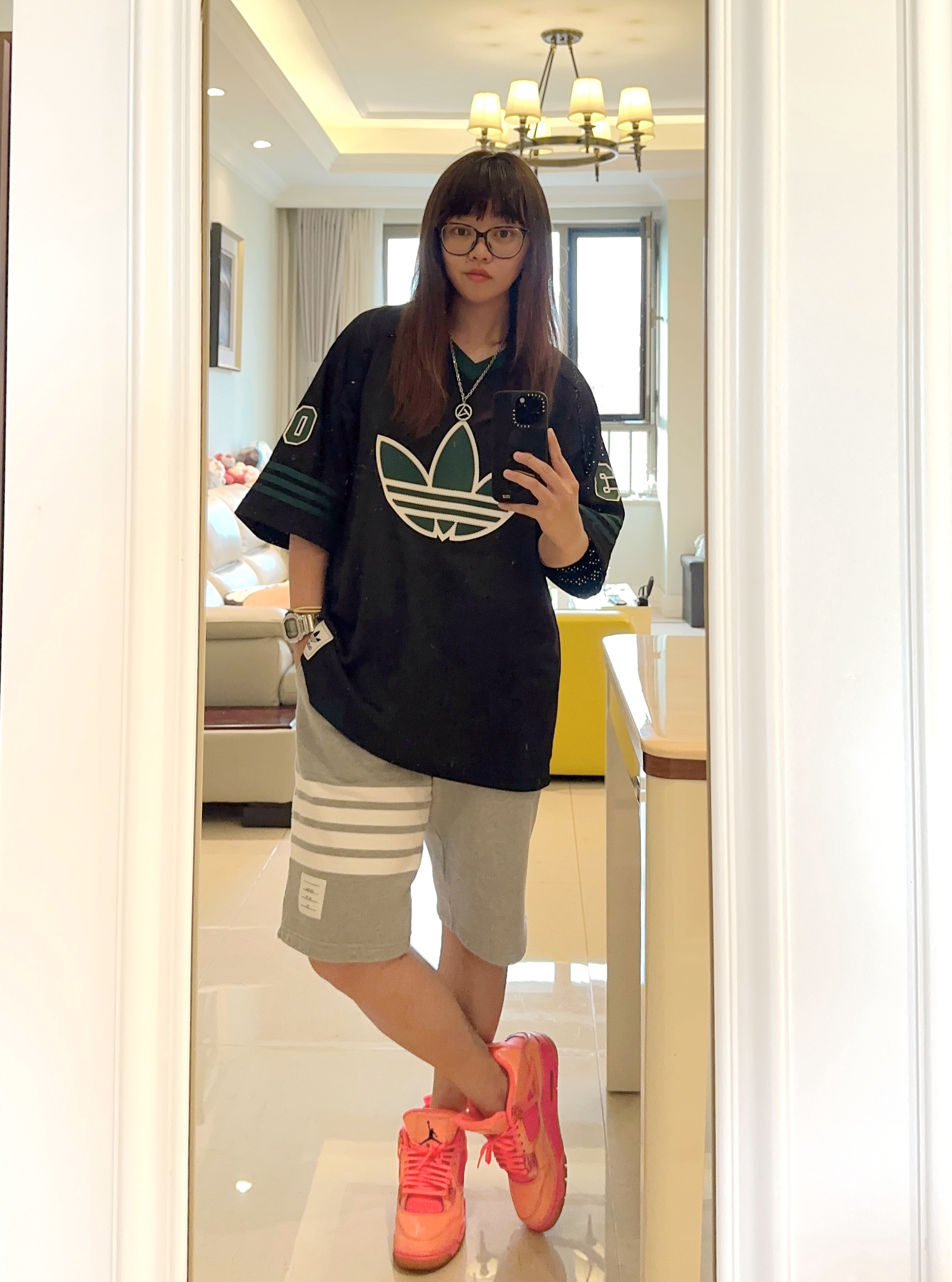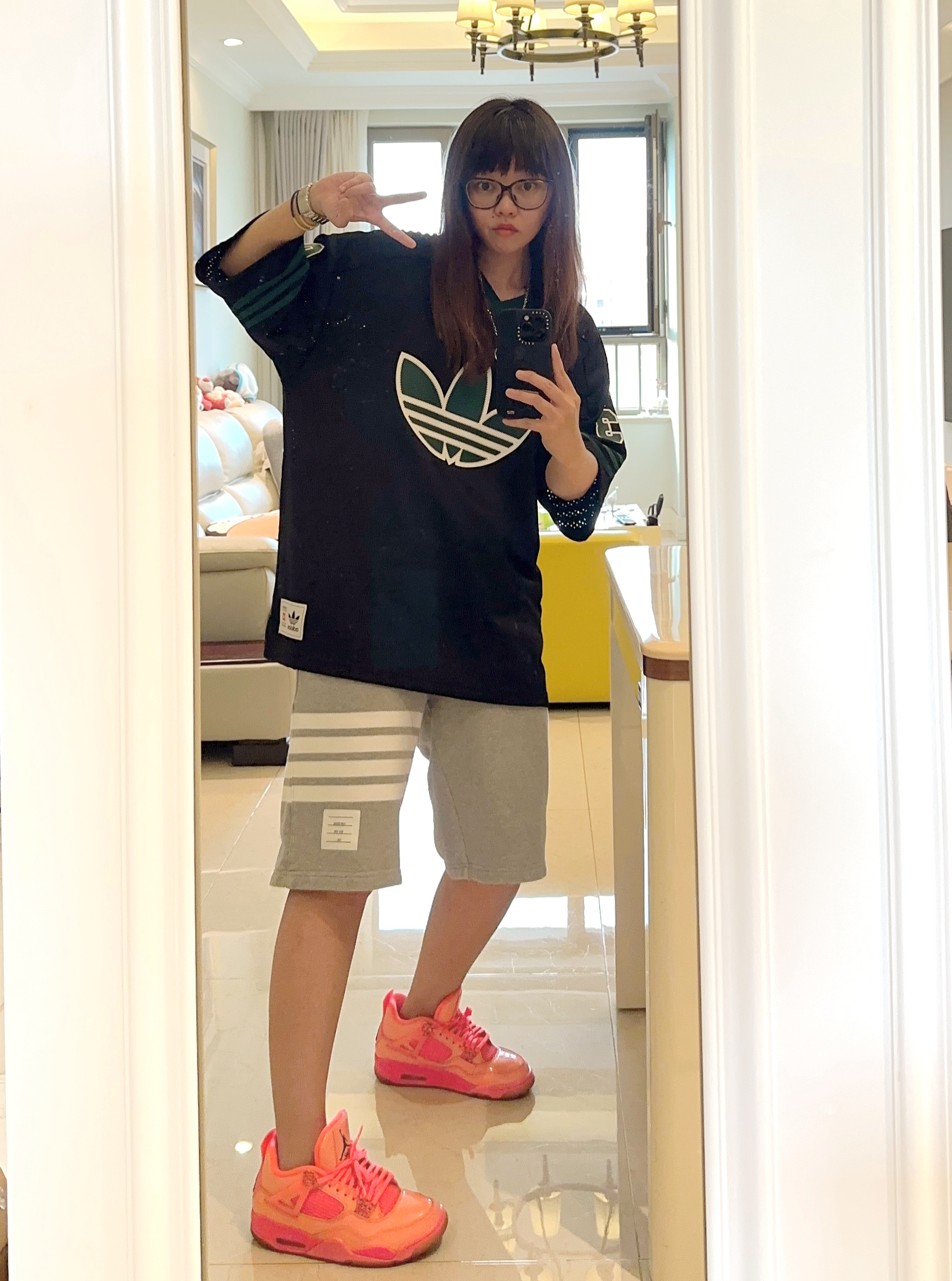 兄弟们,我新买的三叶草球衣连穿三天了! 身为穿搭博主, 对于一件衣服连续穿三天是不正常的。 可是这件衣服太好看了……穿上就不想换的那种 所以只能在🩳和👟上下功夫了 今天搭配的是灰色的针织🩳和镭射aj4 衣服上的绿色logo和粉色的球鞋一碰撞 果然很扎眼! 这一身你们get到了吗?