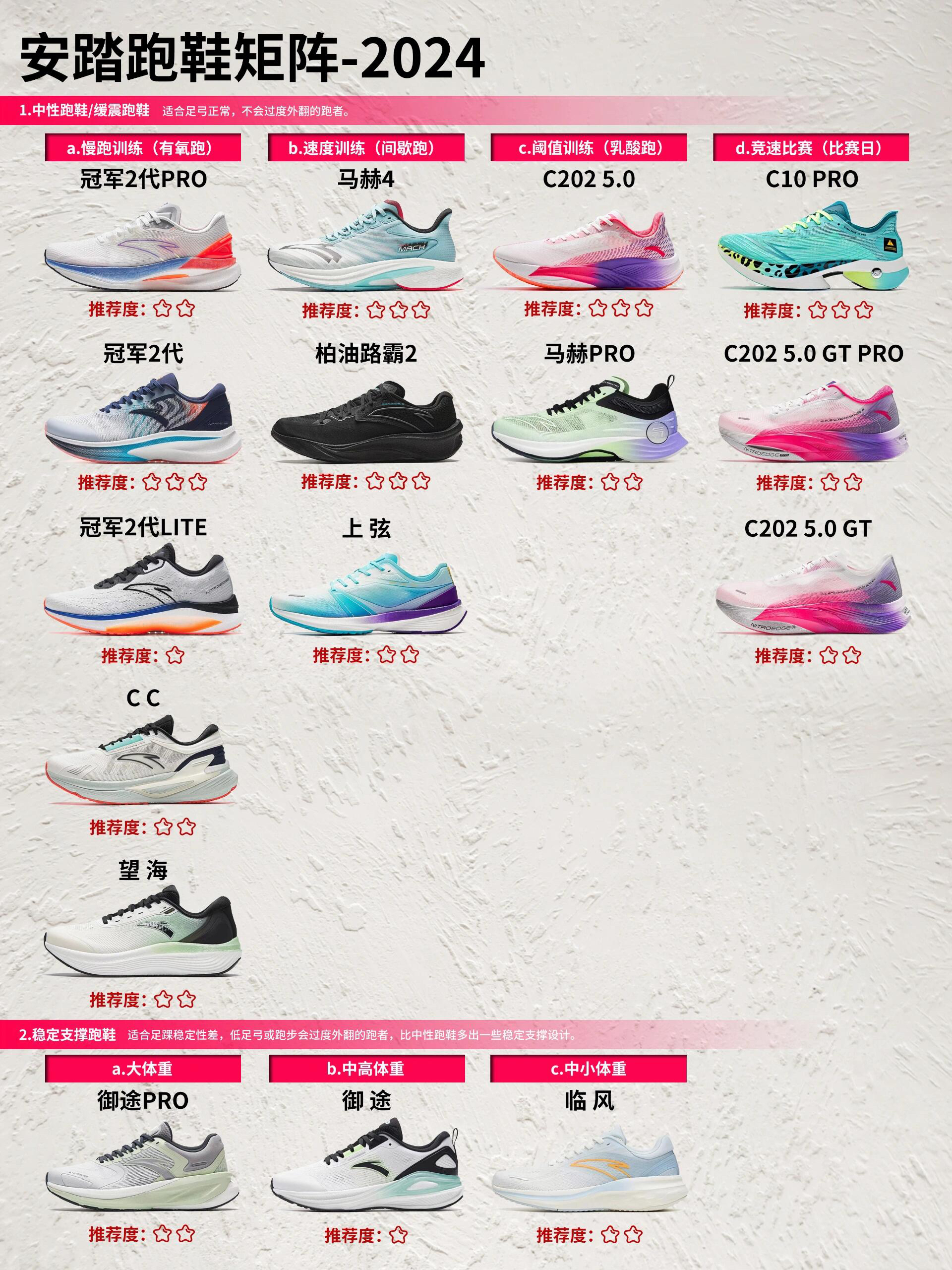 2024,在新的一年里,我决定把跑鞋矩阵更新的第一位留给变化最大也是最令人惊喜的国产品牌——安踏! 之前提到过,安踏在专业跑步领域,一直不温不火,不像李宁和特步那样,有非常清晰的跑鞋矩阵。 但2023年的年末,安踏一改产品线混乱,竞速鞋拉胯,产品功能重叠等问题。重新梳理了一下自己的产品线,查漏补缺,建立了一个完整清晰的矩阵! 📣今天梳理一下全新的安踏跑鞋矩阵,希望能够帮助大家更快的找到自己心仪的...