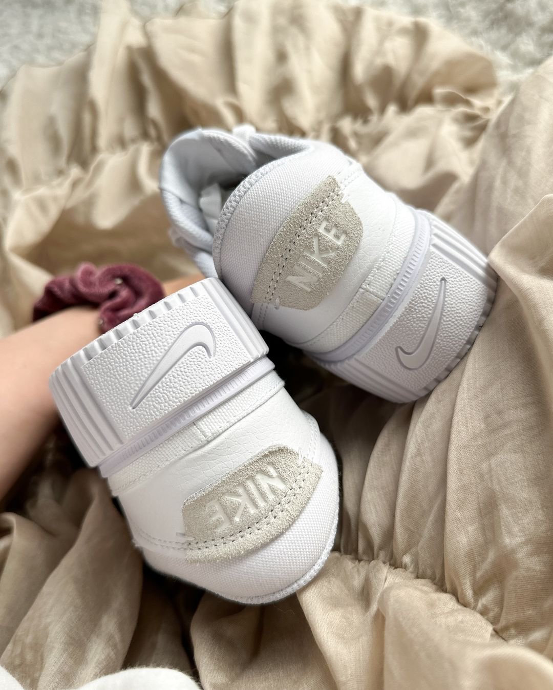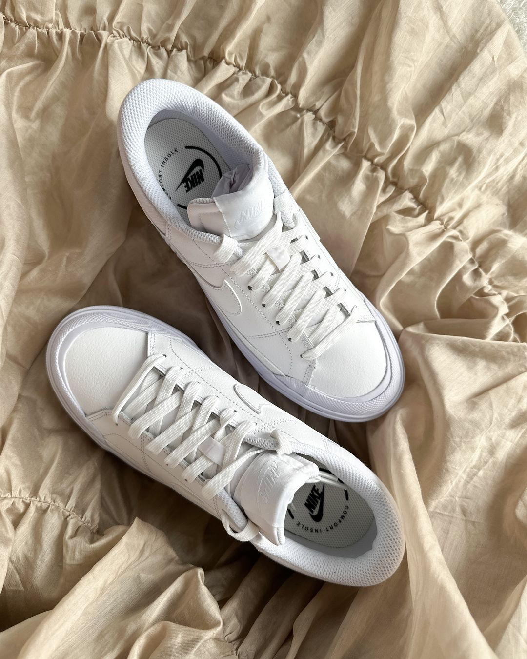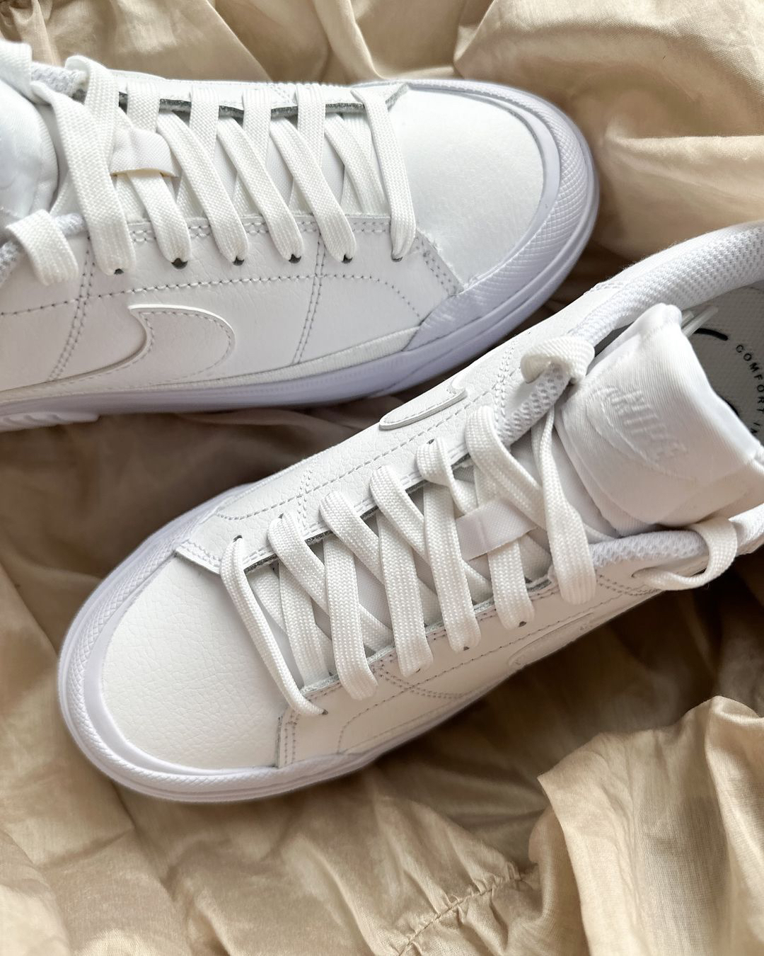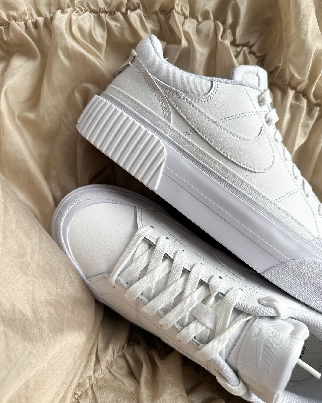 适合日常通勤的耐克小白鞋 鞋子整体是全白配色唯独后跟是灰色标志设计 鞋身主要是皮革材质日常打理也比较方便 夏日搭配短裙长裙会比较好看一点 板鞋的唯一的缺点就是脚感偏硬一些 穿着久了以后会慢慢改善 这款有高低帮两款,低帮也不错哦