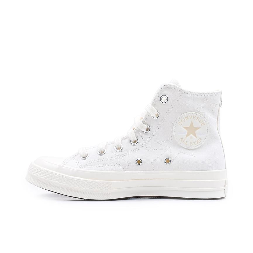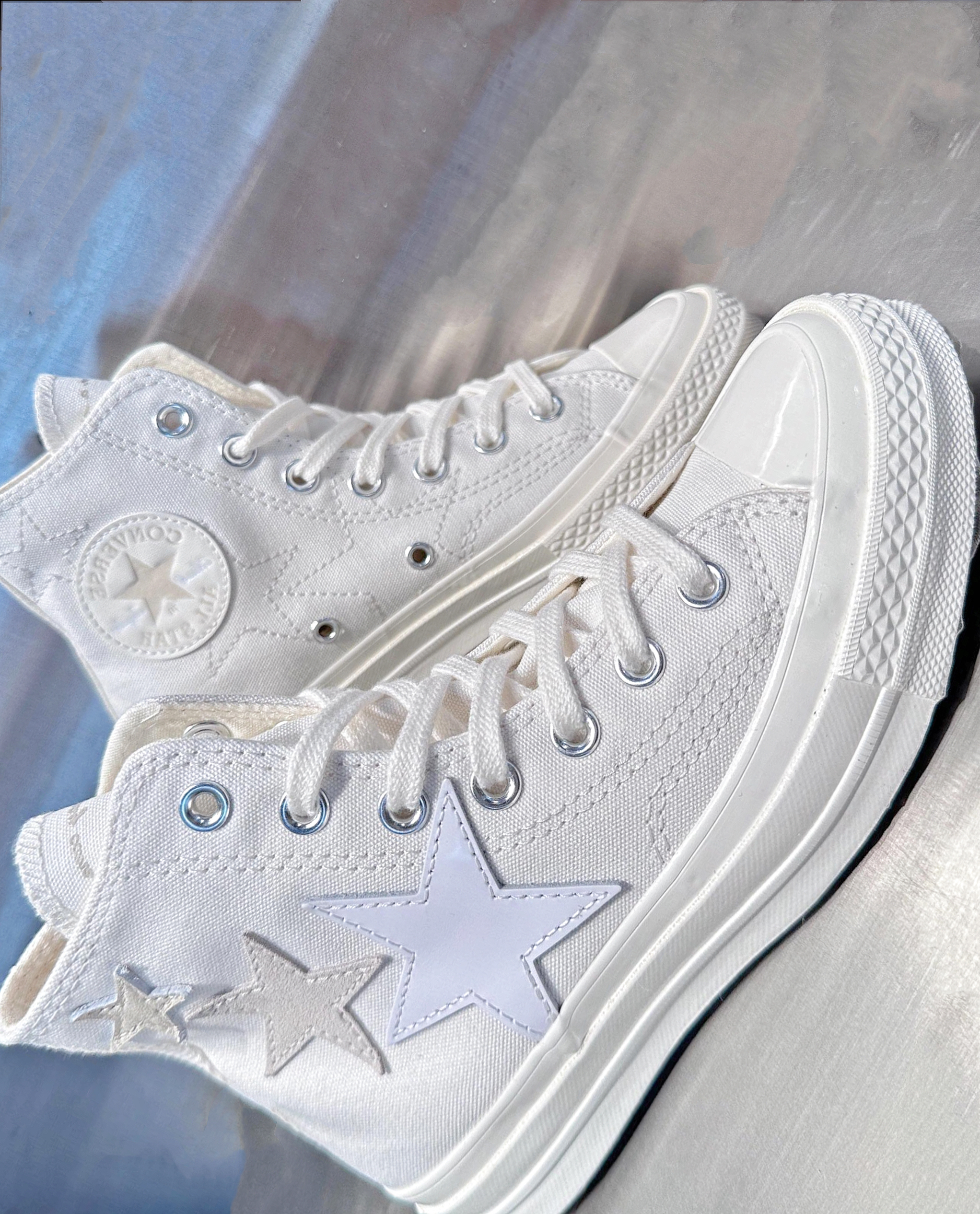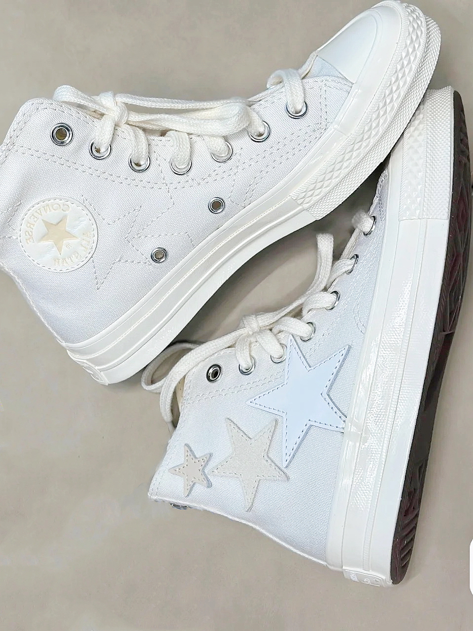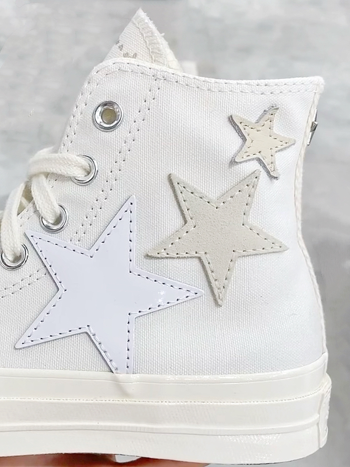哇!匡威1970新品好好看。 后跟还有个金属星星扣耶⭐️ 侧面不同材质的小星星, 可可爱爱又质感满满。 橡胶大底防滑耐磨,脚感舒适~ 搭配裙子就是温柔大美女😘