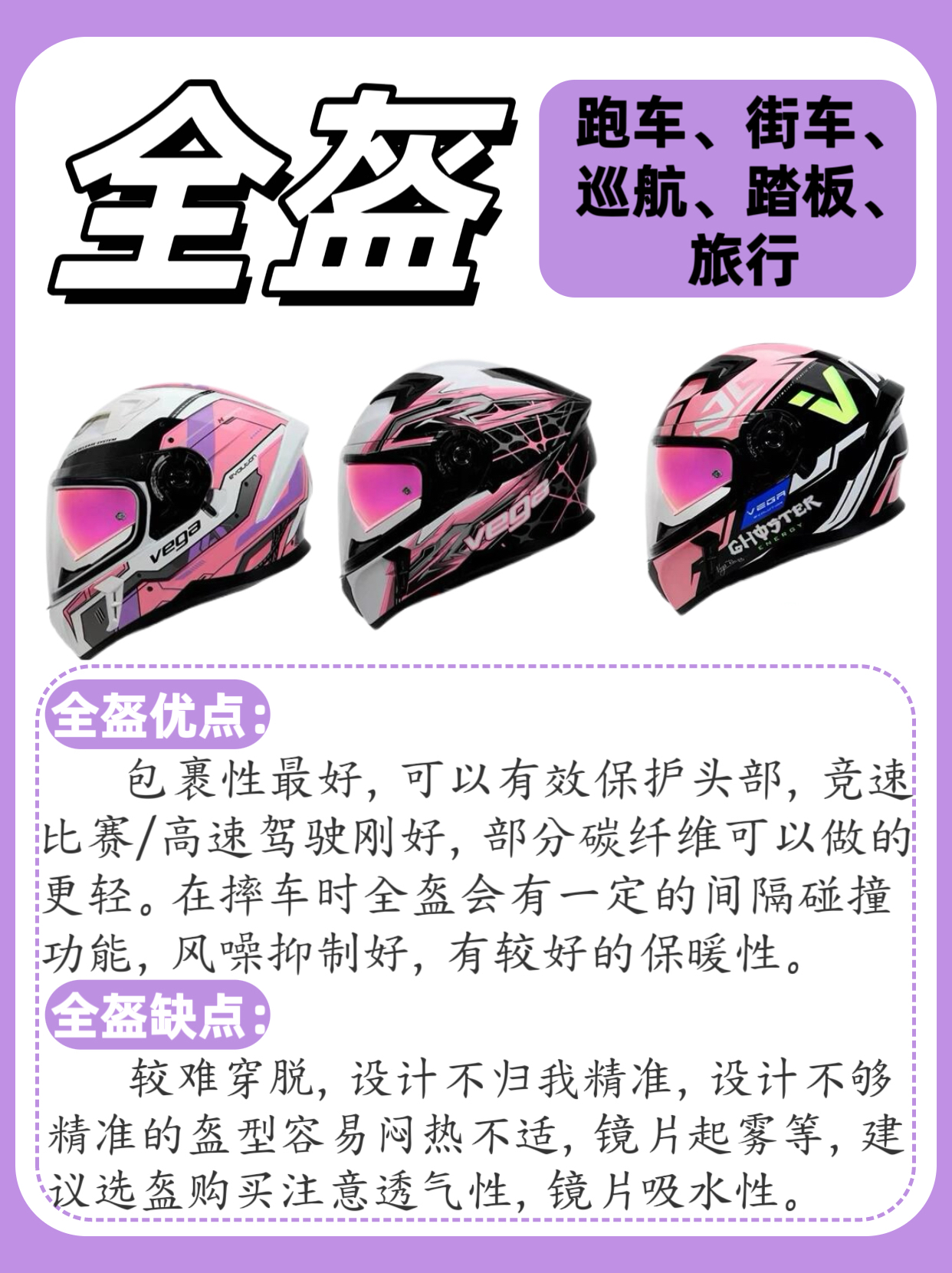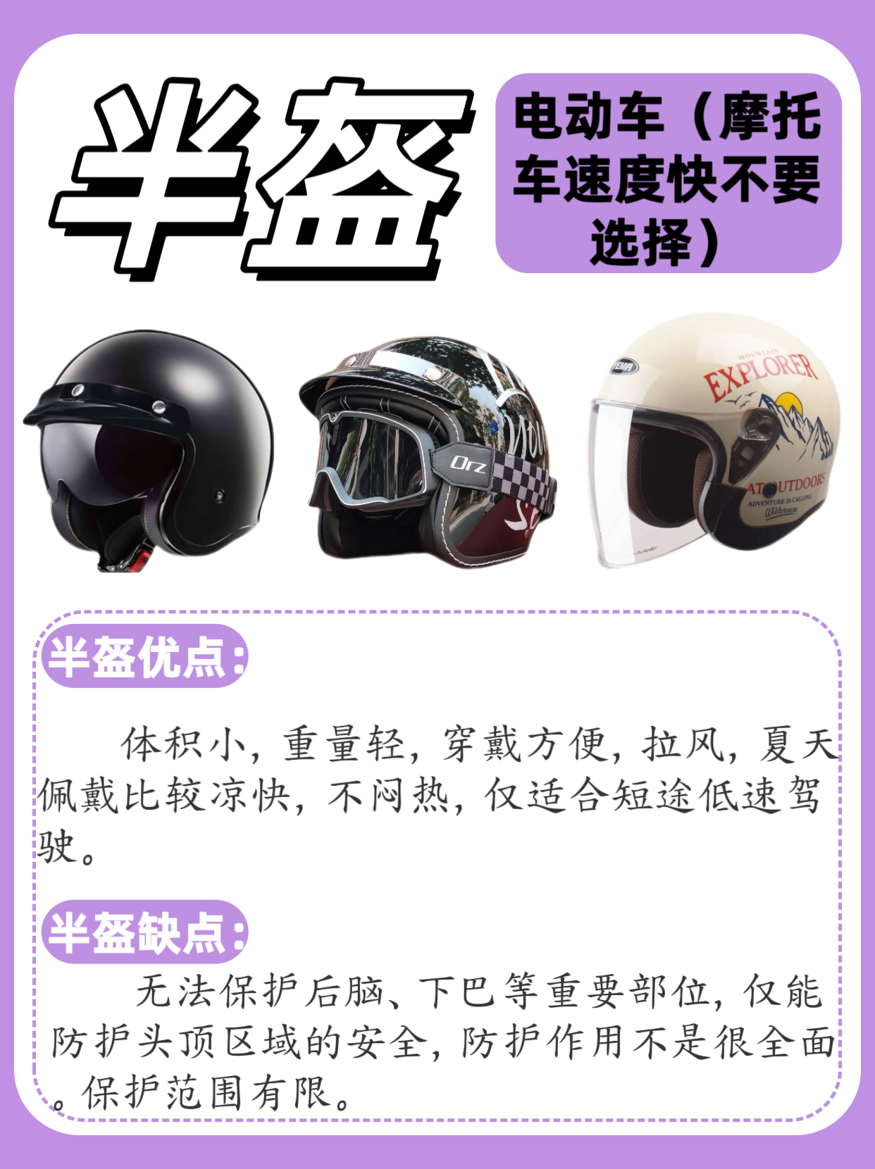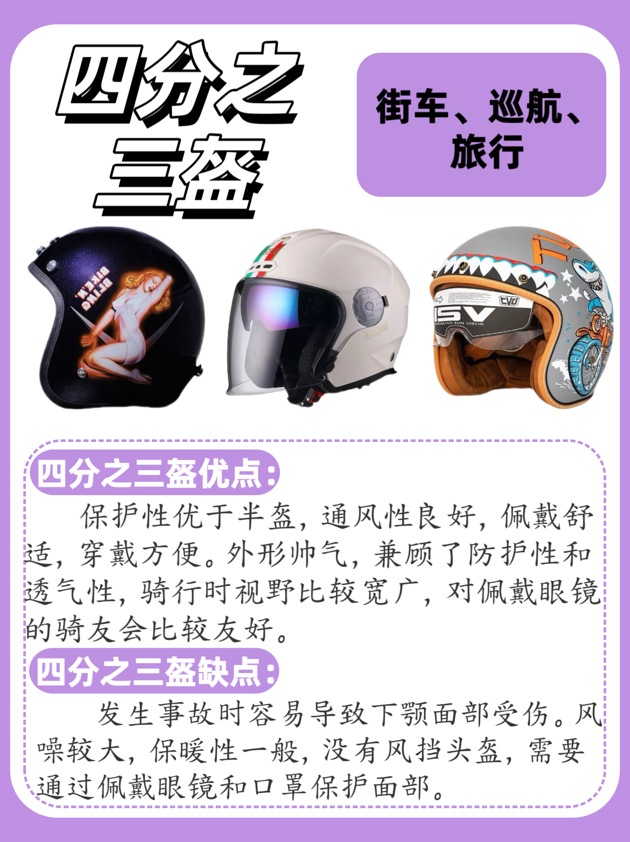 1️⃣全盔 包裹性最好,可以有效保护头部,竞速比赛/高速驾驶刚好,部分碳纤维可以做的更轻。在摔车时全盔会有一定的间隔碰撞功能,风噪抑制好,有较好的保暖性。 2️⃣半盔 体积小,重量轻,穿戴方便,拉风,夏天佩 戴比较凉快,不闷热,仅适合短途低速驾驶。 3️⃣四分之三盔 保护性优于半盔,通风性良好,佩戴舒适,穿戴方便。外形帅气,兼顾了防护性和透气性,骑行时视野比较宽广,对佩戴眼镜的骑友会比较友好。...