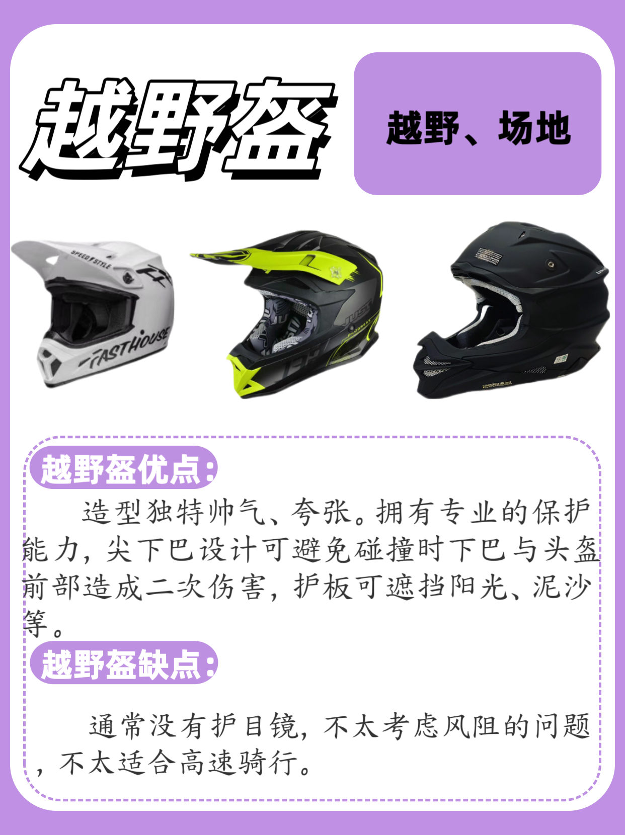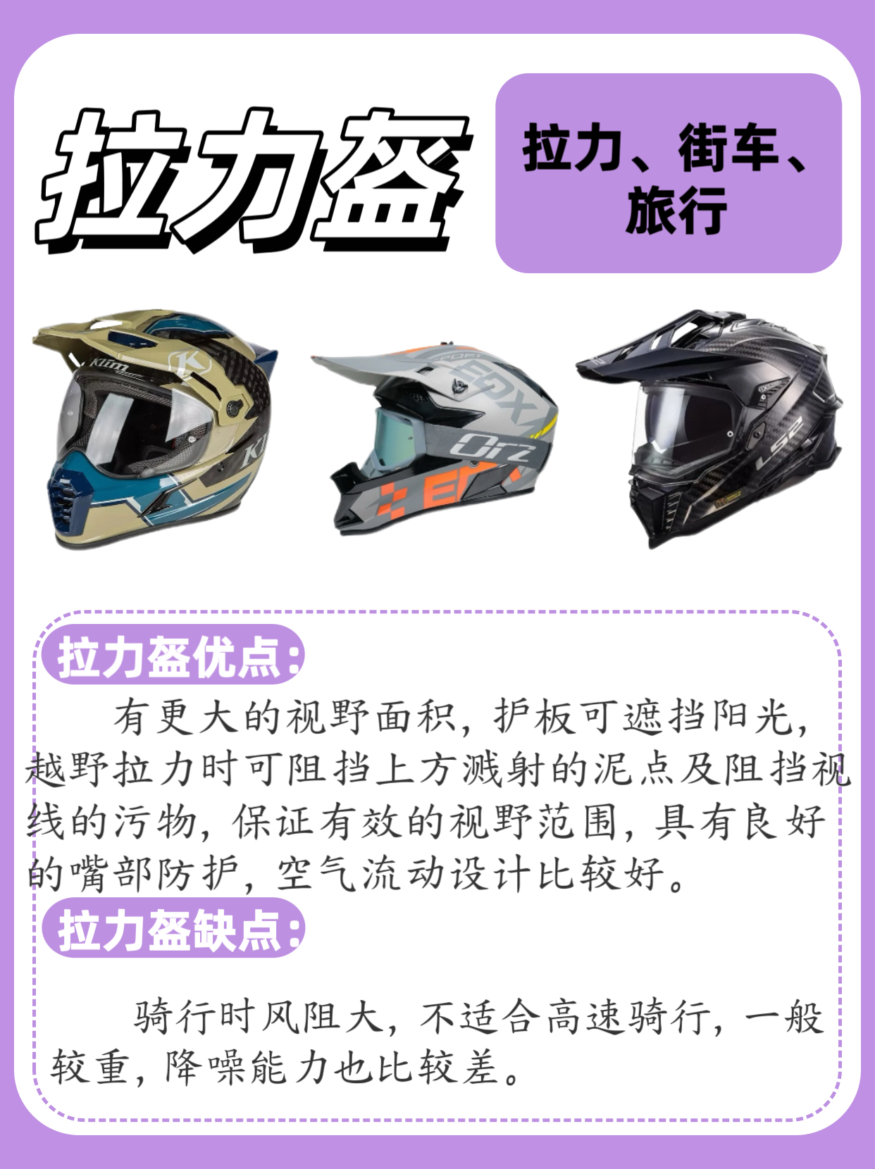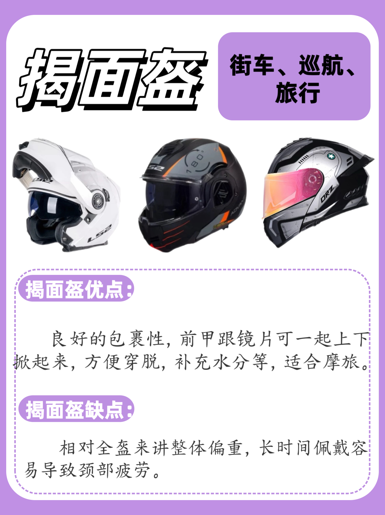 1️⃣全盔 包裹性最好,可以有效保护头部,竞速比赛/高速驾驶刚好,部分碳纤维可以做的更轻。在摔车时全盔会有一定的间隔碰撞功能,风噪抑制好,有较好的保暖性。 2️⃣半盔 体积小,重量轻,穿戴方便,拉风,夏天佩 戴比较凉快,不闷热,仅适合短途低速驾驶。 3️⃣四分之三盔 保护性优于半盔,通风性良好,佩戴舒适,穿戴方便。外形帅气,兼顾了防护性和透气性,骑行时视野比较宽广,对佩戴眼镜的骑友会比较友好。...