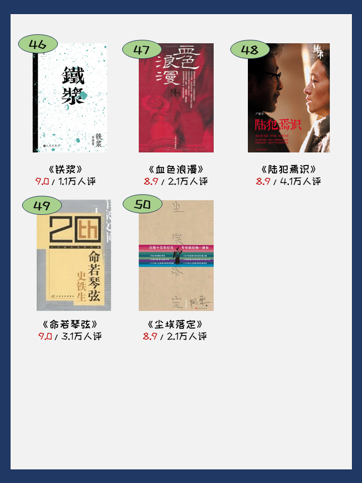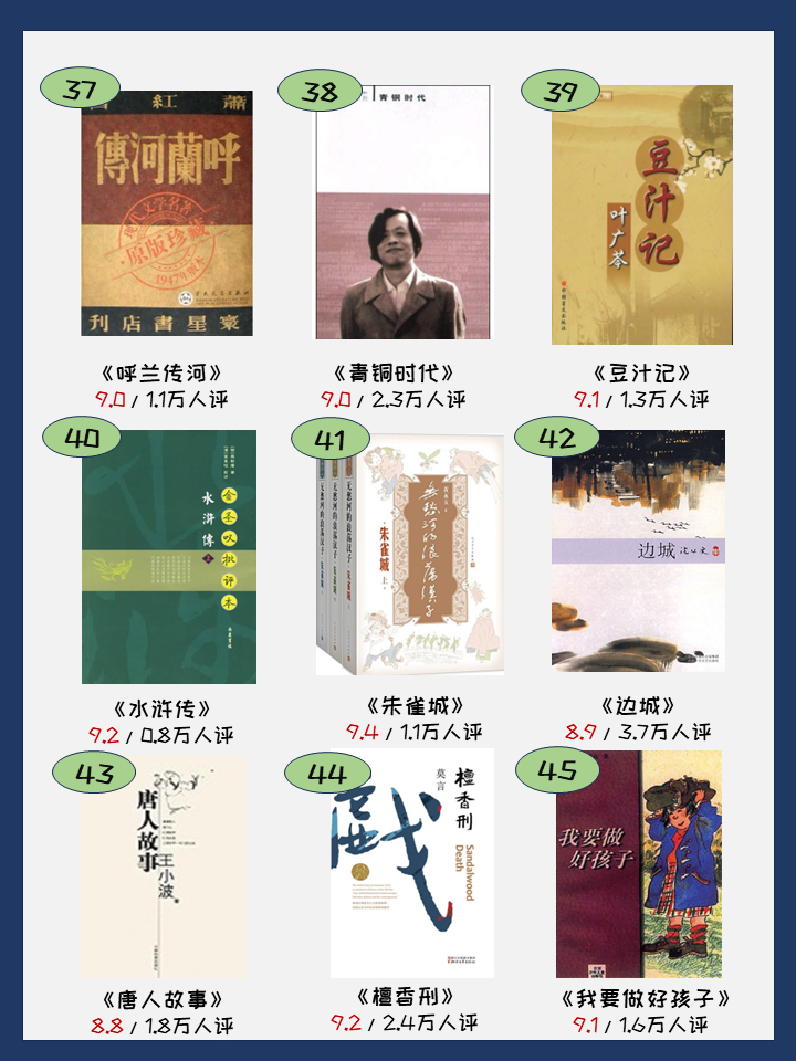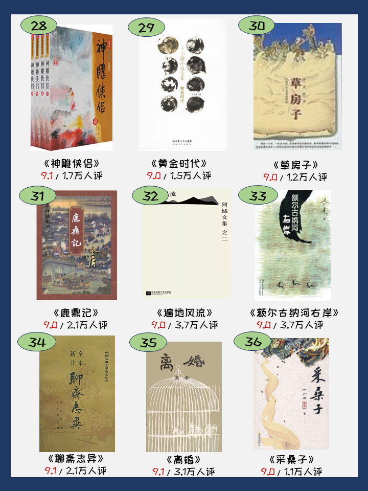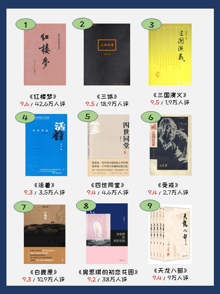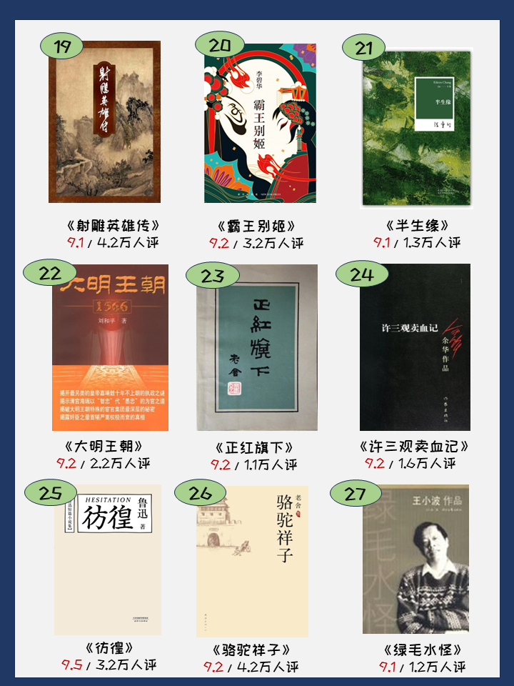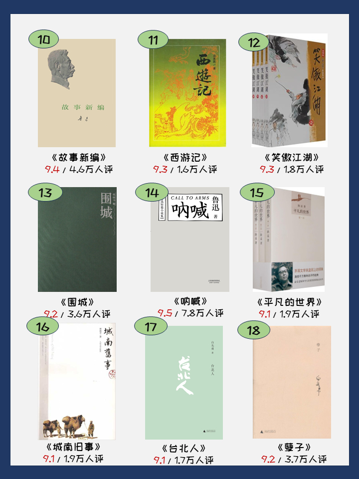 今天就为大家整理了下前50的书单,快来看看都有什么吧!👏 ✅1-10《红楼梦》《三体》《三国演义》《活着》《四世同堂》《受戒》《白鹿原》《房思琪的初恋花园》《天龙八部》《故事新编》 ✅11-20《西游记》《笑傲江湖》《围城》《呐喊》《平凡的世界》《城南旧事》《台北人》《孽子》《射雕英雄传》《霸王别姬》 ✅21-30《半生缘》《大明王朝》《正红旗下》《许三观卖血记》 《彷徨》《骆驼祥子》《绿毛水怪》...