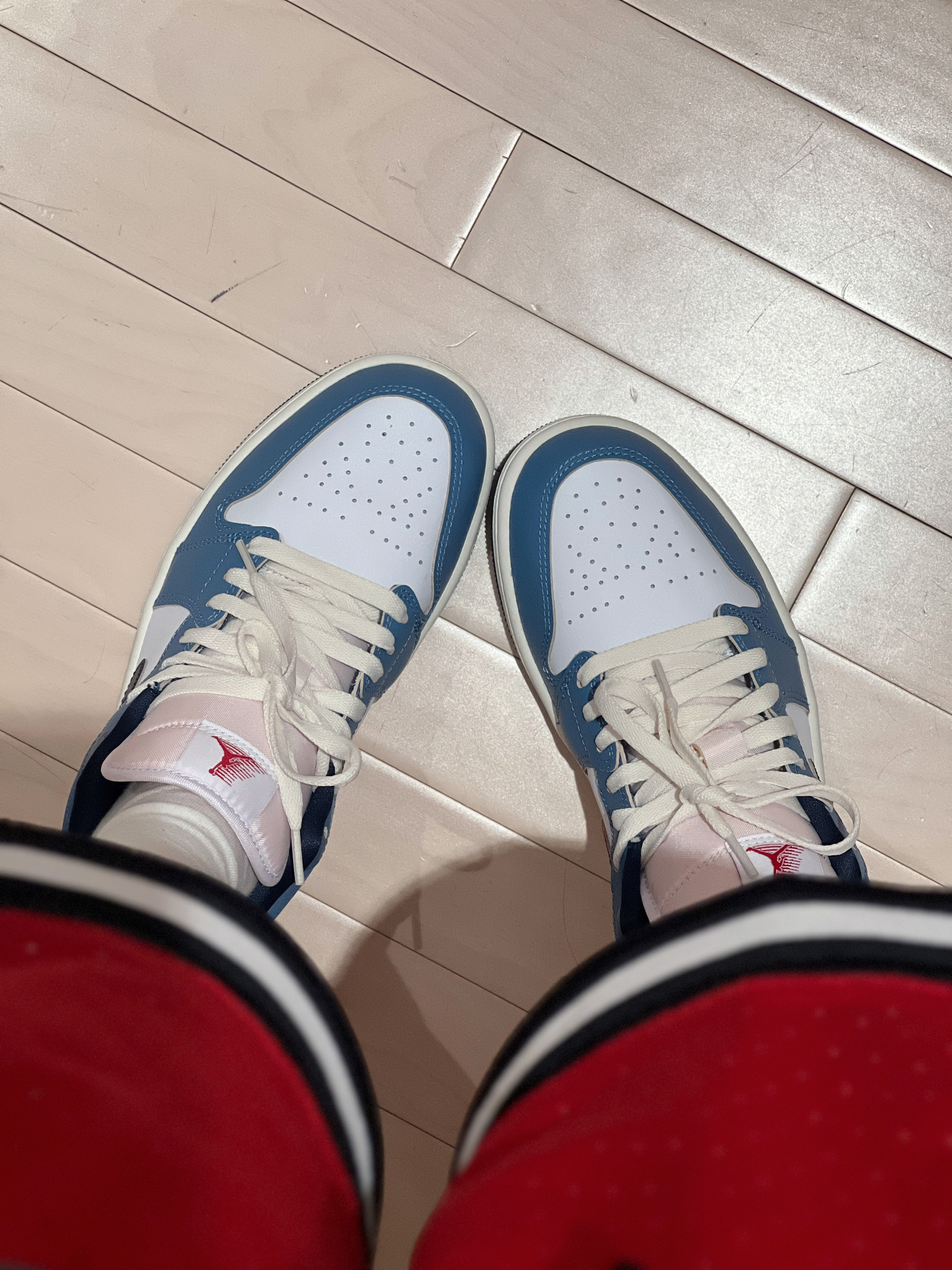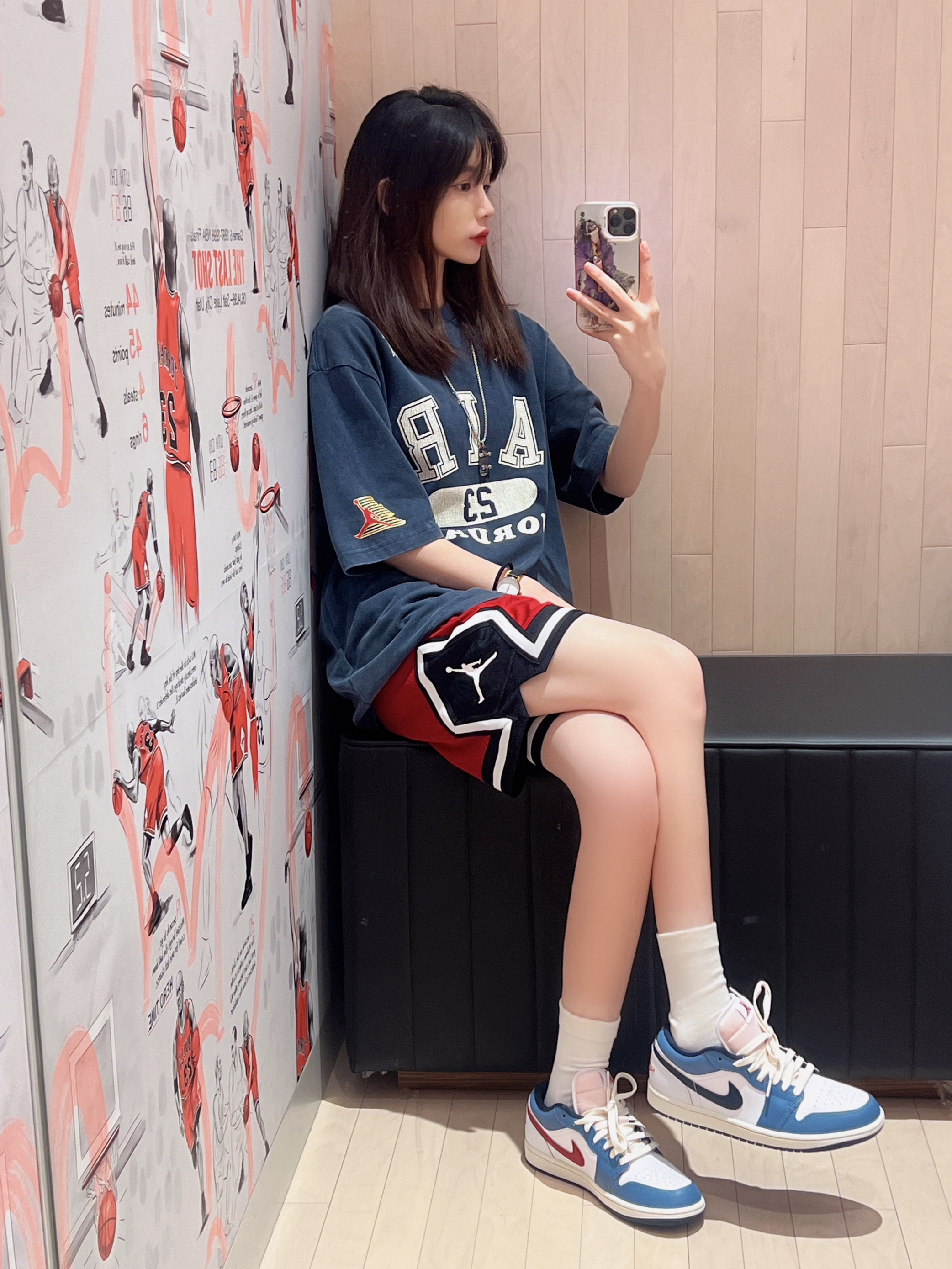 今日穿搭蓝色宽松T恤➕红色裤子真显白 球裤yyds👍 真的好看呢 嘎嘎透气 搭配AJ1低帮鸳鸯🪝很nice 以蓝红白💙♥️🤍为主色调 清新又复古的风格 值得推荐配色搭配牛仔休闲裤都很不错😌